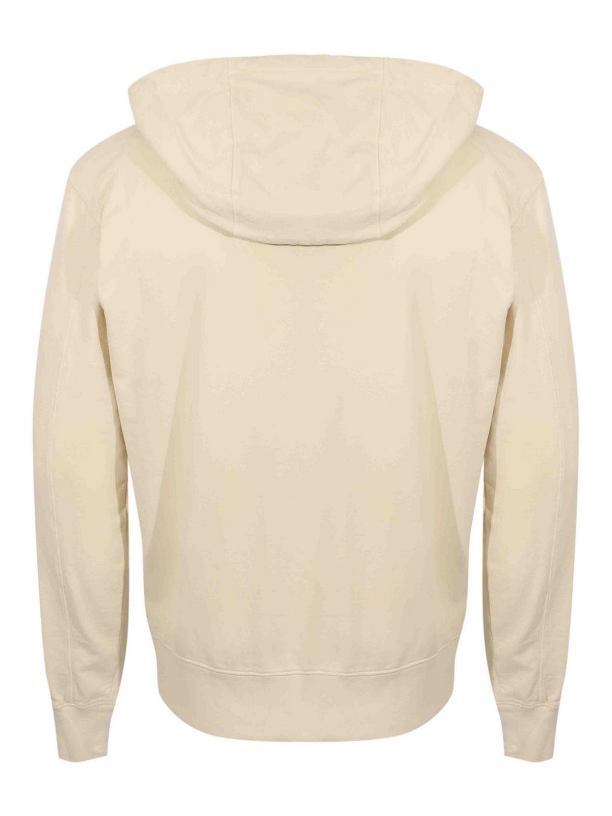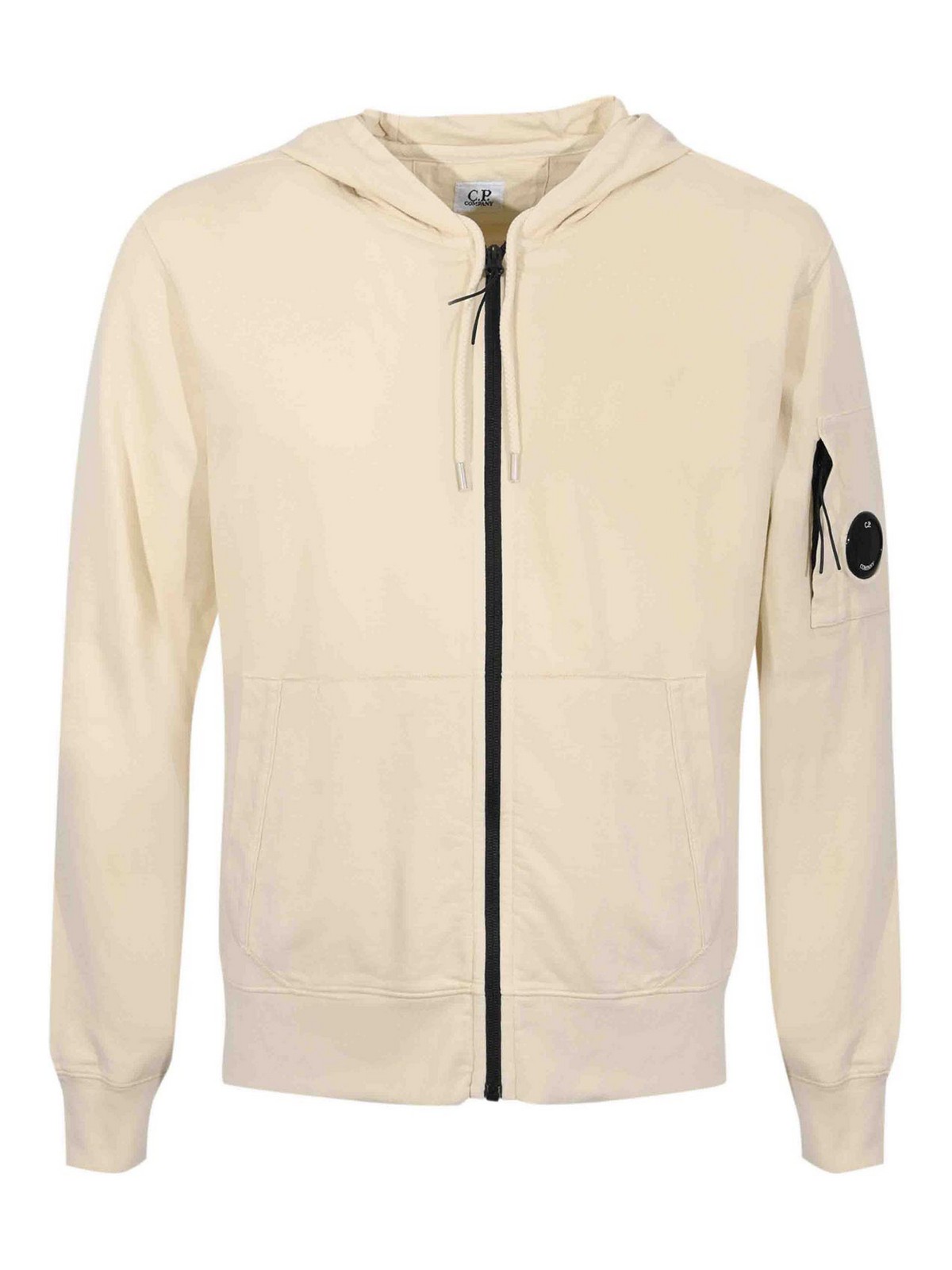 男性用軽量コットンフリーススウェットシャツ、C.P. 社、生地:ライトコットンフリース、パターン:無地、袖:伸縮性のある袖口付きロング、襟:調節可能なフード付き、クロージャー:フロントファスナー:フロントファスナー、ポケット:フロントカンガルーポケット2つ、ディテール:アイコニックなレンズを袖に施したもの、フードにドローストリング、コントラストのあるジッパー、裏地:いいえ、フィット:レギュラー