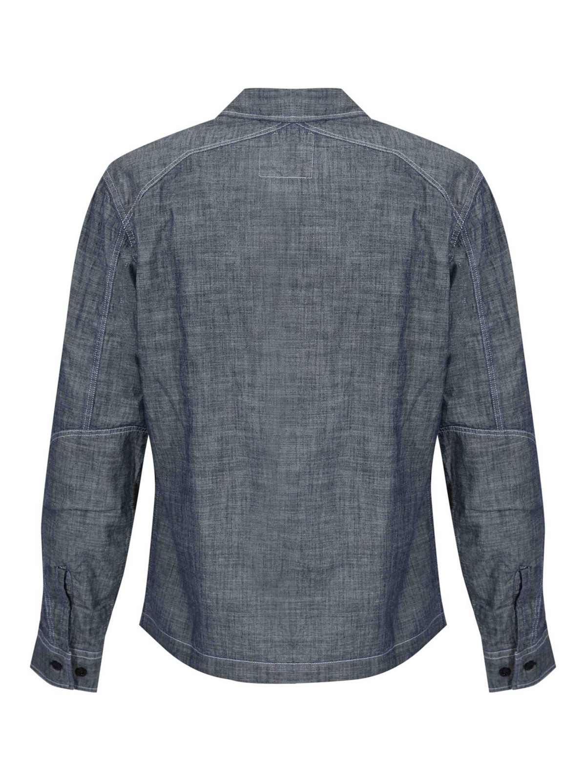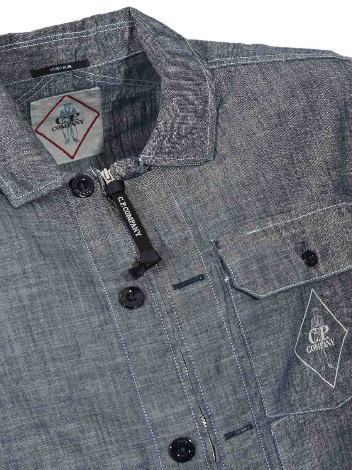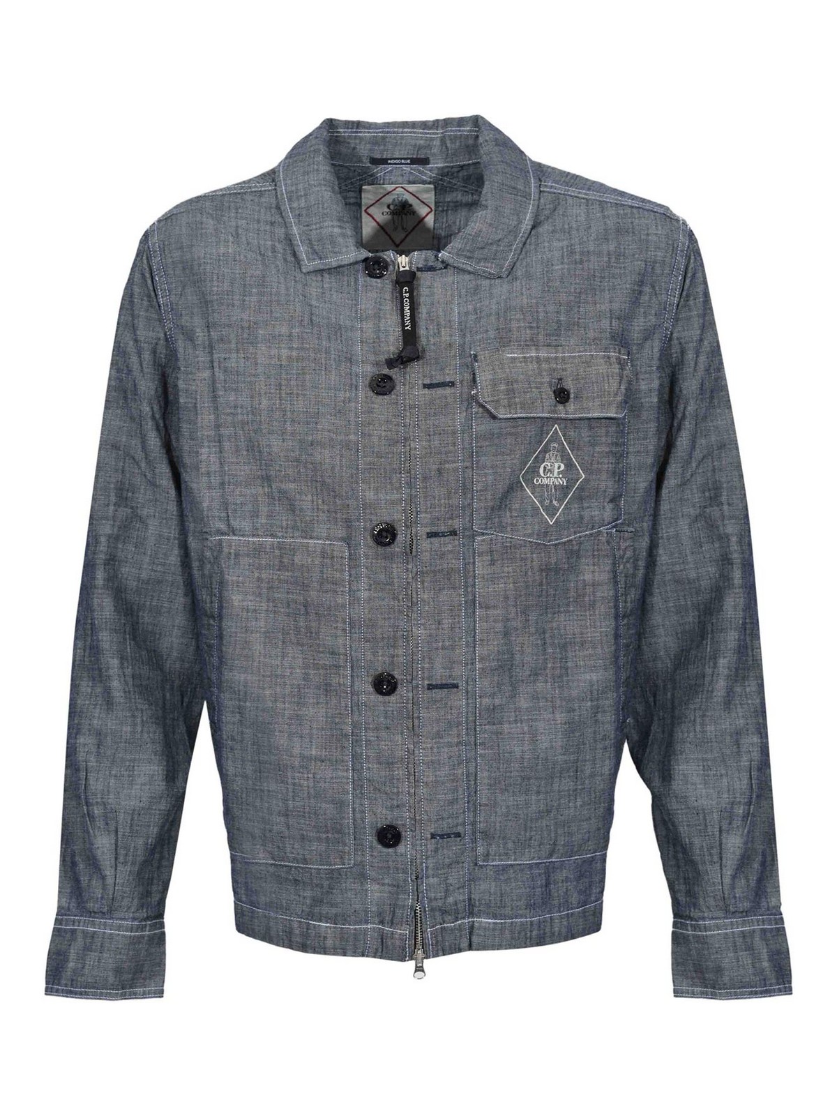 メンズコットンシャンブレーシャツ、C.P. 社、生地:コットンシャンブレー、パターン:ソリッドカラーデニムエフェクト、袖:調節可能なカフス付きロング、襟:クラシック、クロージャー:内側にジッパー付きのフロントボタン、ポケット:胸にパッチポケット2つ、1つはフラップとボタン付き、詳細:胸にロゴプリント、コントラストステッチ、ロゴ入りジッパープーラー、裏地:いいえ、フィット:レギュラー