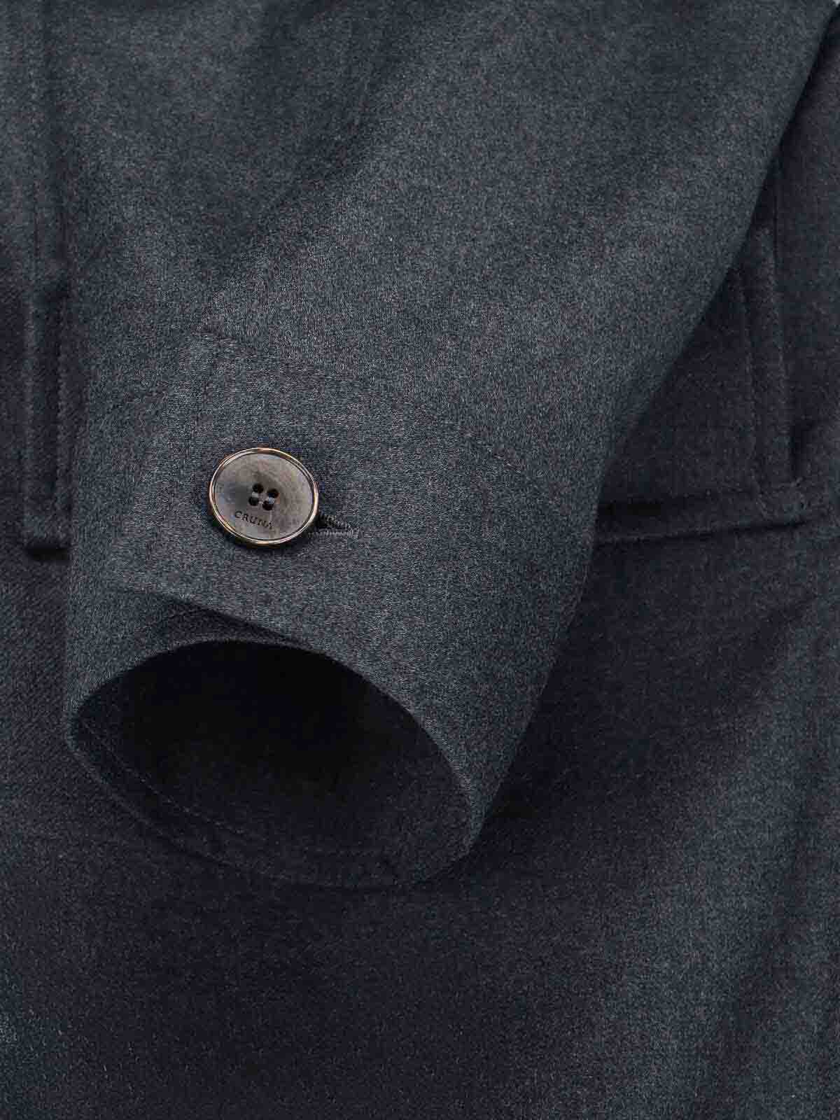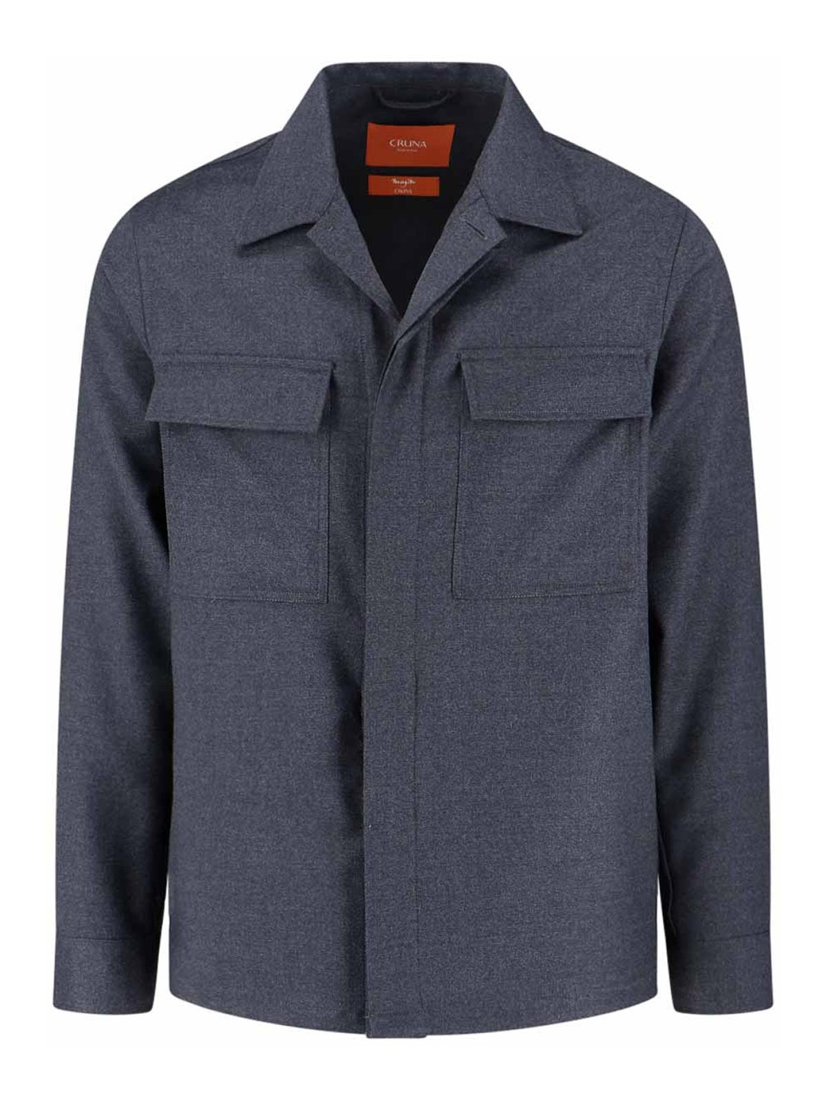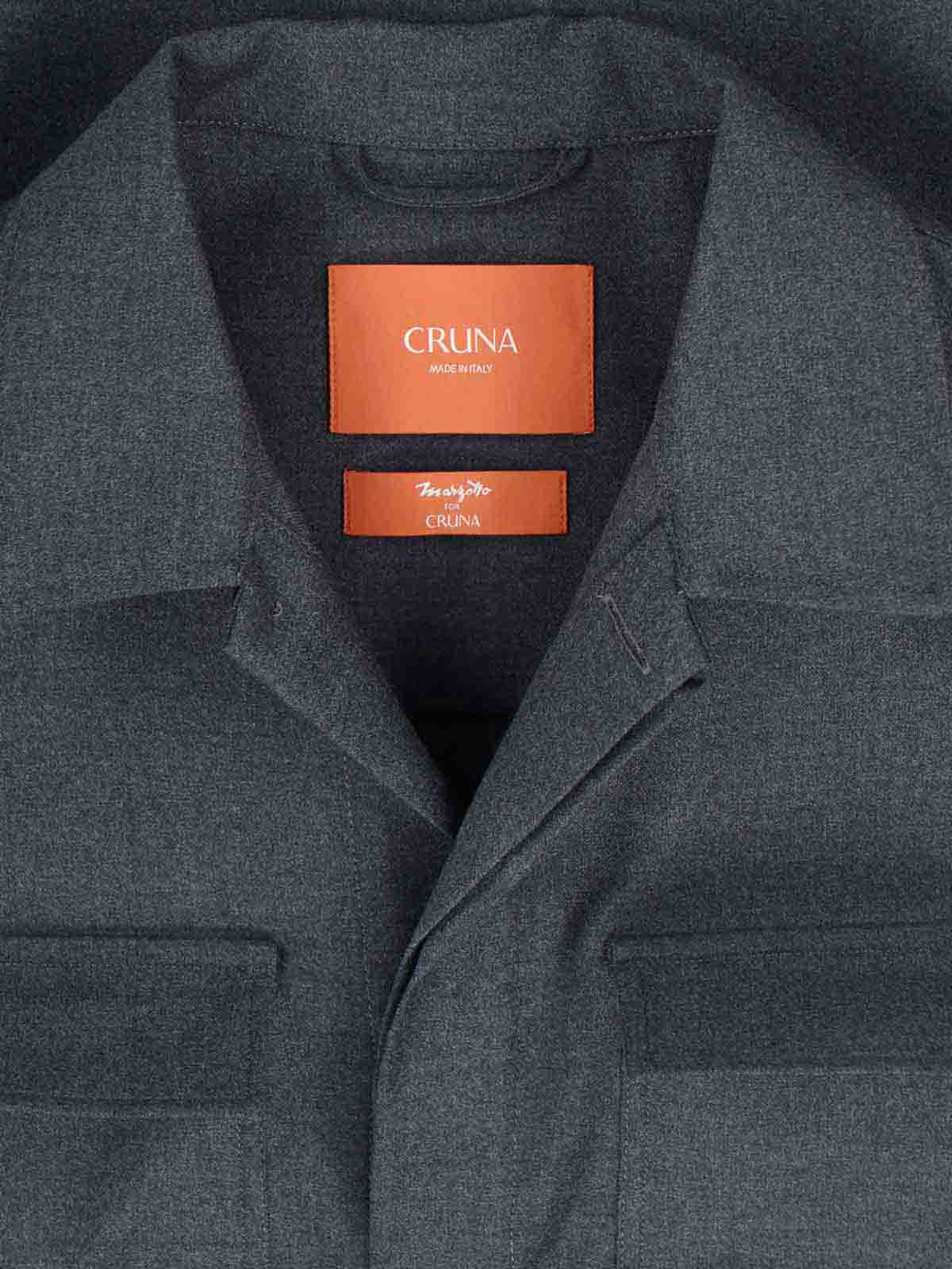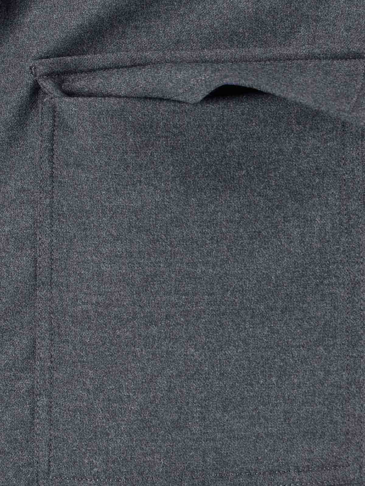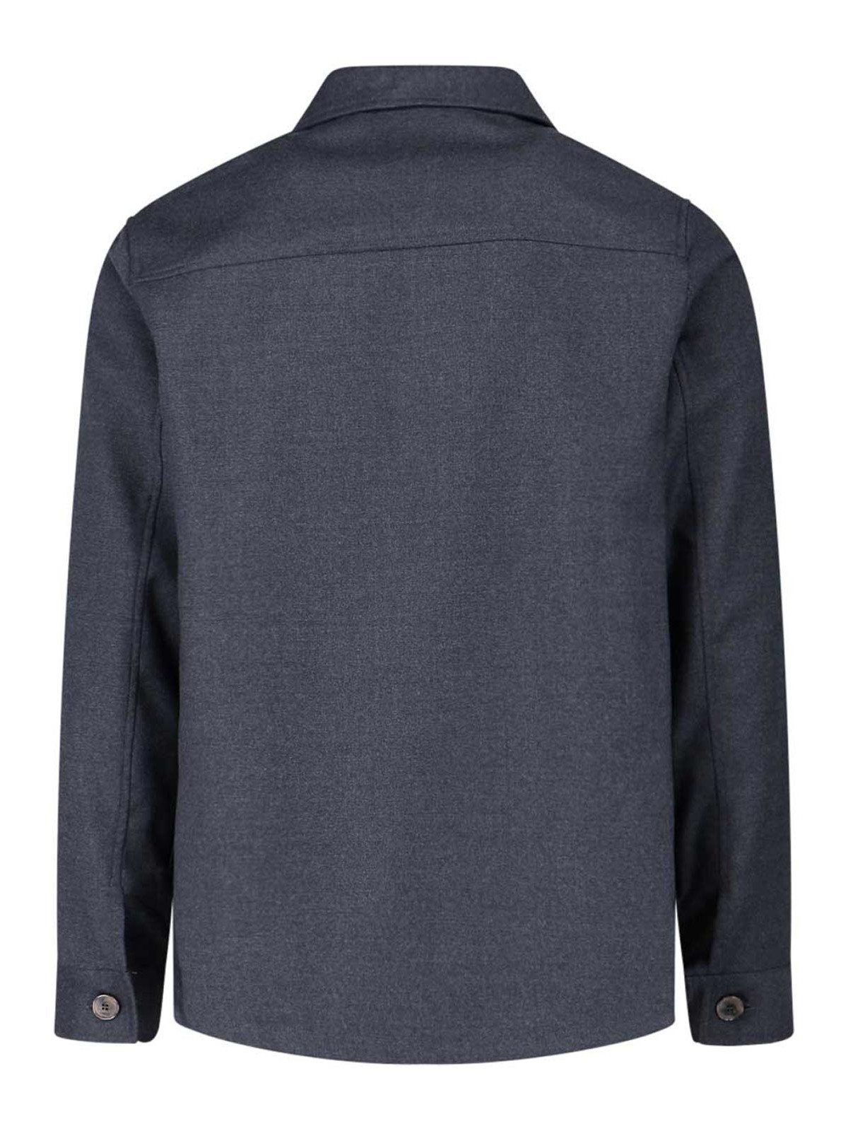 生バージンウールのシャツ、グレー、クラシックカラー、ボタン留め、胸ポケット2つ、ボタン付きカフス、ストレートヘム。