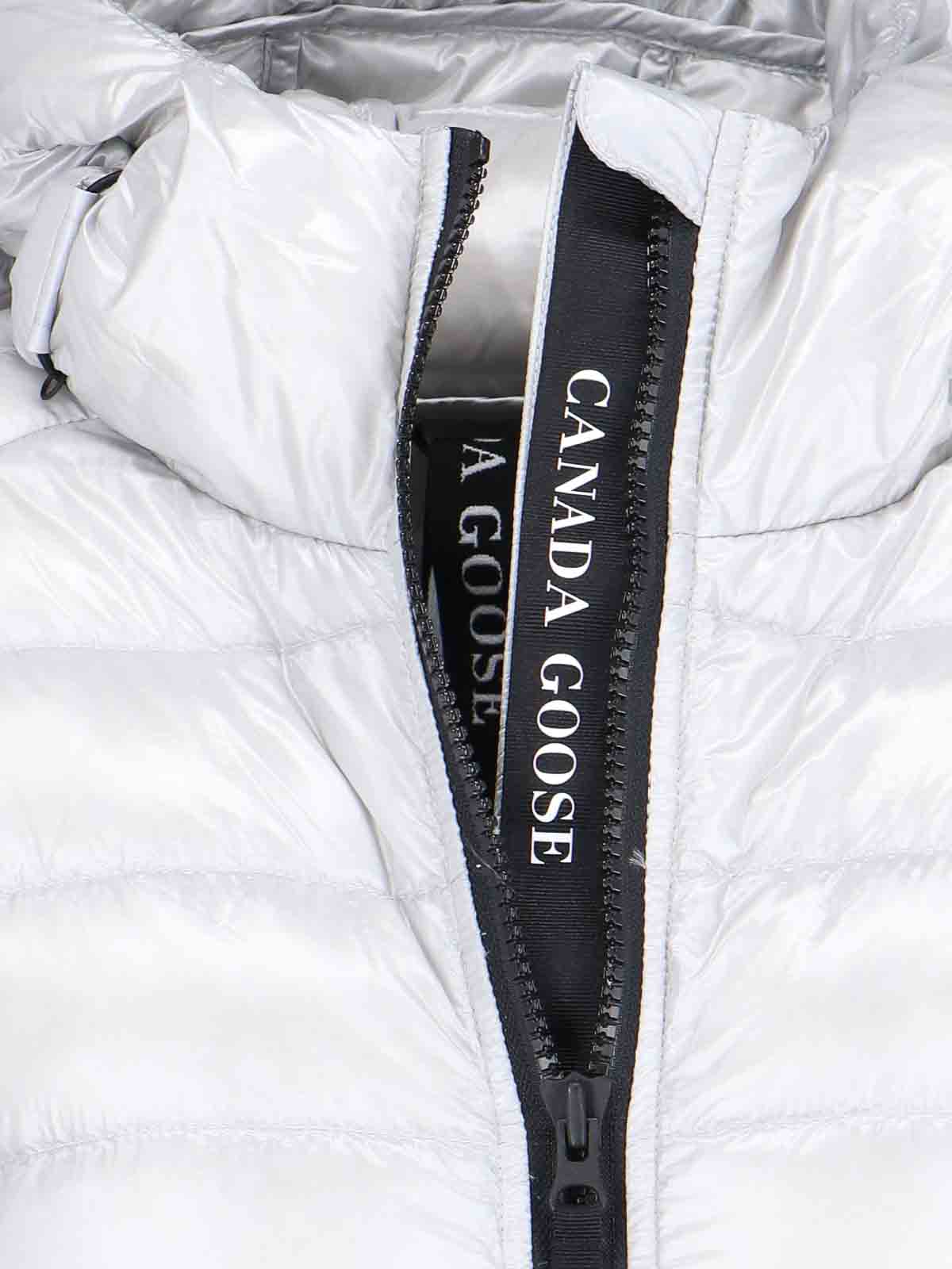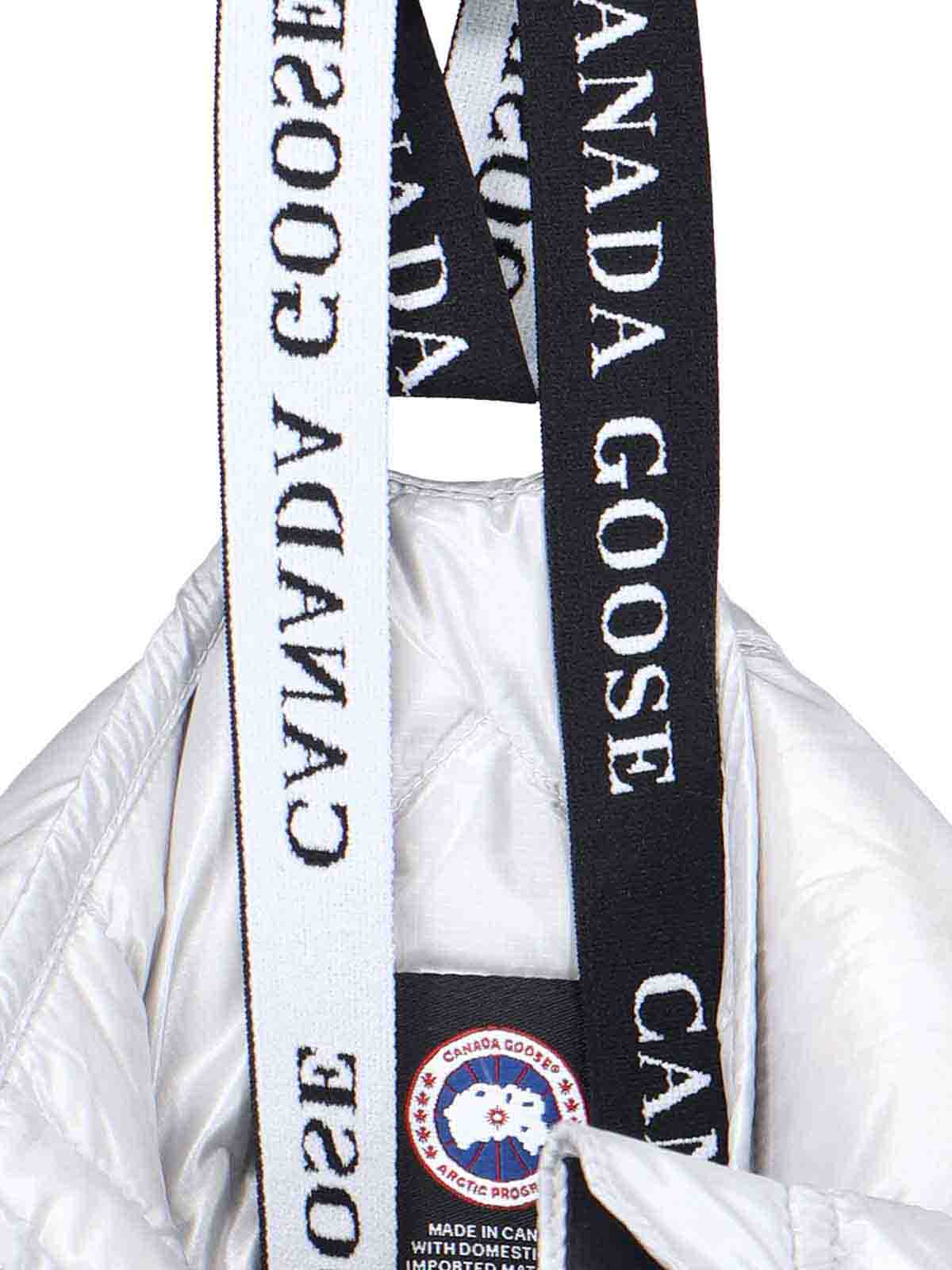 ロングサイプレス Canada Goose シルバーキルトダウンジャケット、ハイカラー、ドローストリングジッパー、ポケット2つ、サイドジッパー、調節可能なサイドパネル、ボタン、ロゴパッチ、調節可能なバックベンツ、ボタン、内部ショルダーストラップ、ストレートヘム
