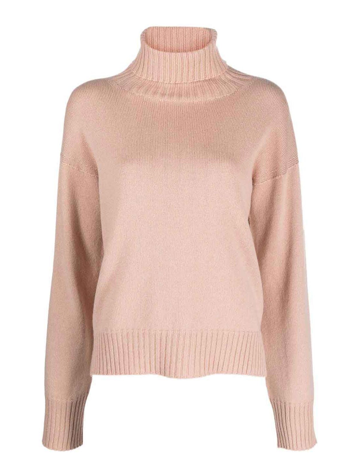 Dエクステリアのピーチオレンジのロールネックニットジャンパー。ウール混紡ニット構造、ロールネック、長袖、リブ編みの袖口、標準サイズの裾が特徴です。