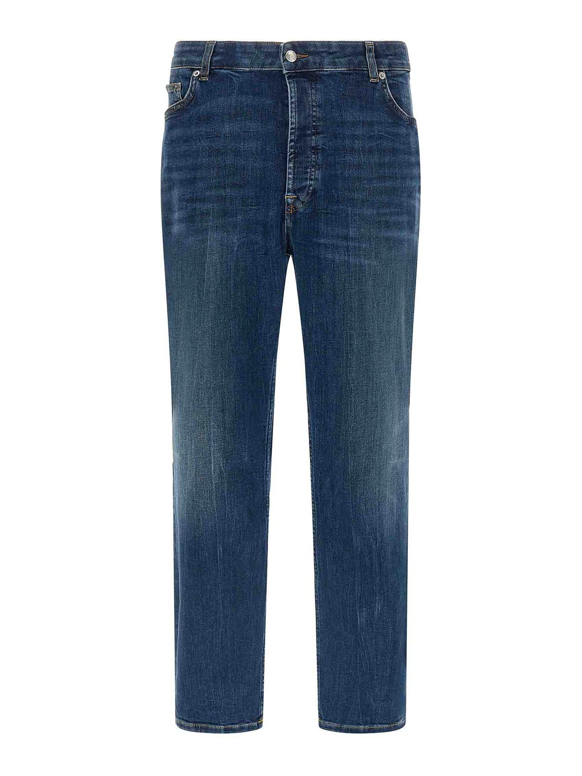 Drake' ストーンウォッシュ加工ストレッチコットンデニムジーンズ、コントラストステッチ、クロップパターン、ミッドウエスト、フロントボタン留め、ポケット5つ、バックロゴタグ付き。