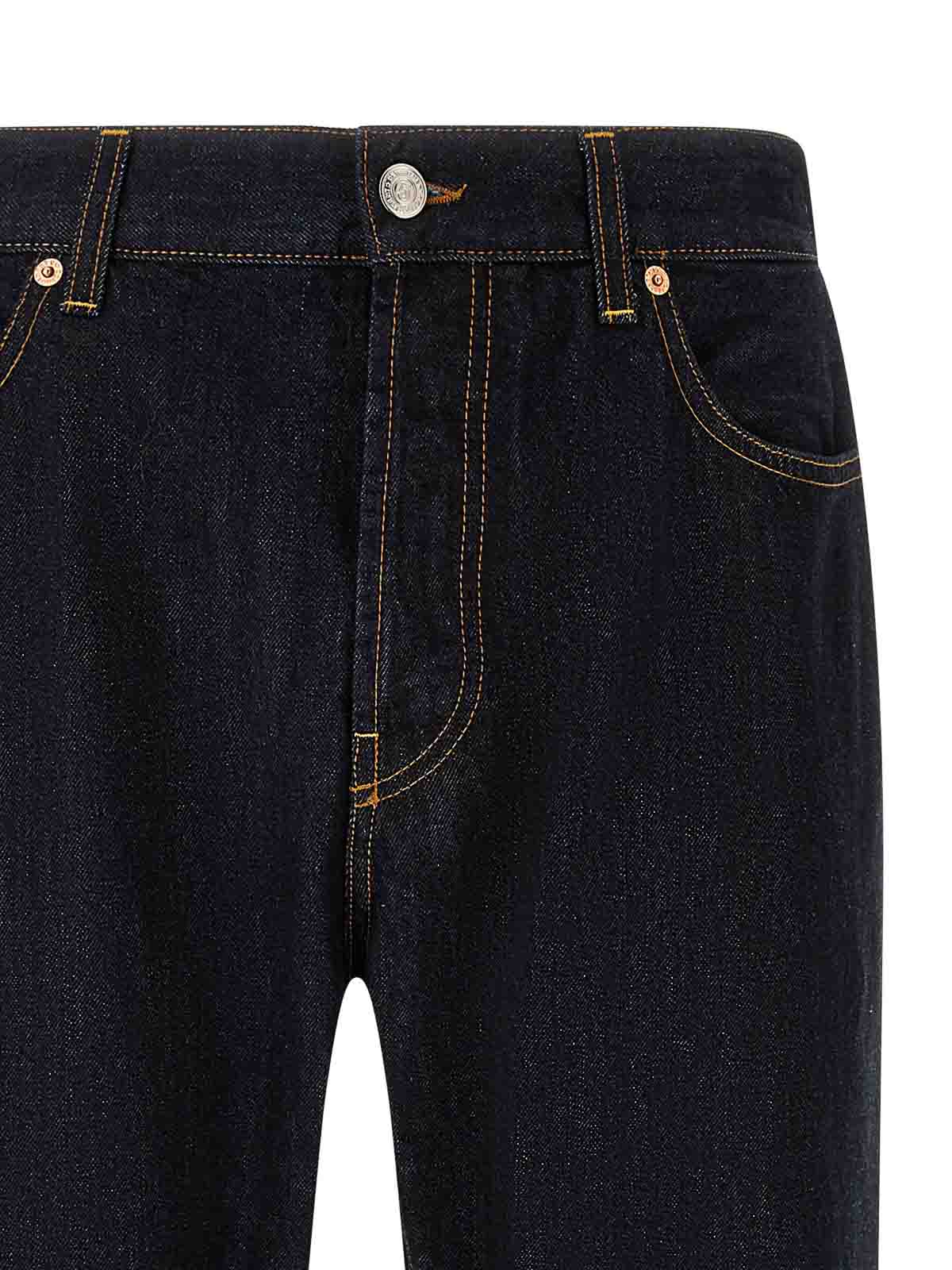 13 1/4オンスノンストレッチコットンデニム「ボウル」ジーンズ、コントラストステッチ、ワイドストレートレッグ、ミディアムウエスト、フロントボタンクロージャー、ポケット5つ、バックロゴタグ。