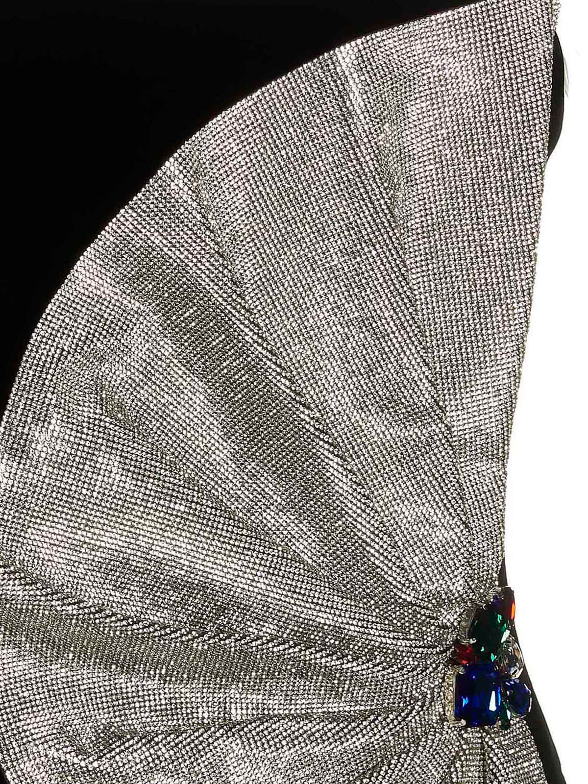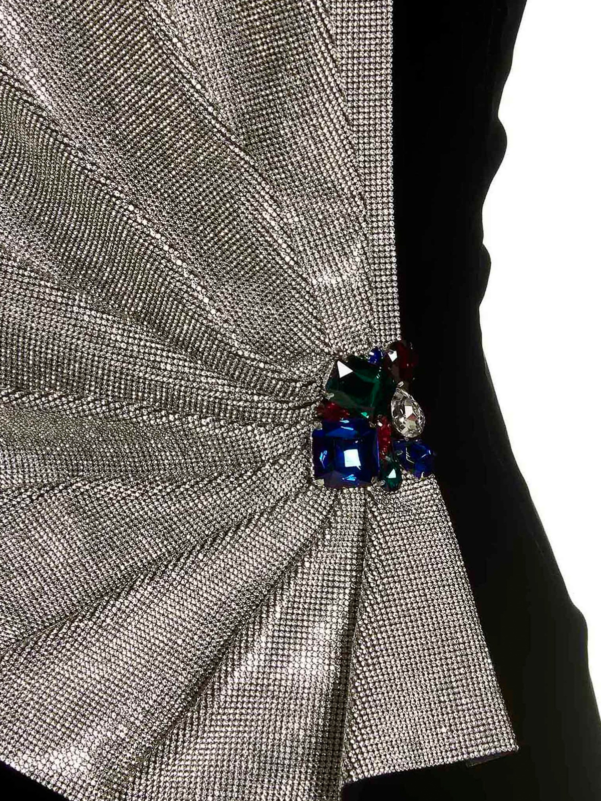 フロントにマキシジュエルディテールとバックファスナーが付いたオフショルダーのベルベットドレス。