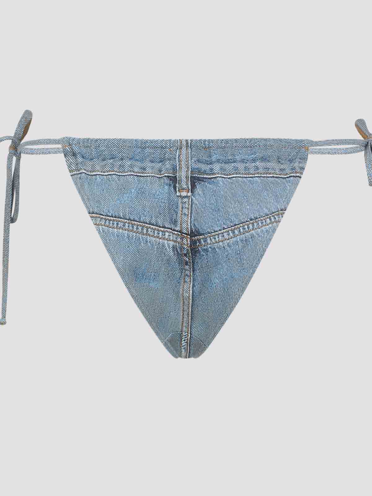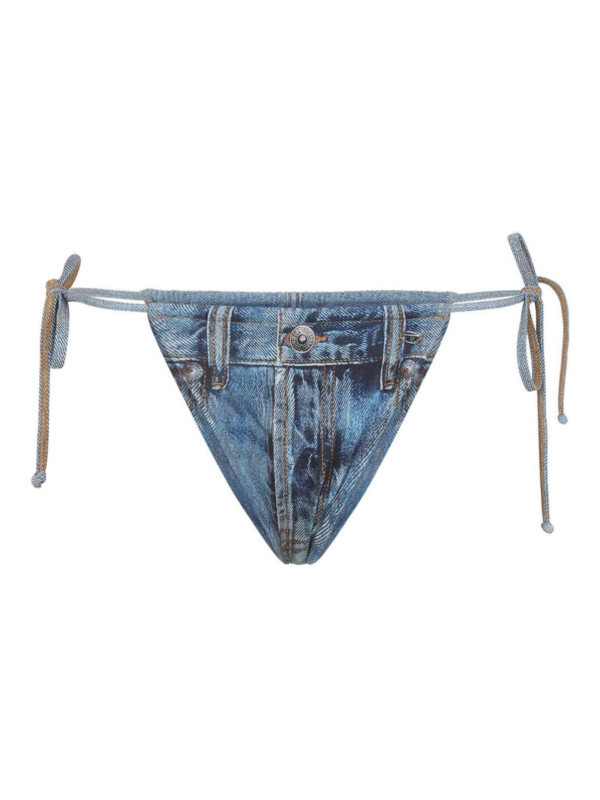 Diesel jodie ポリエステルビキニボトム。ブルーテックファブリック製のハイカットブリーフ。全体にデニムプリントを施し、両サイドにセルフタイ2本と総裏地が付いています。