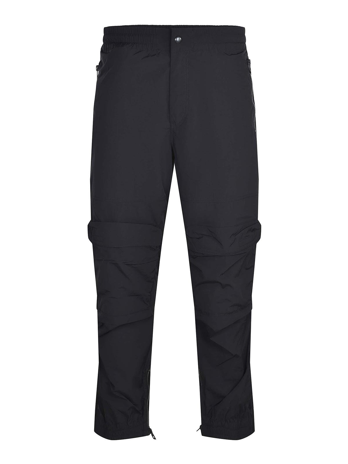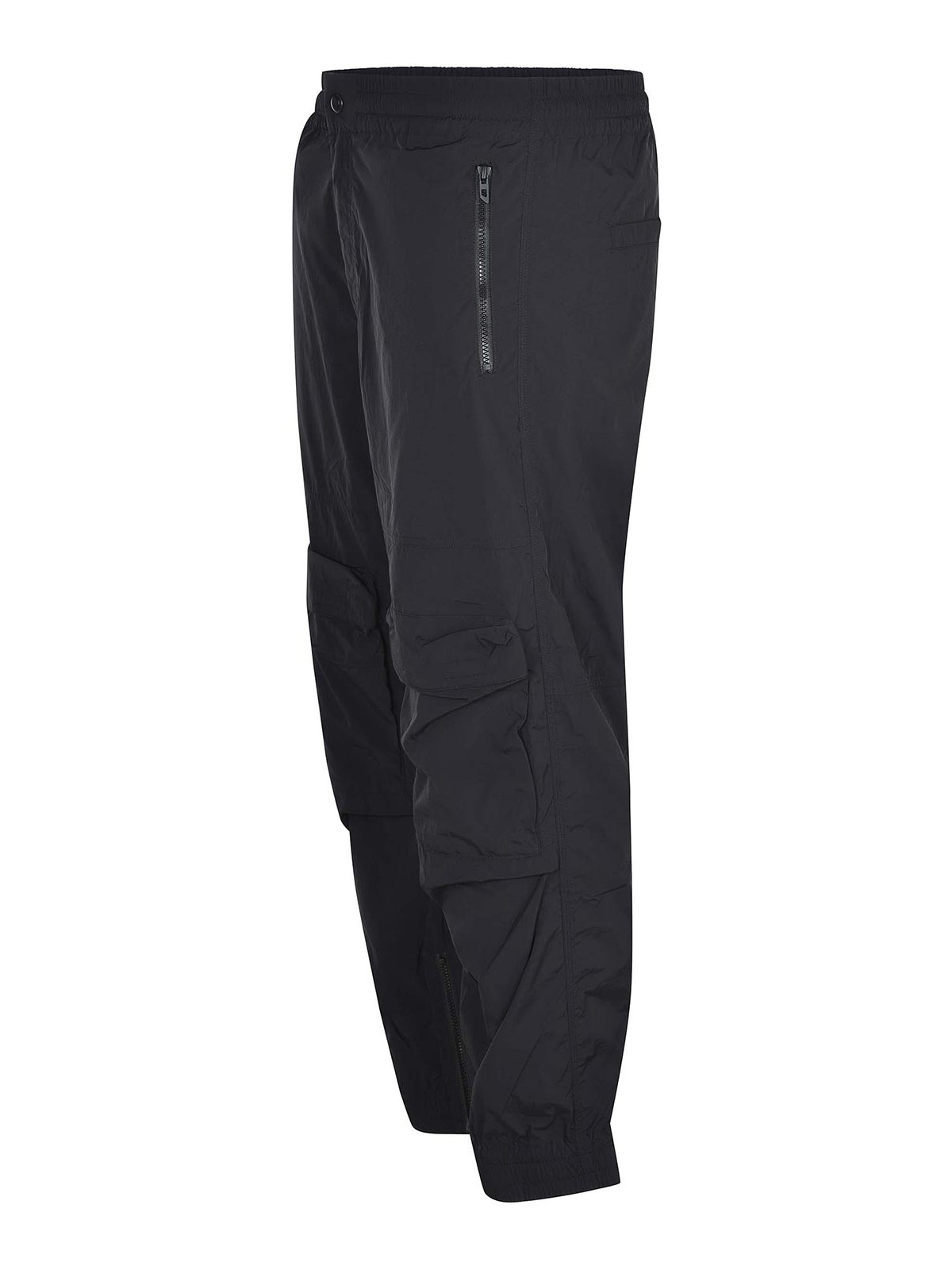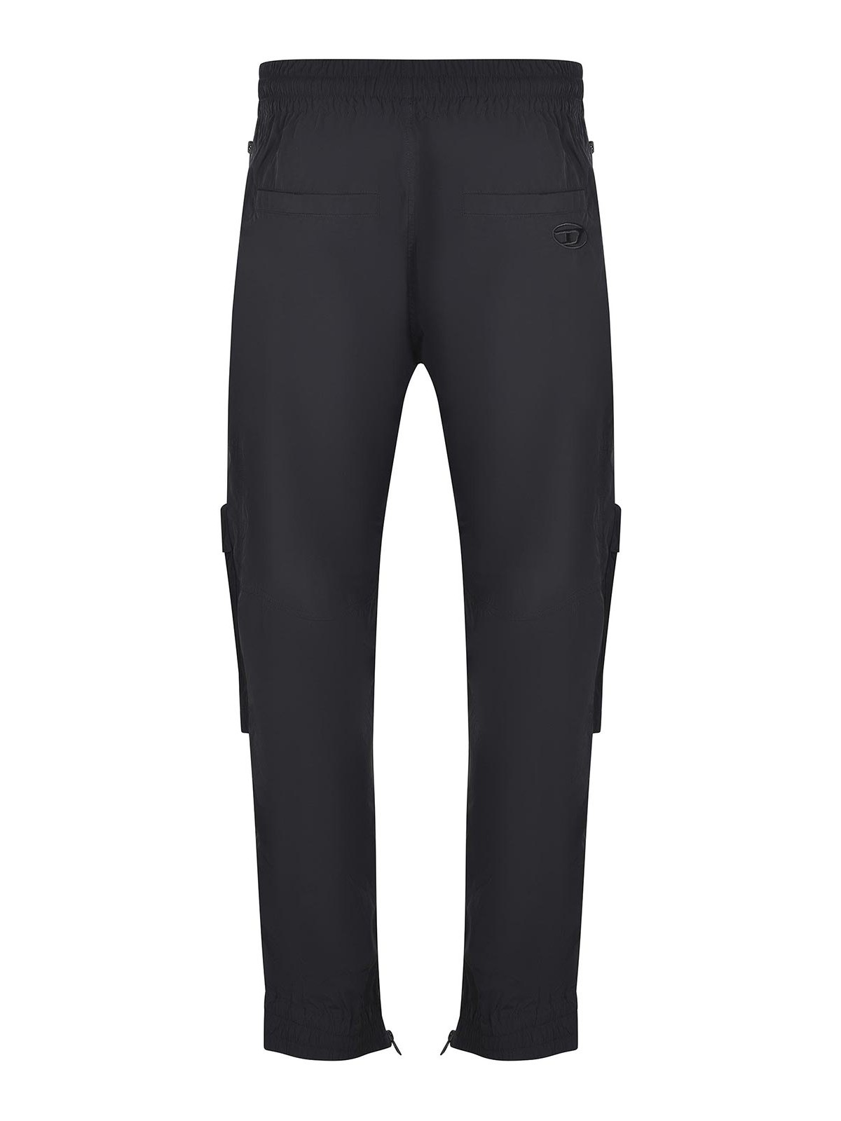 ブラックナイロン製のディーゼルパンツ、ボタンとジッパー、調節可能な内部ドローストリング、サイドジッパーポケット、フロントフラップポケット、バックポケット、バックポケット、バックポケット、背面にトーン・オン・トーンの楕円形の刺繍入り、裾にジッパー、100% ナイロン