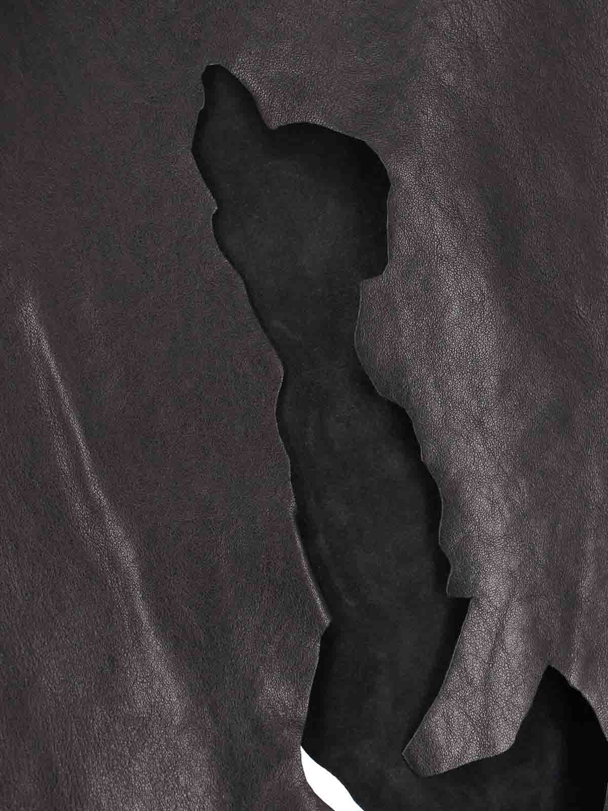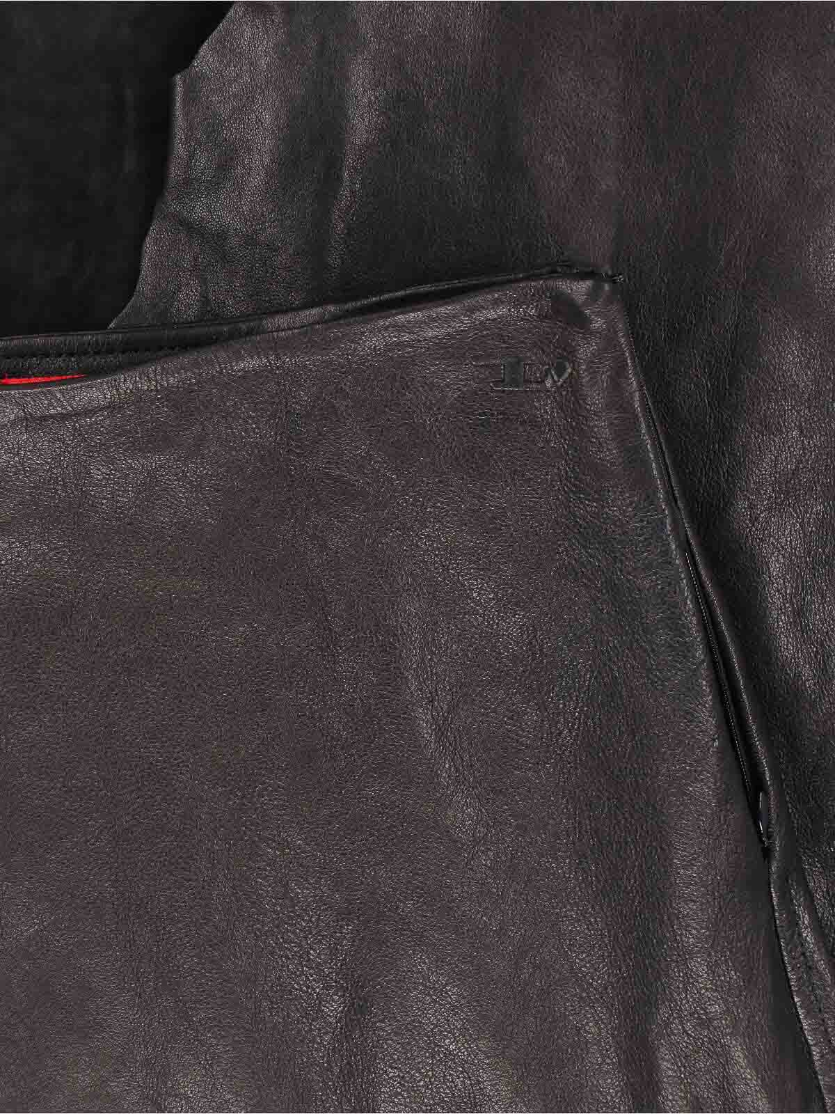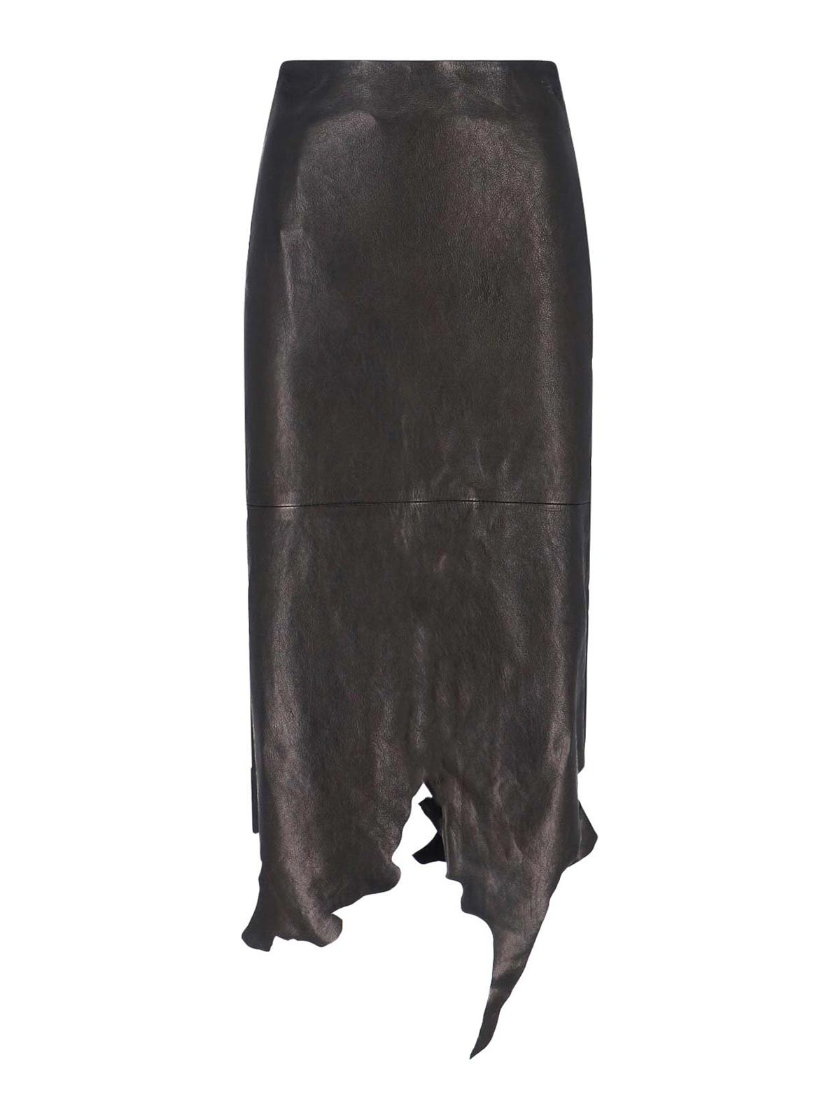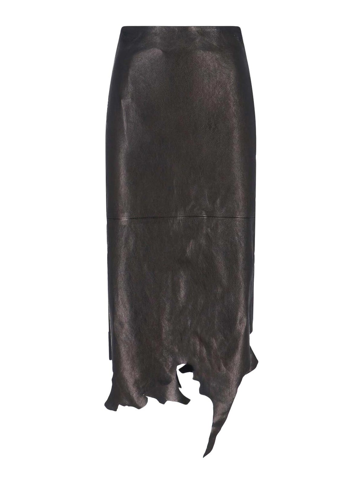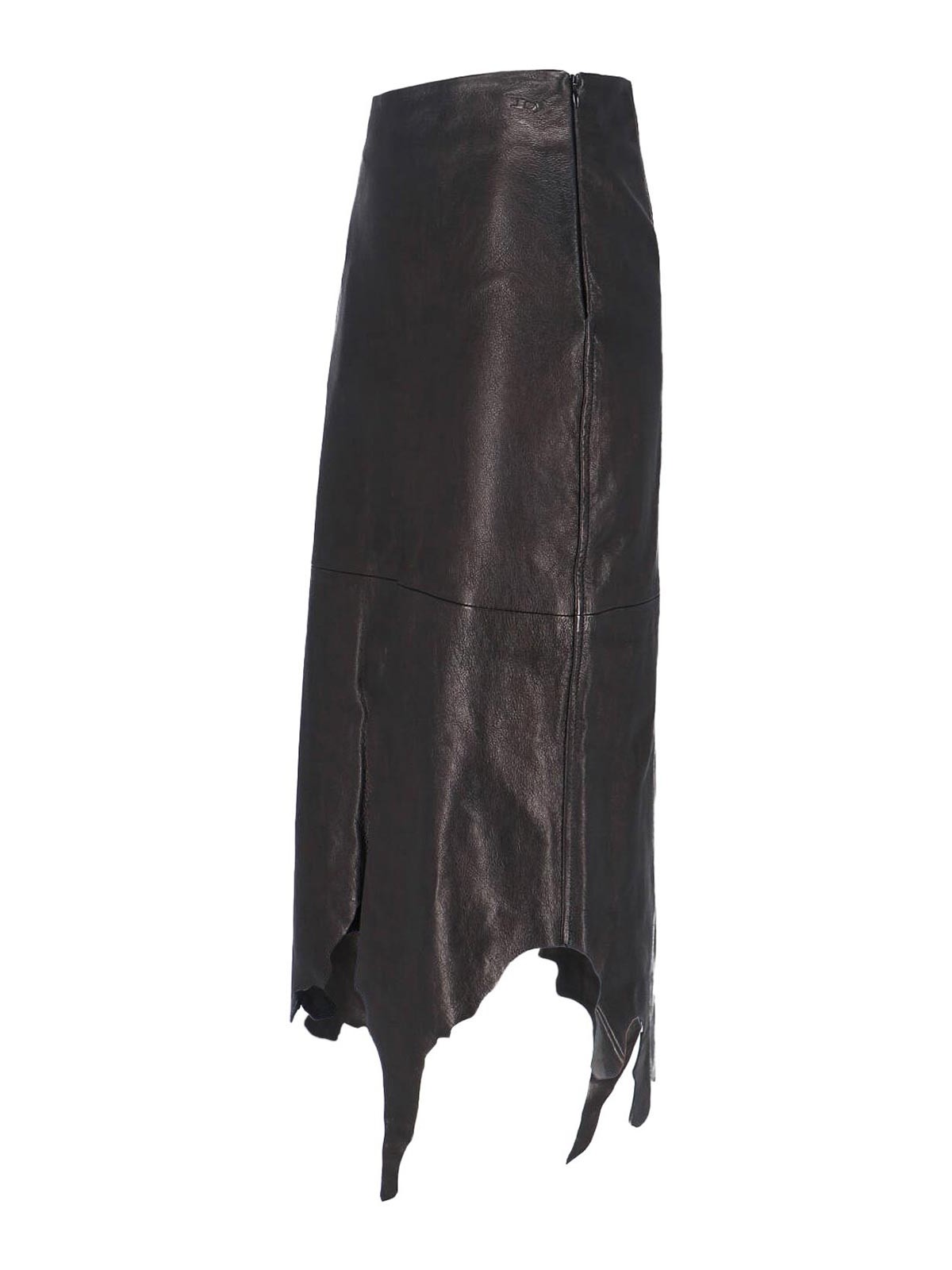 ディーゼルレザーミディスカート、ブラック、ミディアムウエスト、サイドジッパー、デストロイディテール、アシンメトリーヘム。