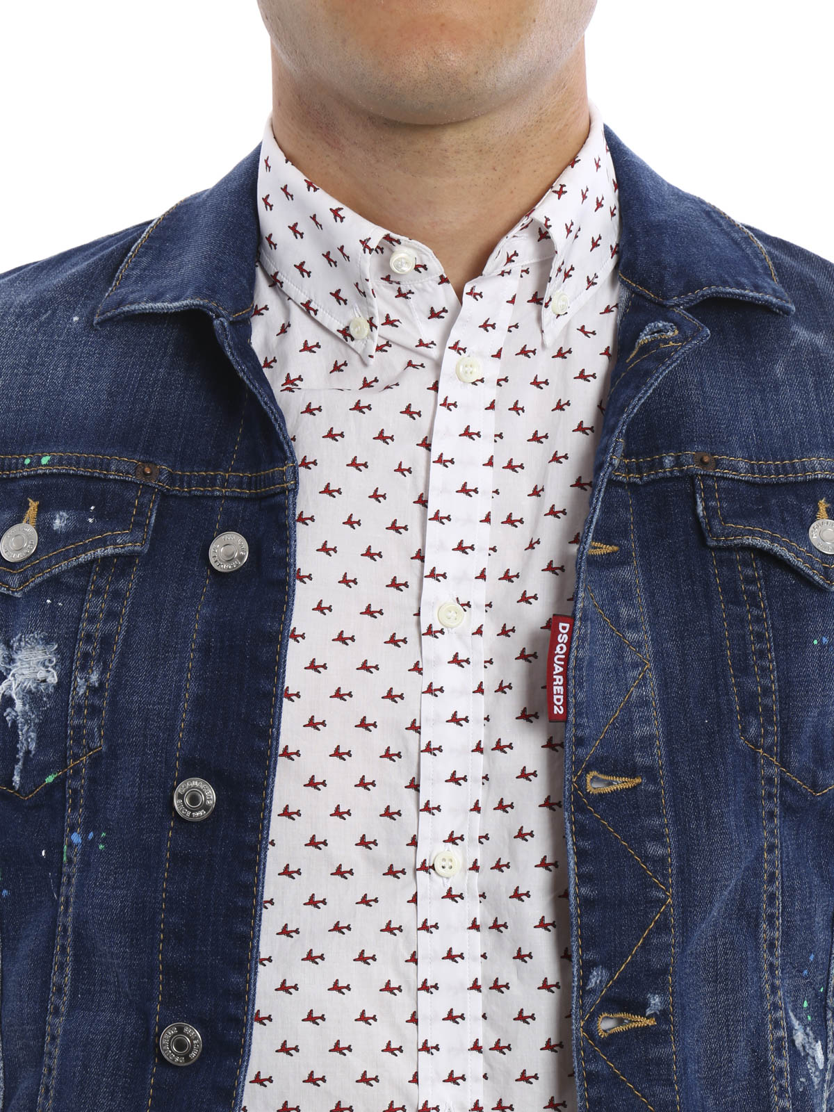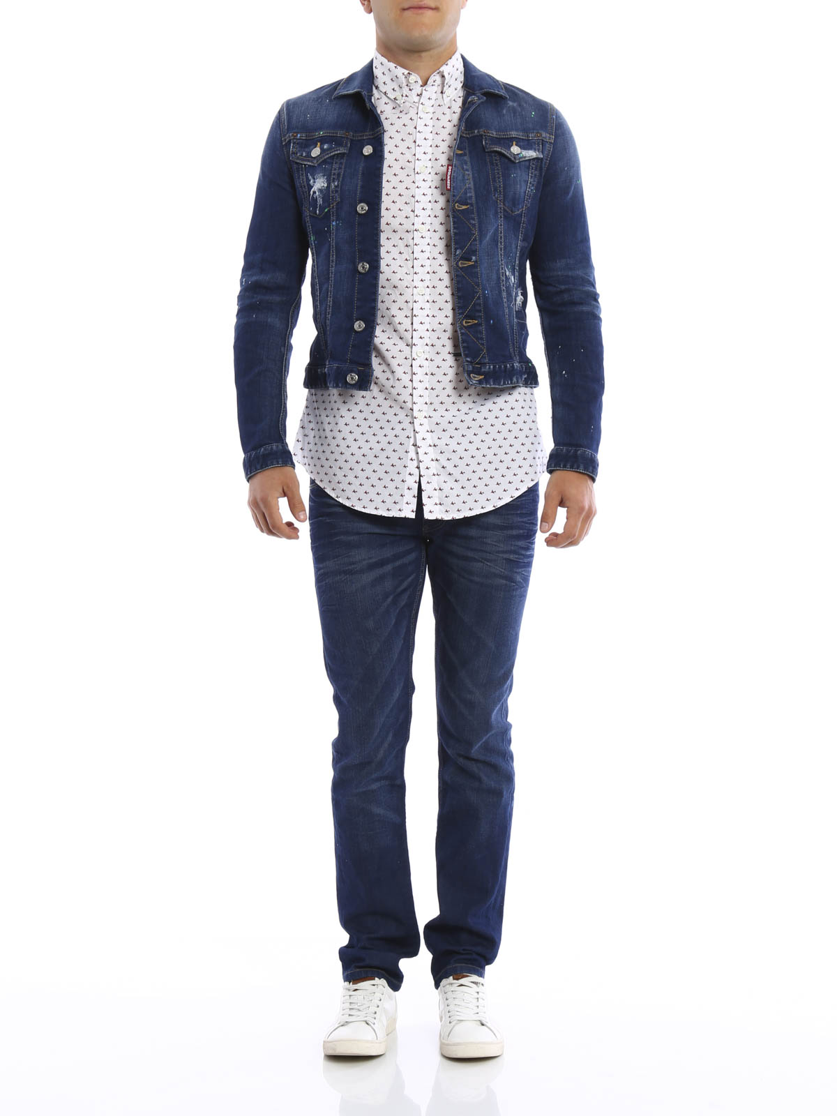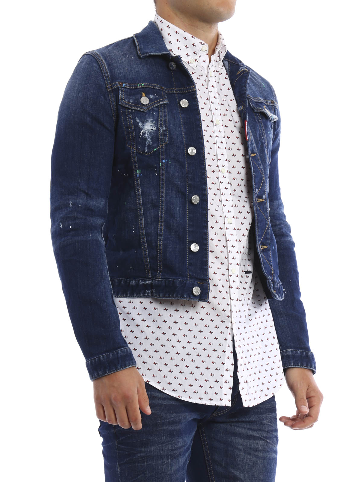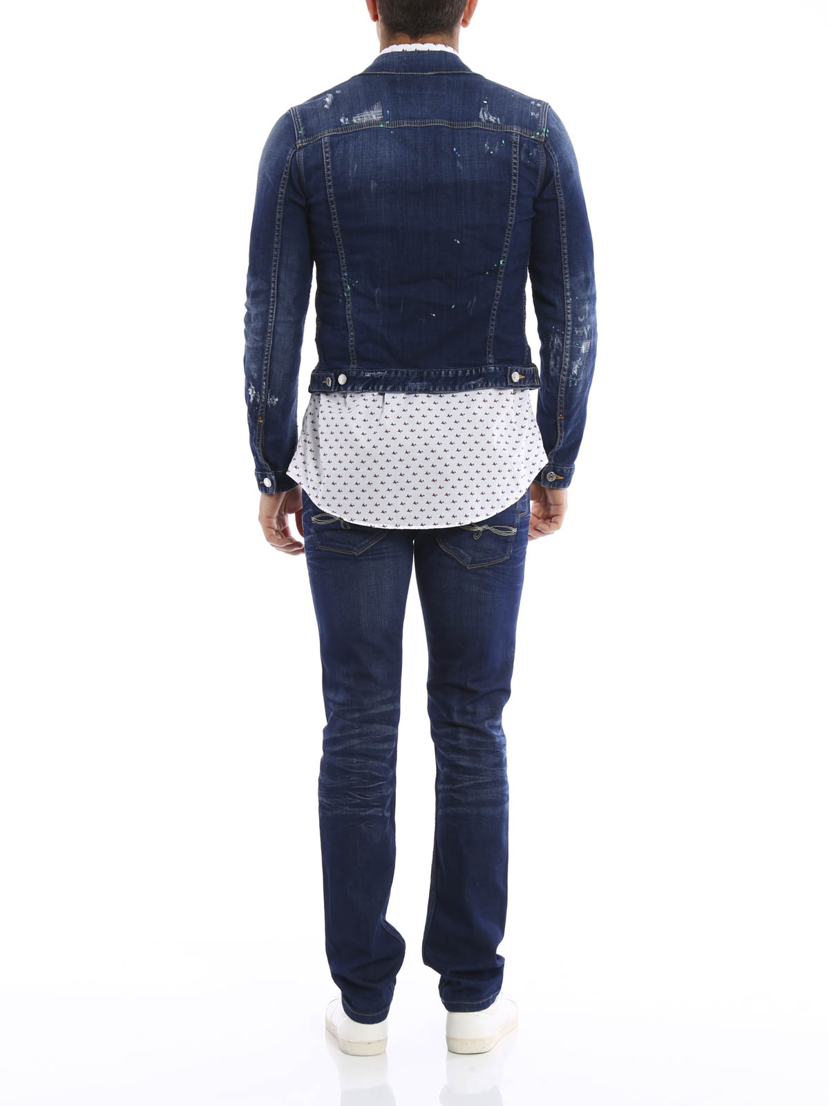 Denim jacket detailed with rips and paint spots to create a distressed look, two front pockets and classic collar.