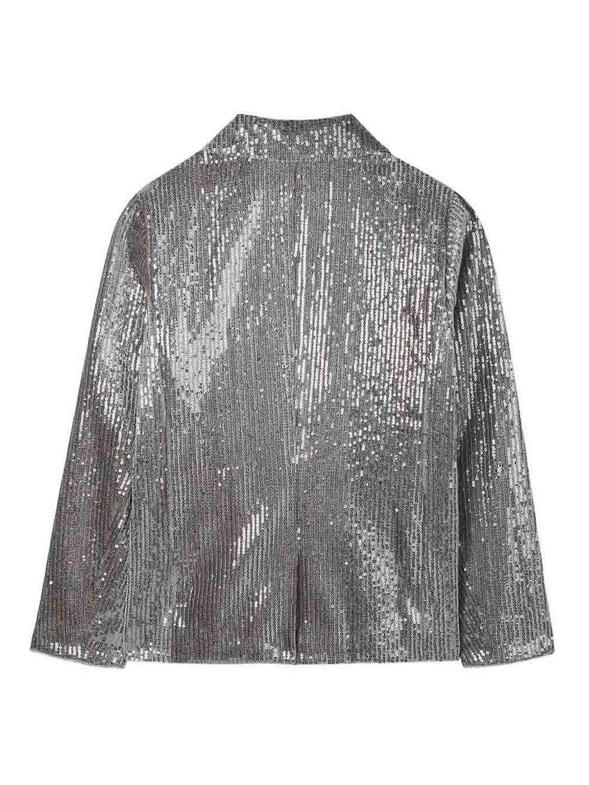 ミディアムグレースパンコールジャケット、ダブルブレストデザイン、全体にスパンコール装飾、クラシックなラペル、サイドポケット