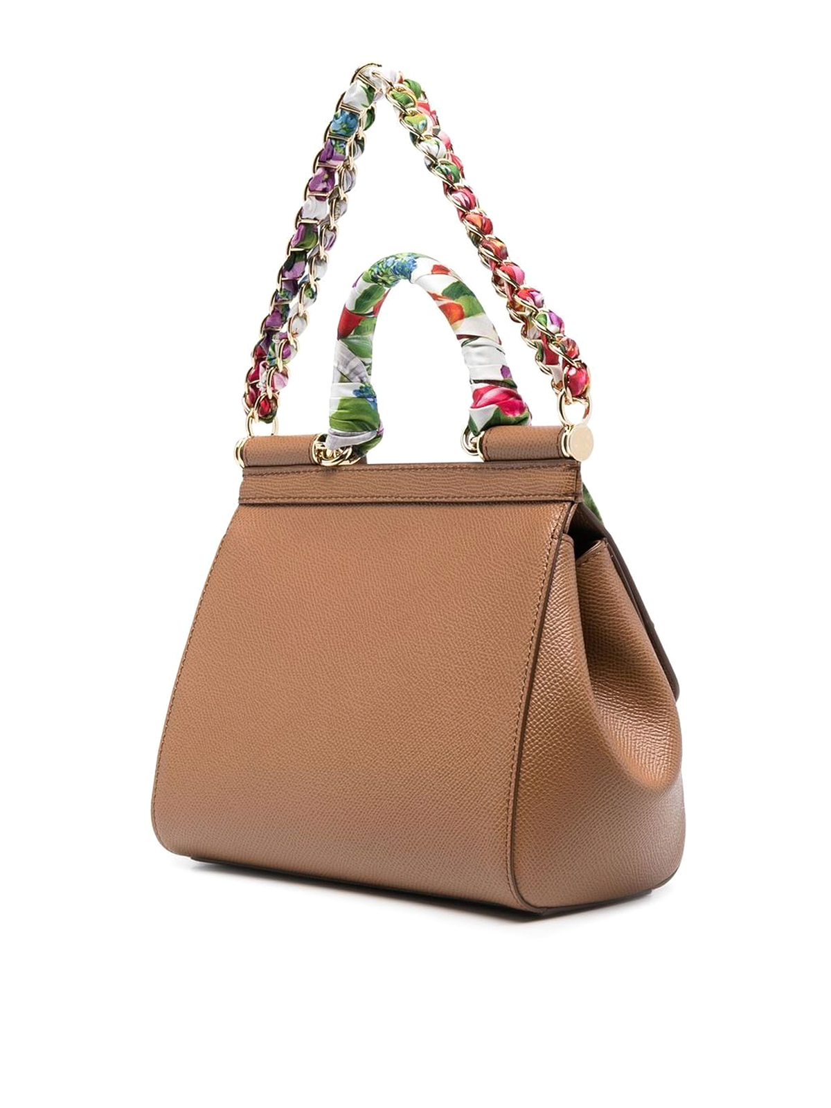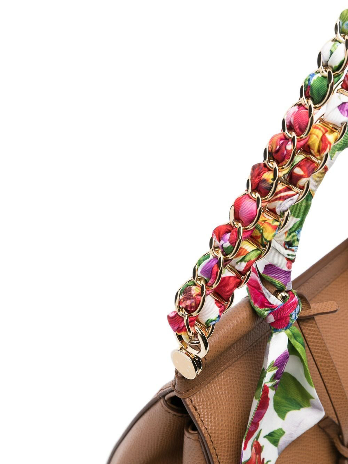 ドルチェ&ガッバーナのスカーフディテールストラップトートバッグ。ブラウン、カーフレザー、ゴールドトーンのハードウェア、マグネット留め付きフォールドオーバートップ、メインコンパートメント、ヒョウ柄の裏地、内部カードスロット、内部ロゴスタンプ、調節可能な取り外し可能なショルダーストラップ、シルク花柄スカーフ、チェーンリンクショルダーストラップ、ロゴプレート付きレザータグ。