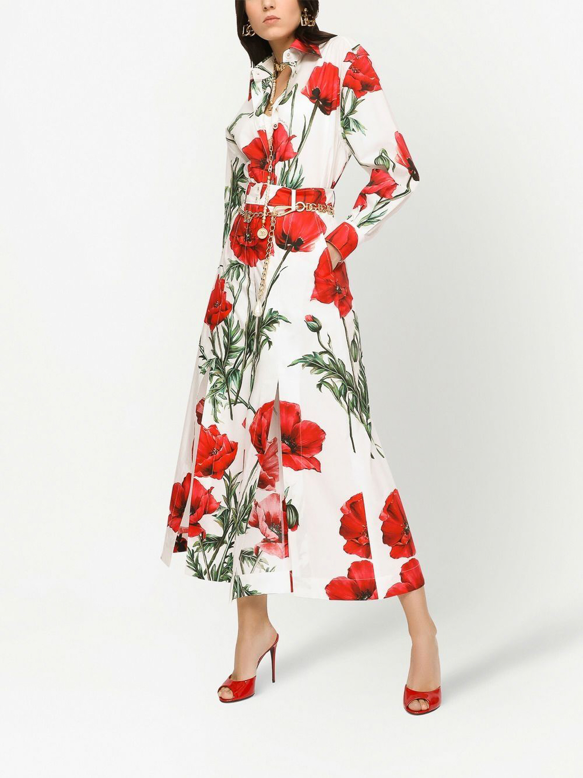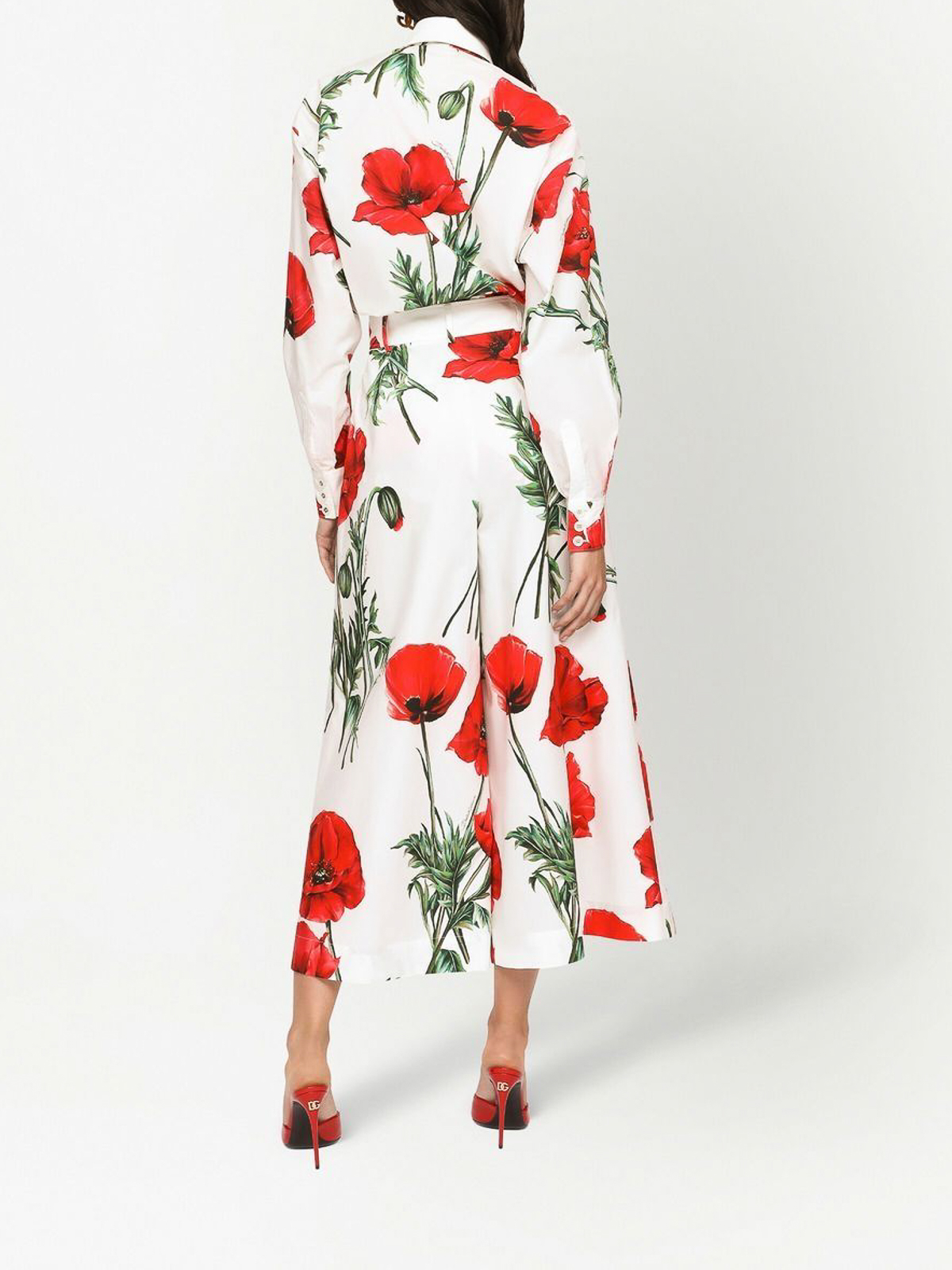 ドルチェ&ガッバーナのポピープリントシャツ。クラウドホワイト、ブライトレッド、ダークグリーン、コットン、オーバーサイズのポインテッドカラー、フロントボタン留め、ロングスリーブ、ストレートヘムが特徴です。