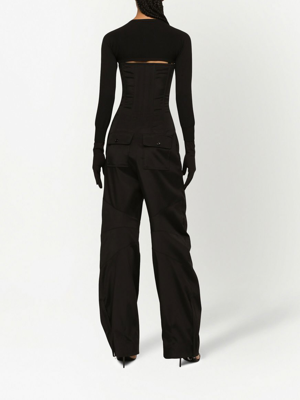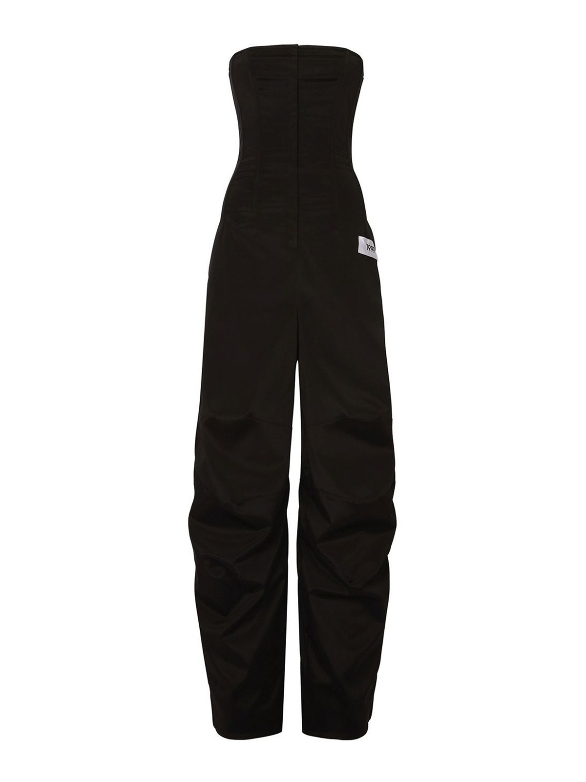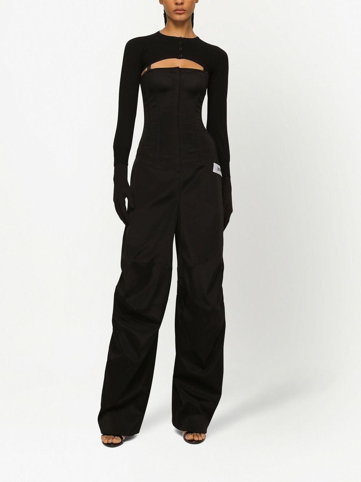 kim dolce & gabbanaのナンバーパッチ付きストラップレスジャンプスーツ。ブラック、ストラップレス、フロントにナンバーパッチ、隠しフロントファスナー、ワイドレッグ、パネルデザイン、アンクルジップ、リアフラップポケット2つ。