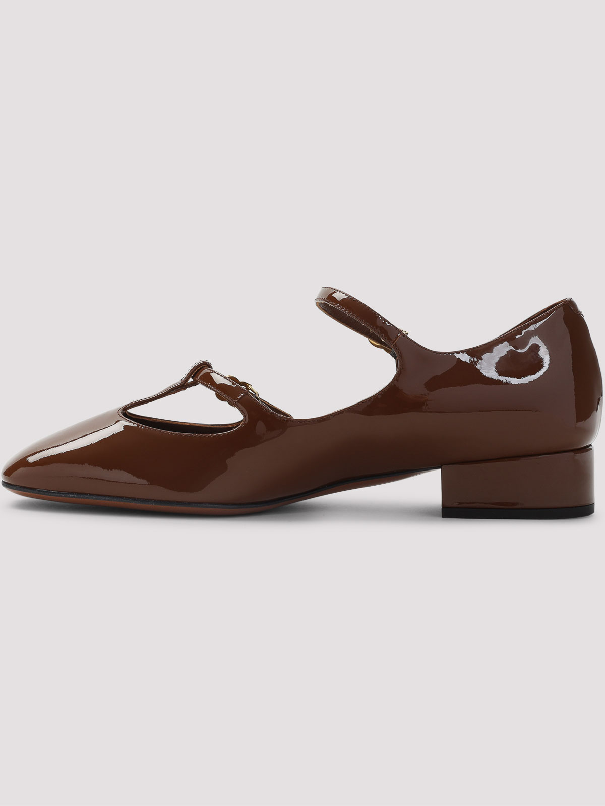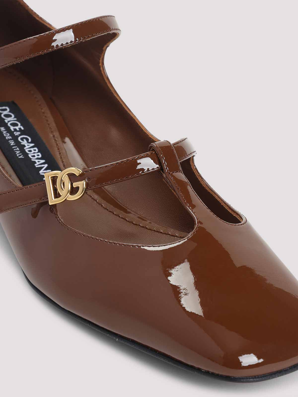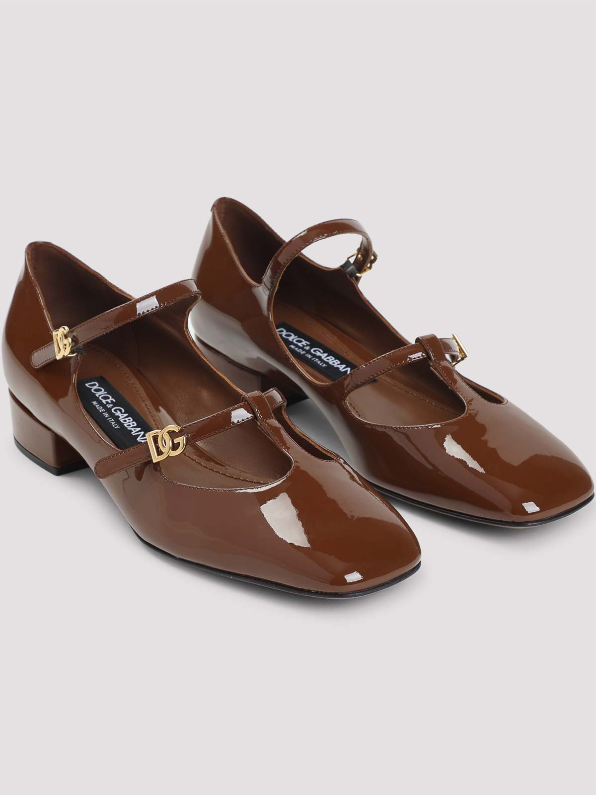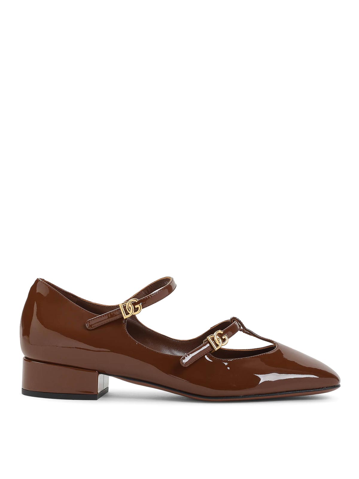 ドルチェ&ガッバーナのブラウンカーフレザーパンプス。ブラウンのパテントカーフレザー製、スクエアトウ、ゴールドトーンのDGバックル付きの調節可能なストラップ2本、カバー付きブロックヒール、レザーインソールとアウトソール。