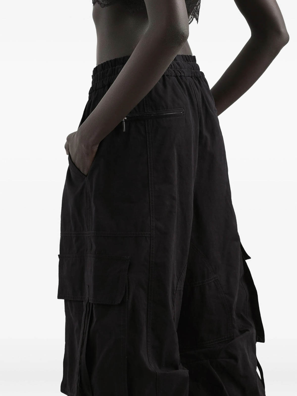 複数のポケットにプリーツをあしらった黒いドローストリングのカーゴポケット