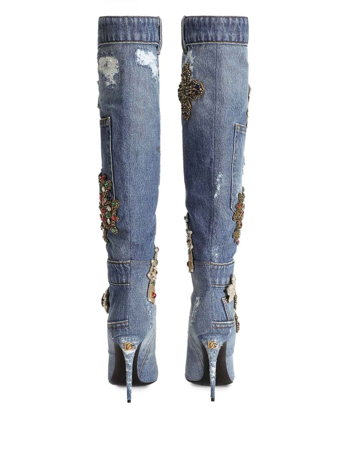 ブルーアンティーク調デニムジュエル装飾ハイポインテッドトゥニーハイシャフト