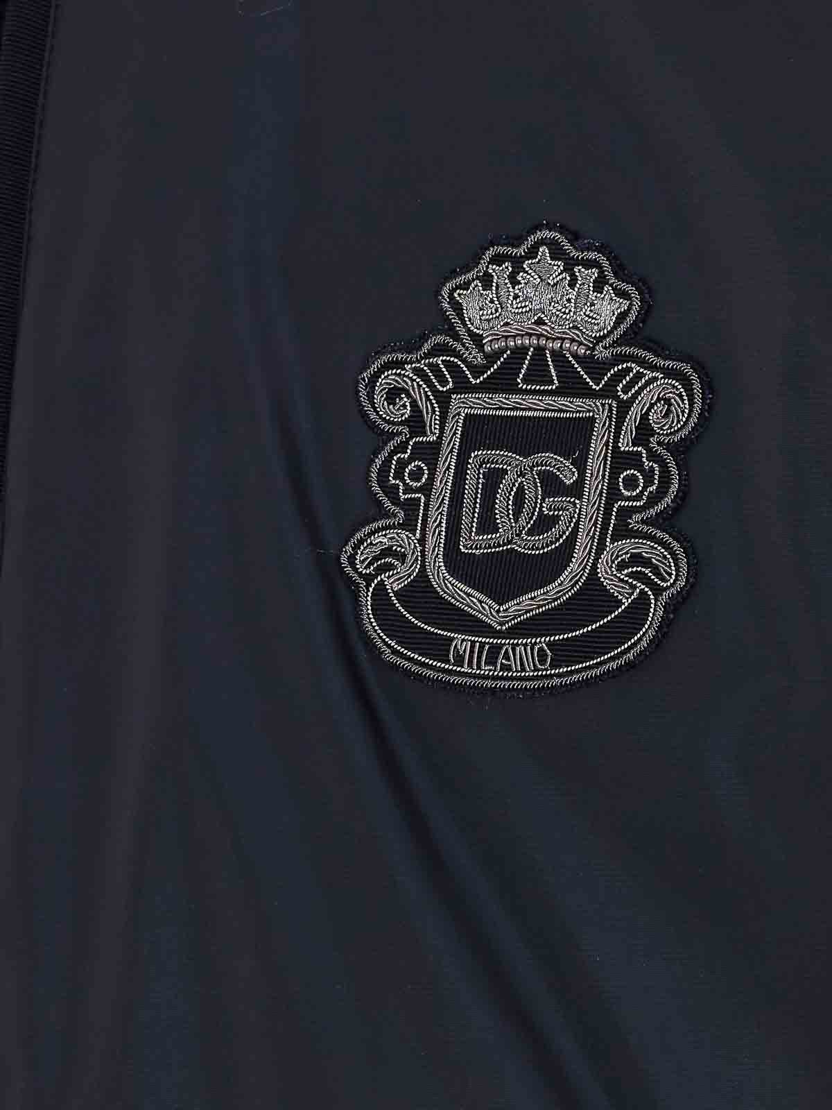Dolce & Gabbana ブラックジャケット、前面ファスナー開閉、長袖、前面にパッチロゴ、ファスナーポケット