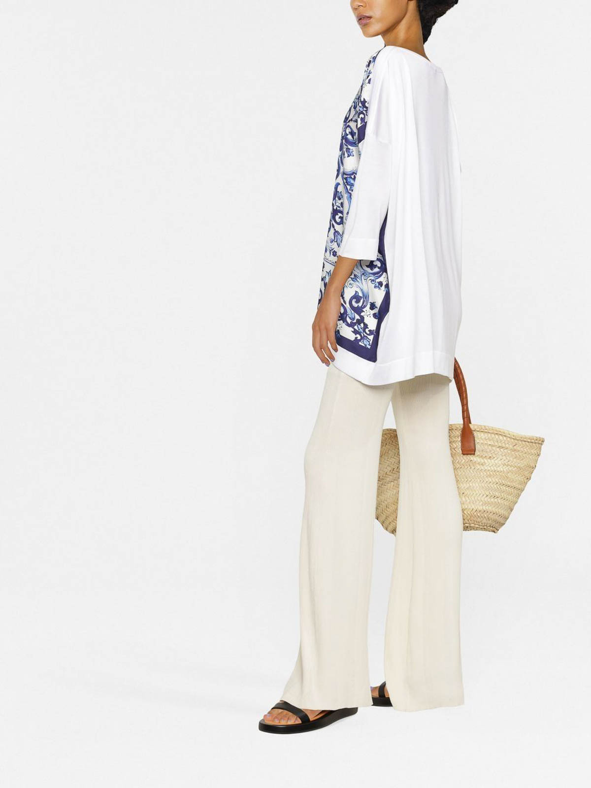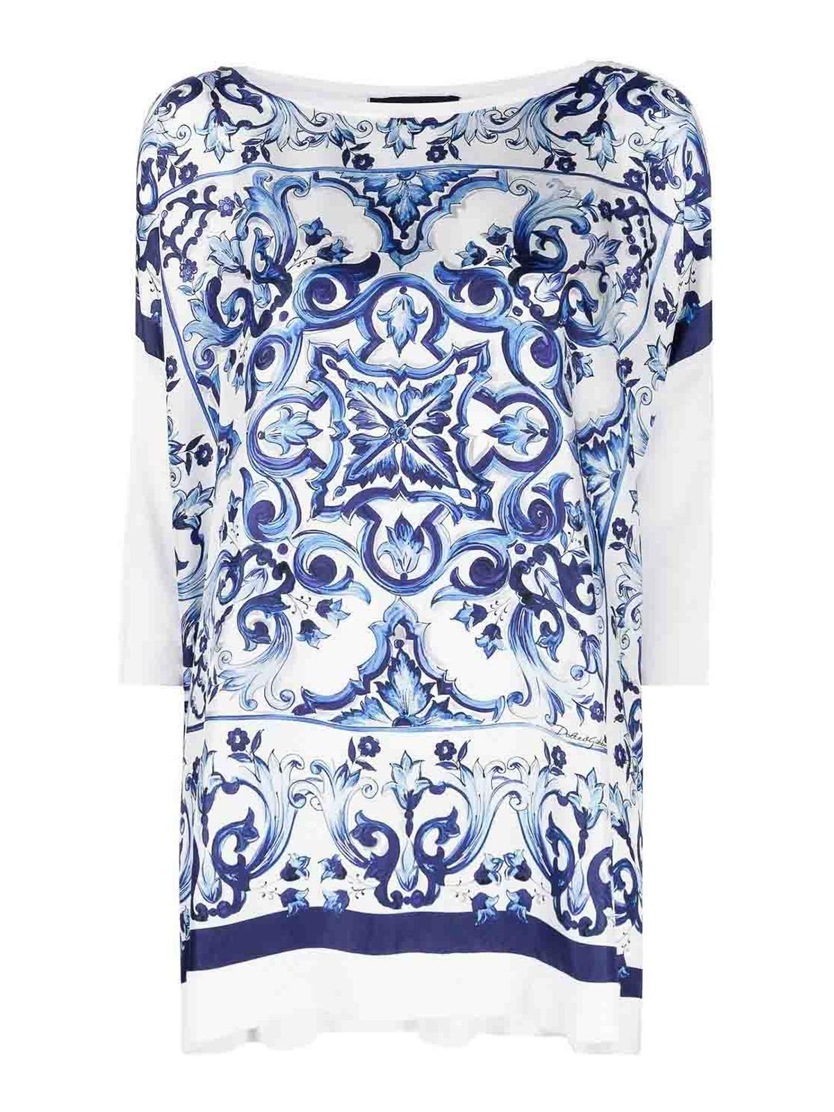 ホワイト、シルク、マジョリカプリント、ラウンドネック、3/4スリーブ、ストレートヘム。