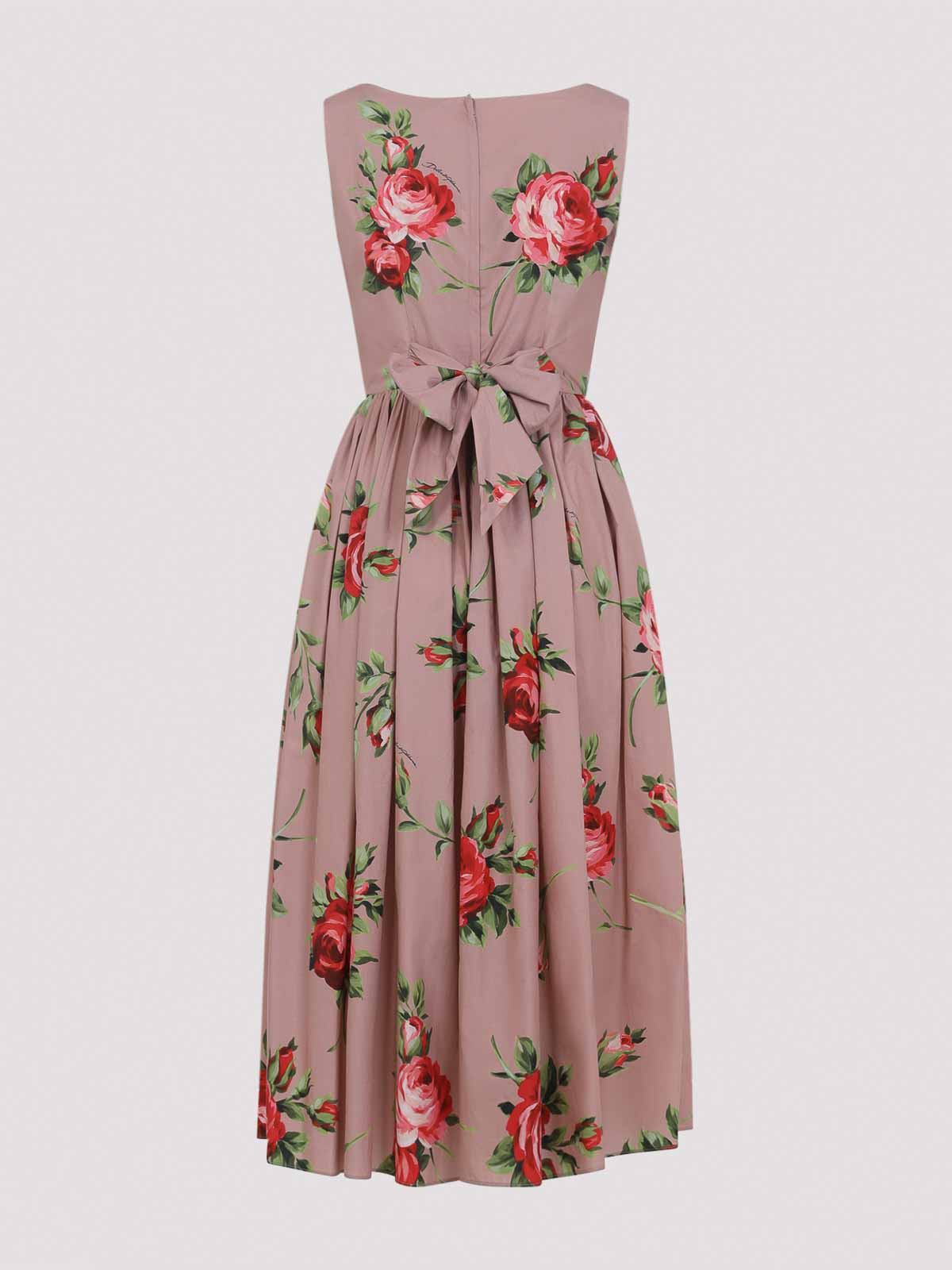 ドルチェ&ガッバーナのブーケローズコットンドレス。ピュアコットンドレス、ボートネック、バックファスナー、ノースリーブ、ゴムウエスト、ミディ丈、フレアスカート、ストレートヘム。ローズバックにマルチカラーのバラのデザイン。