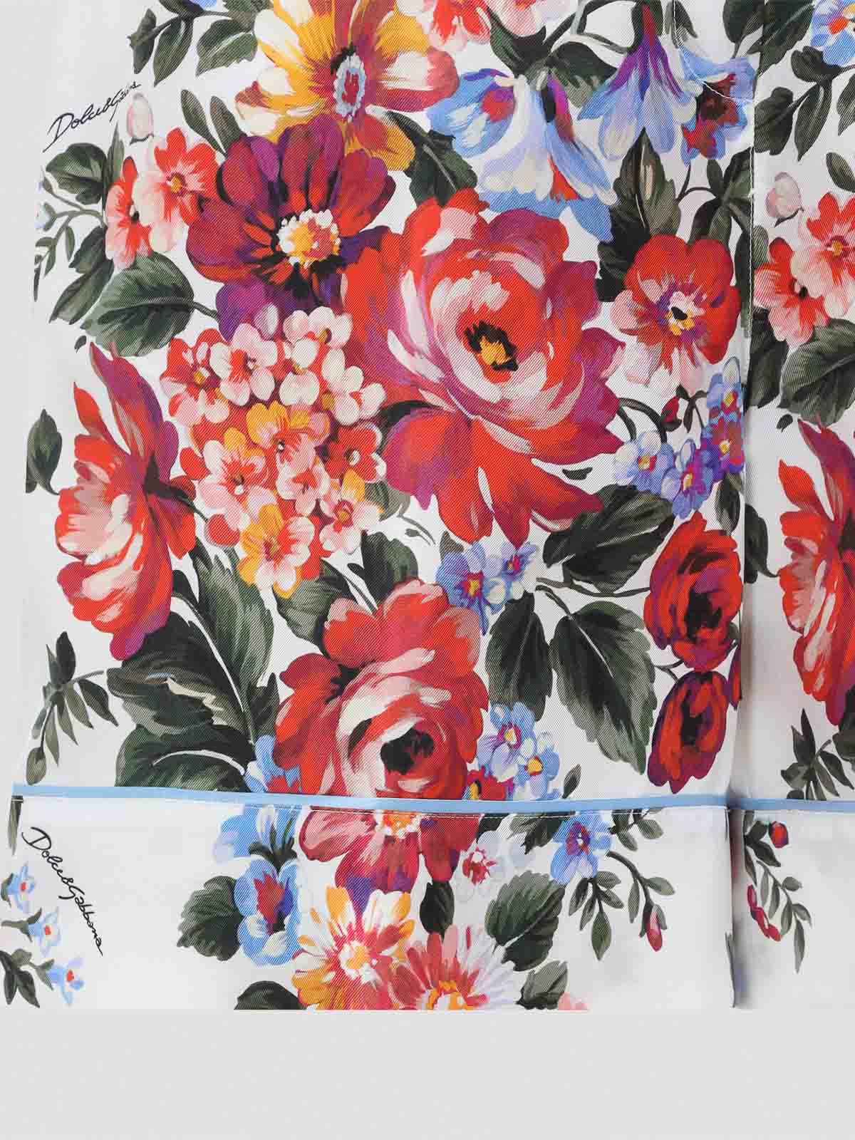 ドルチェ&ガッバーナの白いシルクパンツ。ピュアシルクパンツ、伸縮性のある裾、サイドポケット、ワイドレッグ、ストレートヘム、ヘムにブルーのディテール。白地にマルチカラーの花のデザイン。