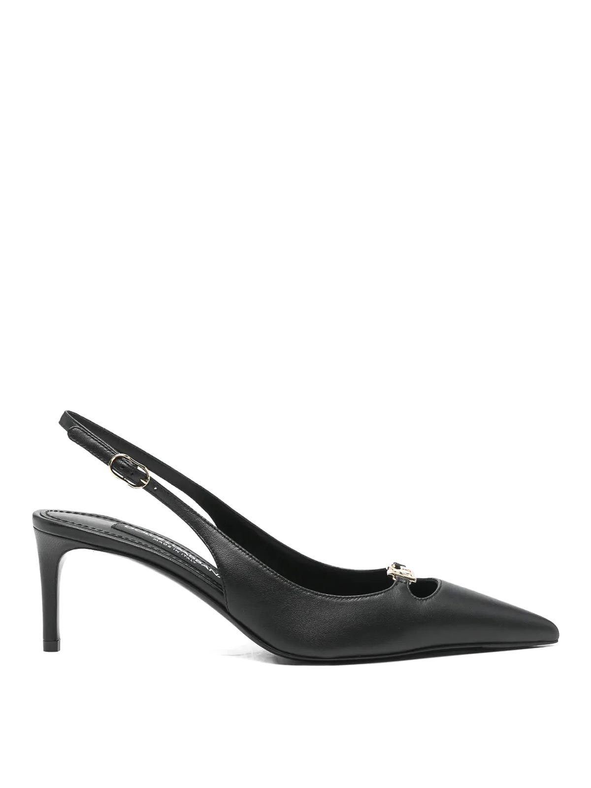 デザイナーカラー:ブラック、ラムスキン、ゴールドトーンのハードウェア、ポインテッドトゥ、スリングバックストラップ、60 mm スティレットヒール。