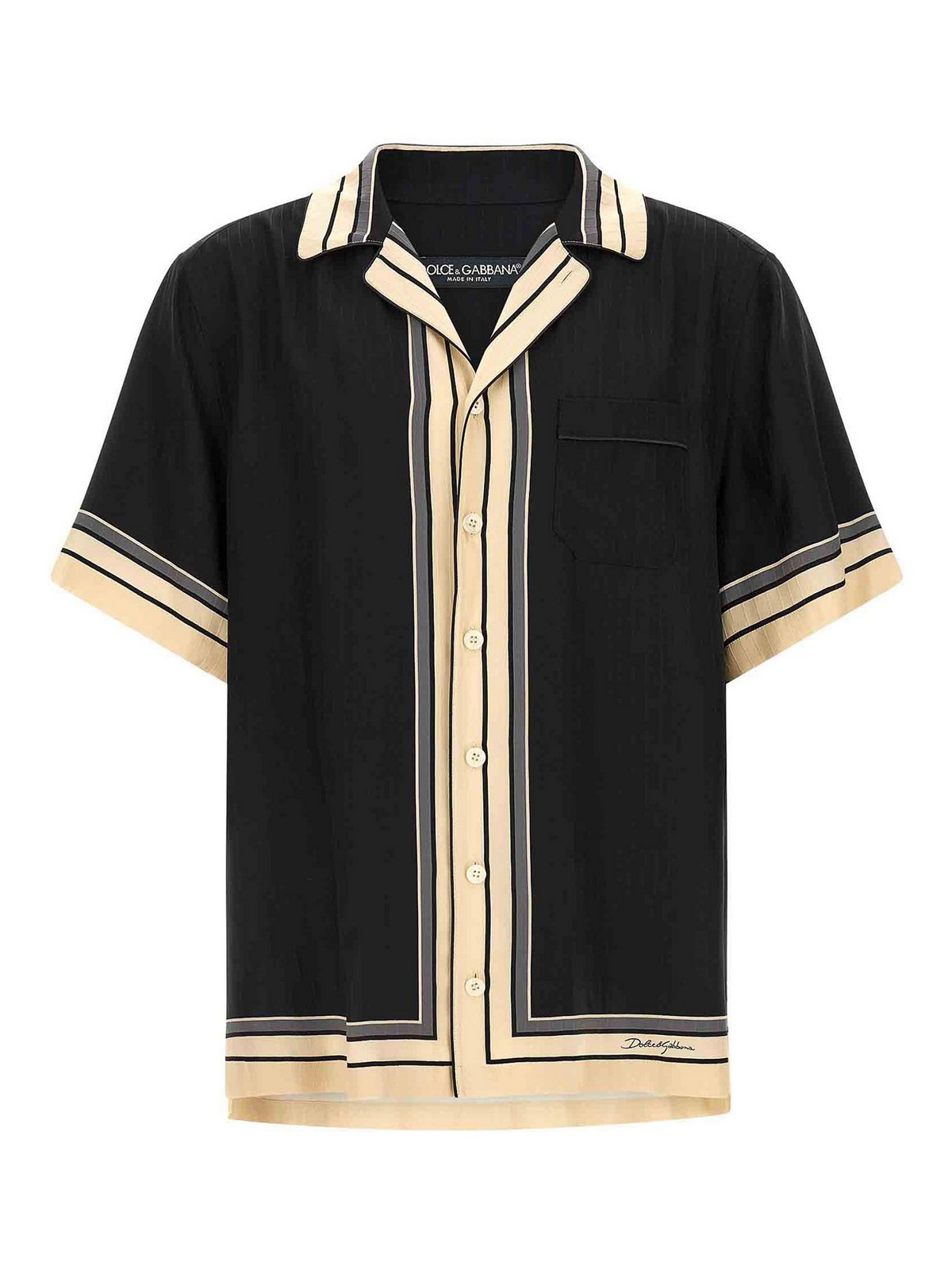 ロゴとストライプがプリントされたハワイシルクシャツ、「バニティ」カラー、胸ポケット、フロントボタンクロージャー、ショートスリーブ、サイドスリット。この製品に見られるプリント配置の違いは、ドルチェ&ガッバーナのハンドメイド製品の特徴です。この商品に見られるプリントの位置の違いは、それぞれの衣服やアクセサリーをユニークで高級感のあるものにしています。