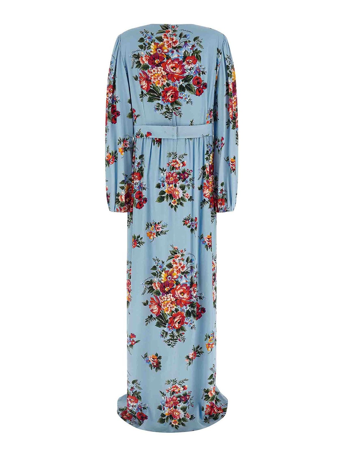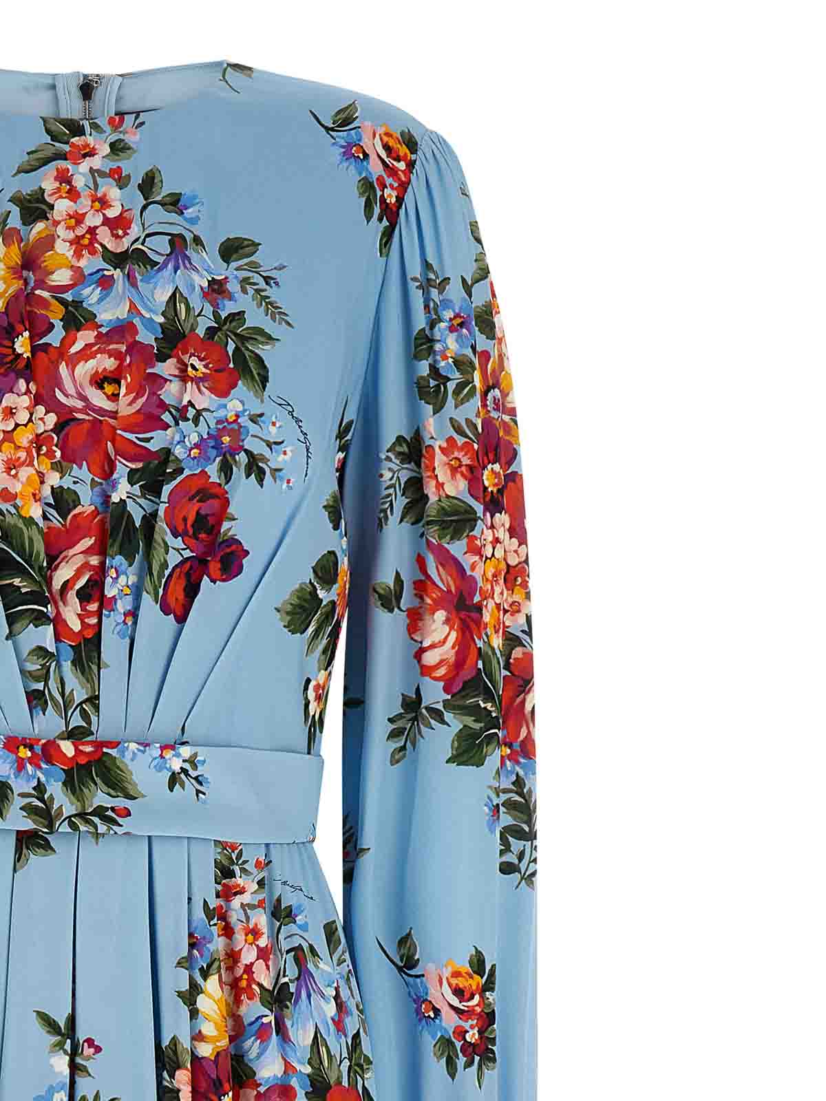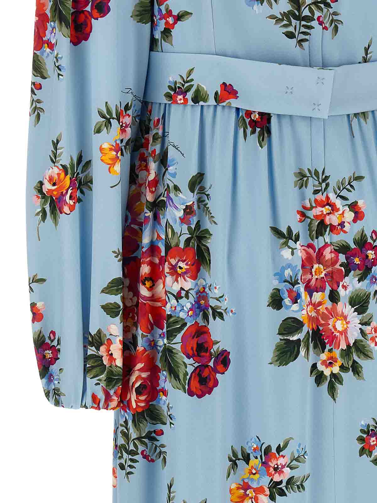 全面に「マッツォ・ディ・フィオーリ」プリントのシルクシャルムーズ、フロントにプリーツとプリーツをあしらったロングドレス、ウエストのお揃いのベルトによる砂時計のシルエット、プリーツ付きのソフトスカート、クルーネック、伸縮性のある袖口付きの幅広ロングスリーブ、バックファスナー、裏地。この商品に見られるプリントの位置の違いは、ドルチェ&ガッバーナのハンドメイド製品の特徴です。特徴そのため、各衣類やアクセサリーはユニークで特別なものになります。