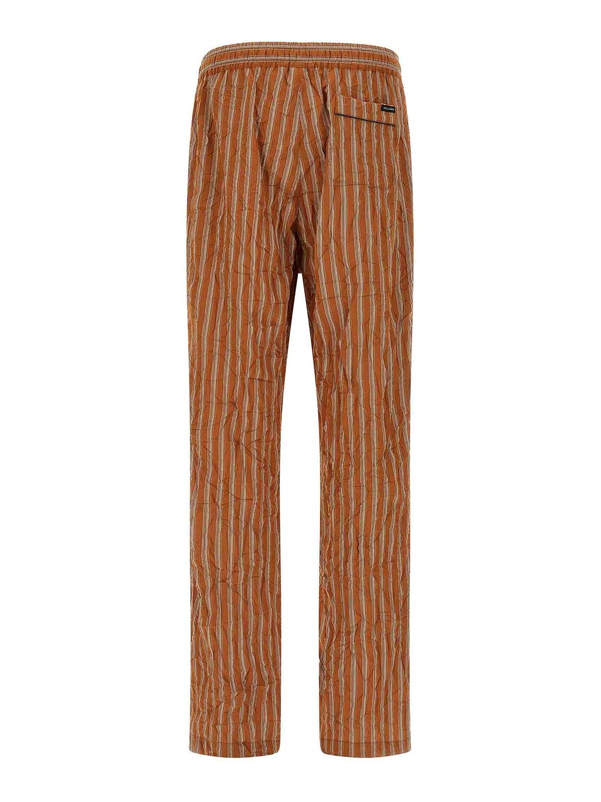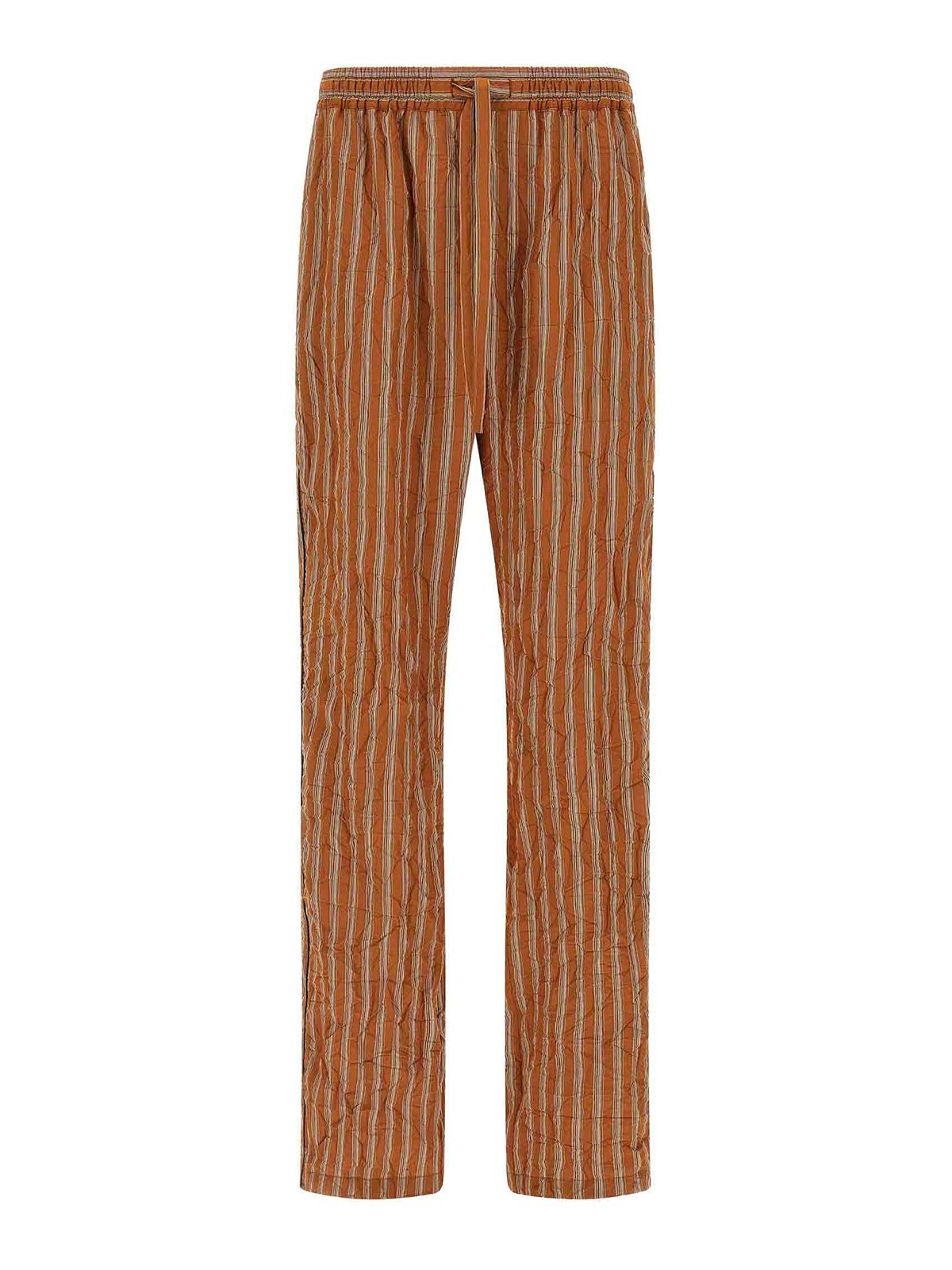 コットンとシルクの混紡キャンバスフロイス柄のストライプ、パジャマモデル、ストレートレッグ、ドローストリング付き伸縮性ウエストバンド、トロンプルイユフラップ、ポケット、サイドに無地のパイピングを施したバニティパンツ。しわのある生地のしわ効果は、熱を利用して繊維の構造を変更し、衣服のしわのある外観を永久に作り出す特別なプロセスを経て、仕上げ段階で得られます。しわを防ぐため、衣類を水で洗ったりアイロンをかけたりしないでください。推奨される唯一の治療法はドライクリーニングです。