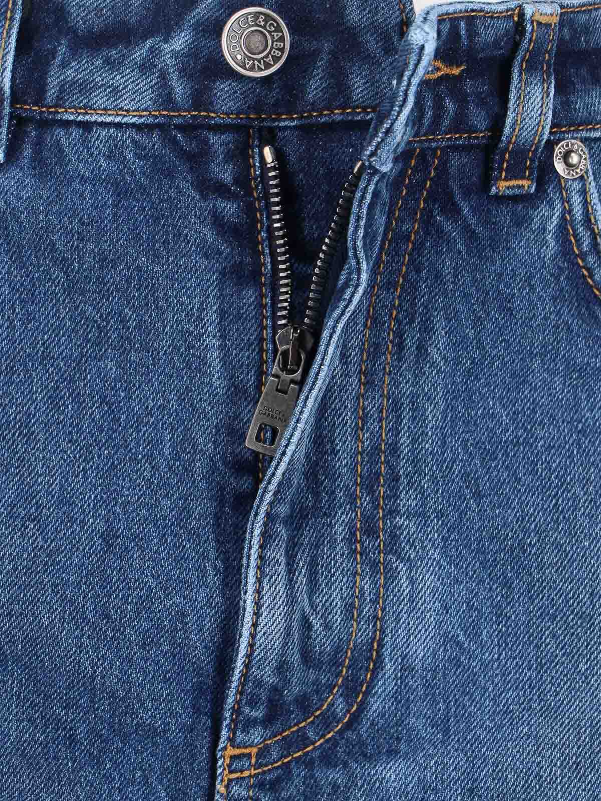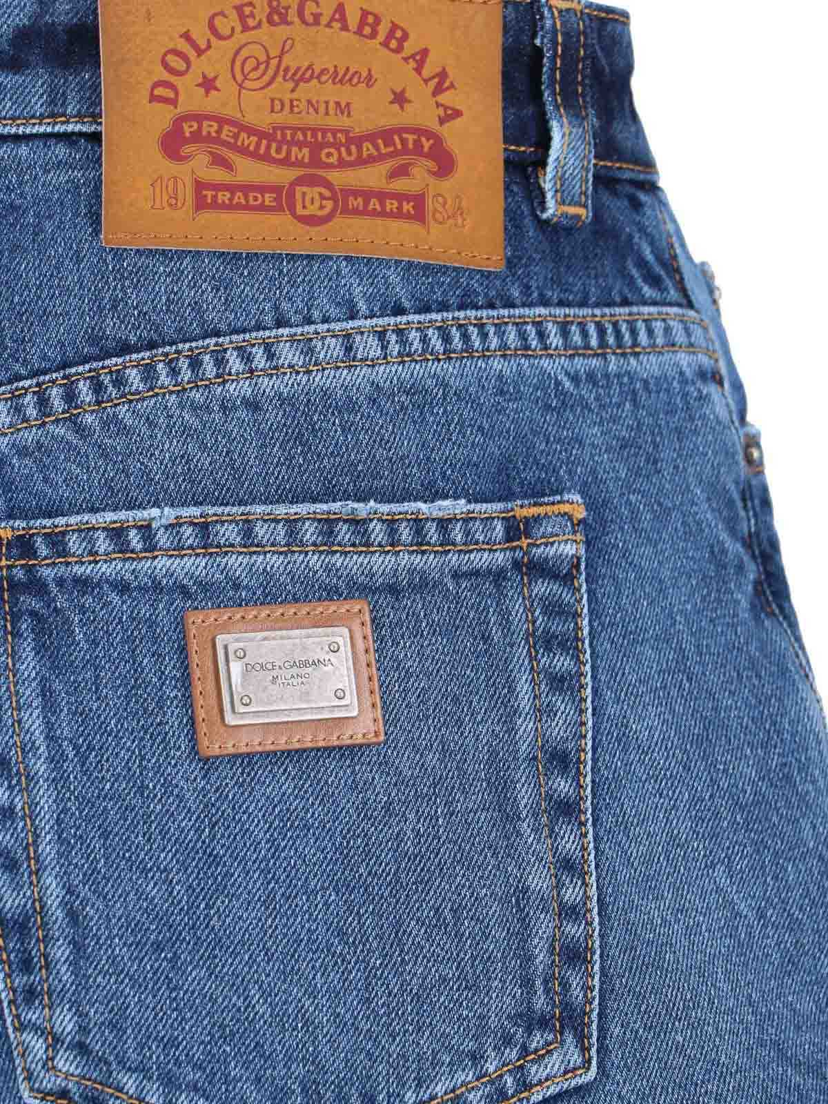 ドルチェ&ガッバーナデニムショーツ、ブルーコットン、ミディアムウエスト、ファスナーとボタン留め、5ポケットデザイン、背面にレザーロゴパッチ、背面にメタルロゴタグ、ストレートレッグ。