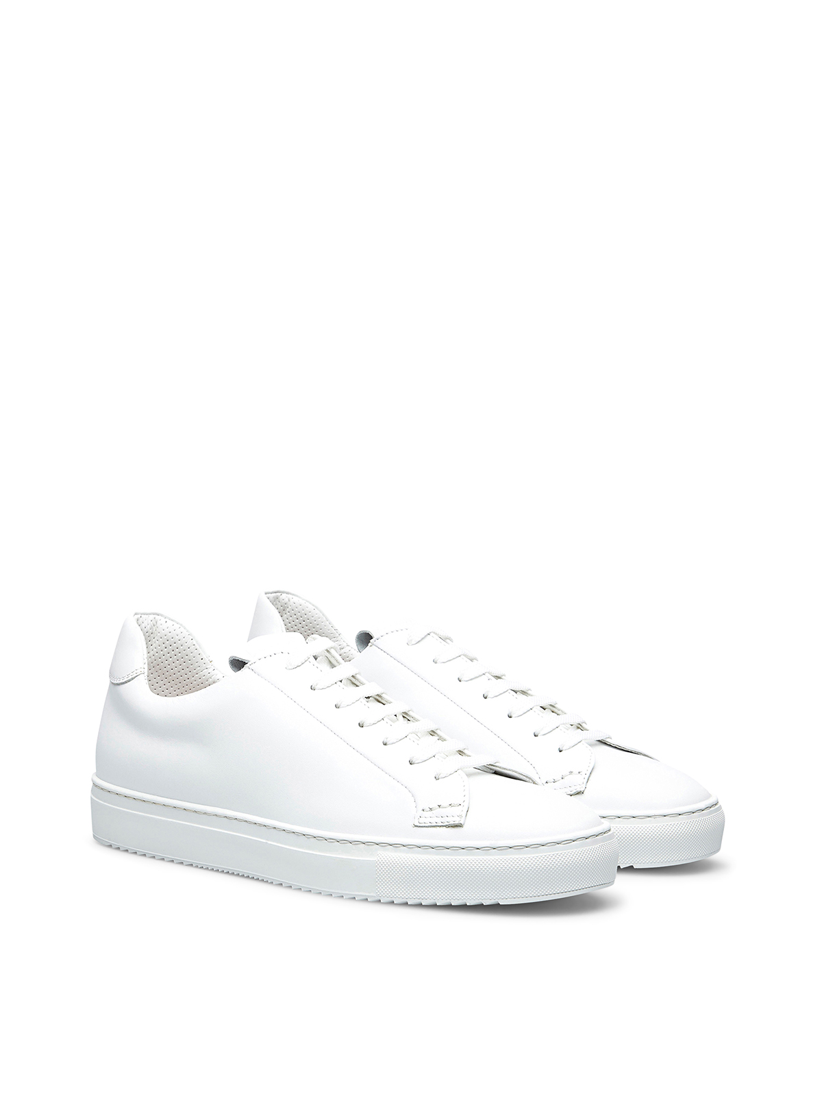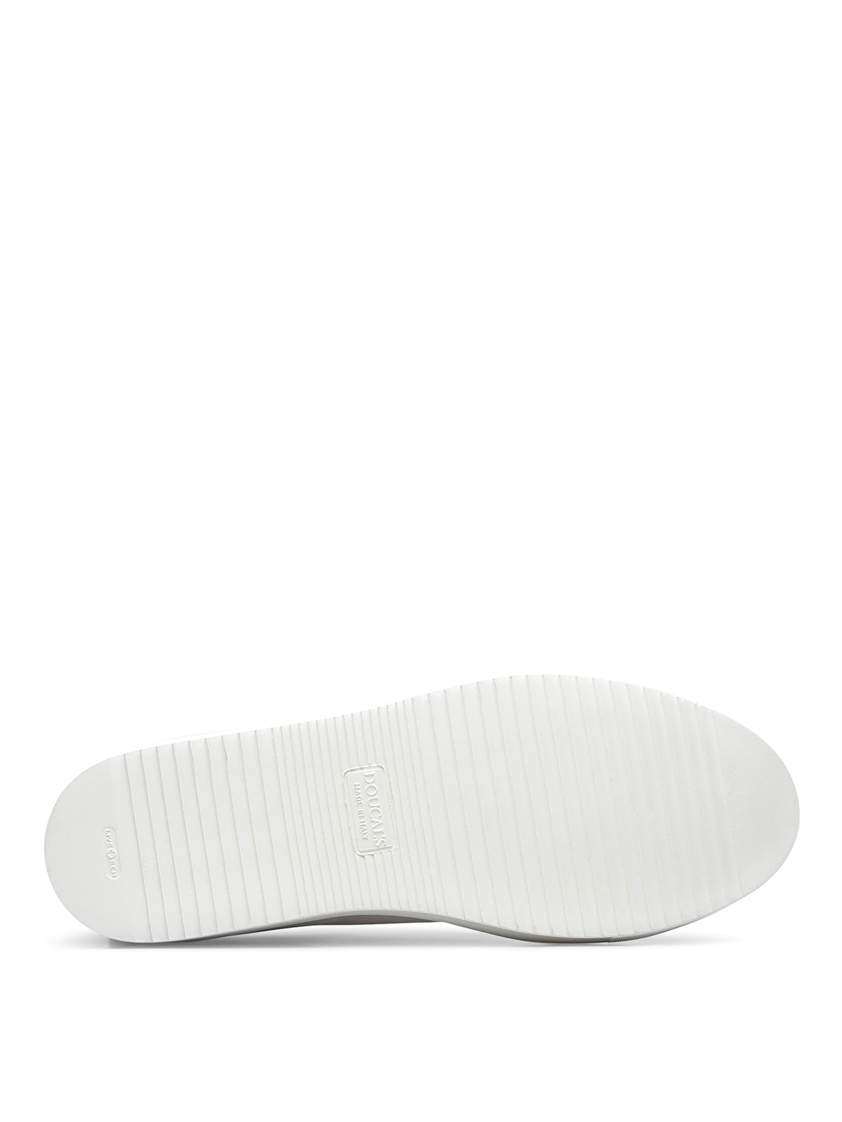 レザーアッパー、スポンジレース、ラバーソールをあしらったロートップスニーカー。