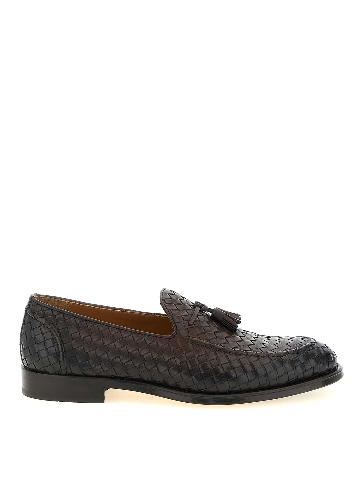バッグ構造とボウルステッチをあしらったアドラーのウーブンレザーローファー、ブレイクの職人技、フロントにトーン・オン・トーンのタッセルをあしらったアーモンドトウ、アイコニックなゴールデン・クリームイエローのレザーソール、半分のラバー・シードをあしらったアイコニックなゴールデン・クリーム・イエローのレザーソール。