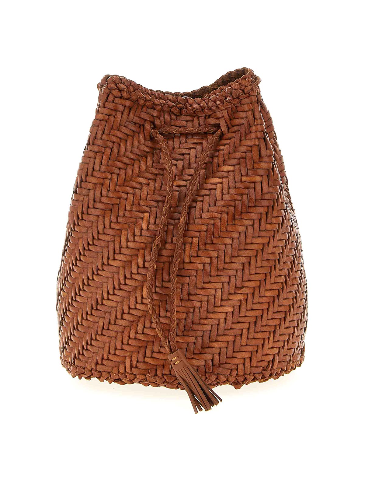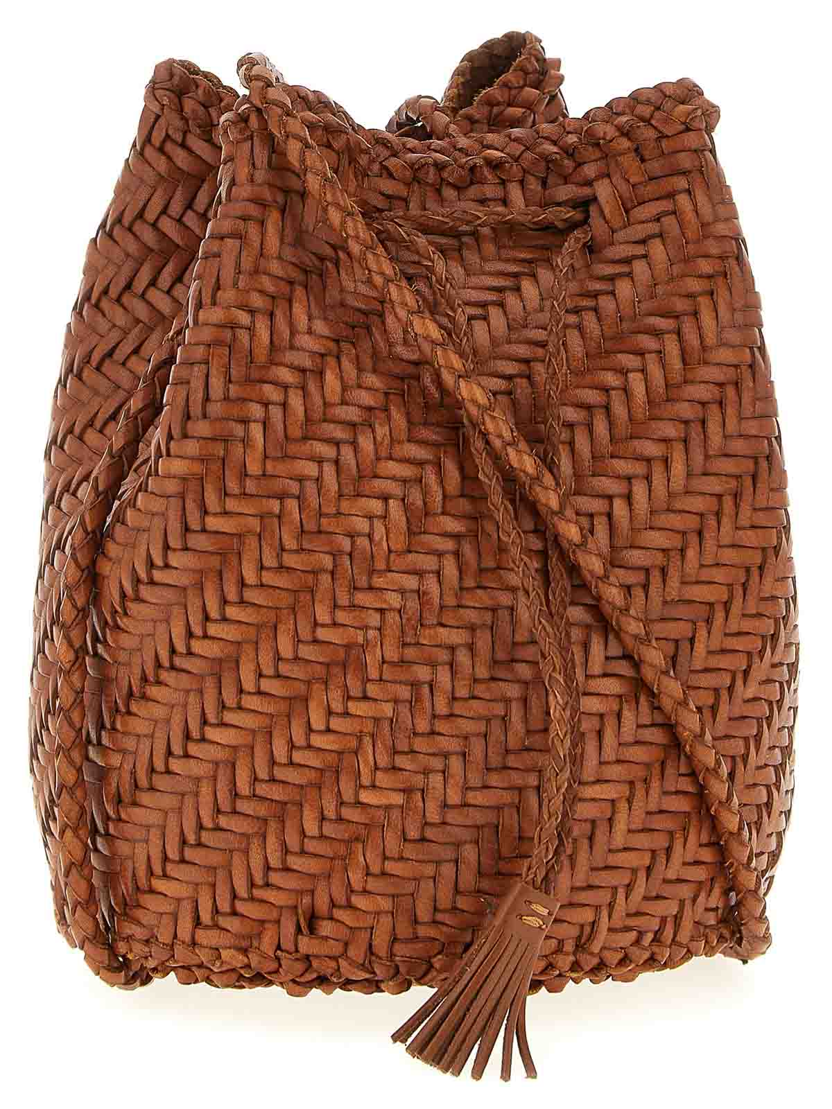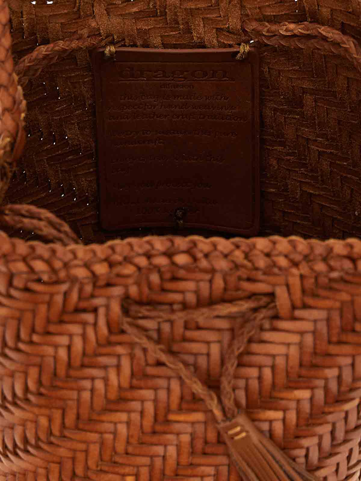 手持ちのポンポンダブルジャンプバケットバッグ。かご編み、裏地のないドローストリングのショルダーストラップ、アンティーク調の聖クリストファーメダルが特徴。旅行者の守護聖人に敬意を表した形をしたペンダントは手作業で縫い付けられており、各バッグの内側にはブランドの信頼の証であるドラゴンディフュージョンが縫い付けられています。
