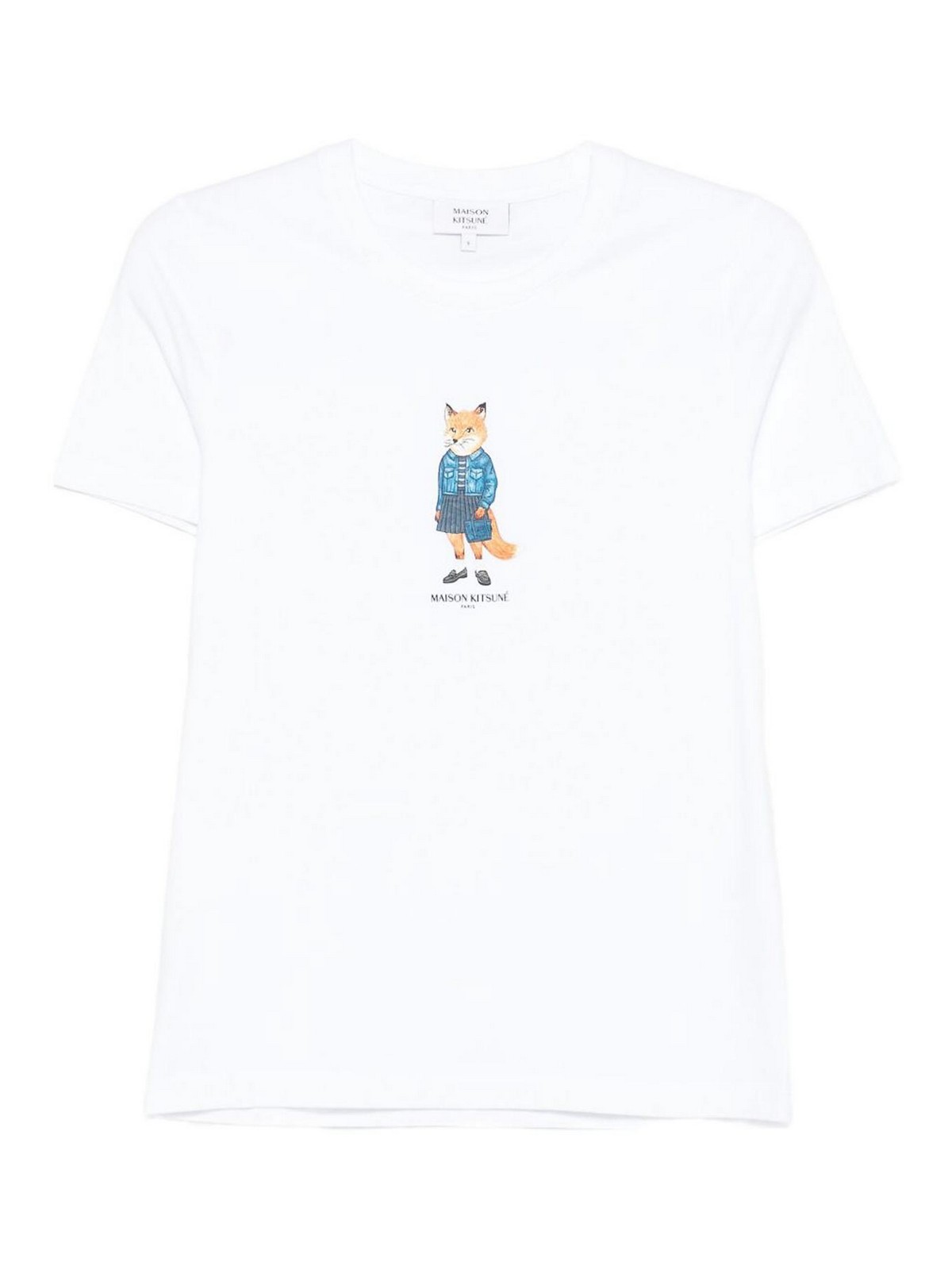 ホワイトコットン生地フォックスグラフィックプリント半袖クルーネックストレートヘム