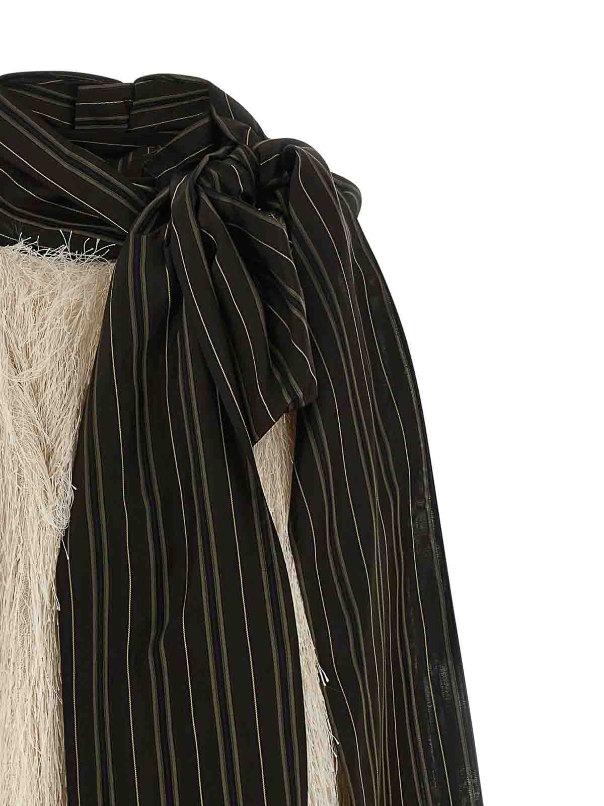 crestaの軽量ファブリックトップ。全体にフリンジ、フロントドレープ、コントラスト生地のラバリールハイネック、フッククロージャー付き、後ろにティアドロップカットアウトのディテールが施されています。ノースリーブで右肩にドレープが付いています。
