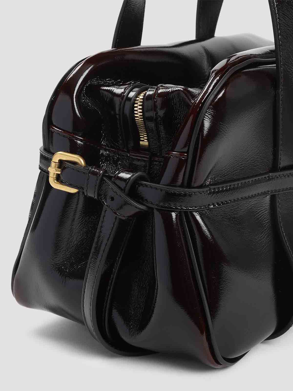Dries van noten ルビーレッドレザーミディアムボウリングショルダーバッグ。レザー&コットン製バッグ、トップショルダーストラップ、トップジッパー、フロントにレタリングロゴ、ゴールドトーンのメタリックバックル付きサイド調節可能なストラップ、メインコンパートメント1つ。