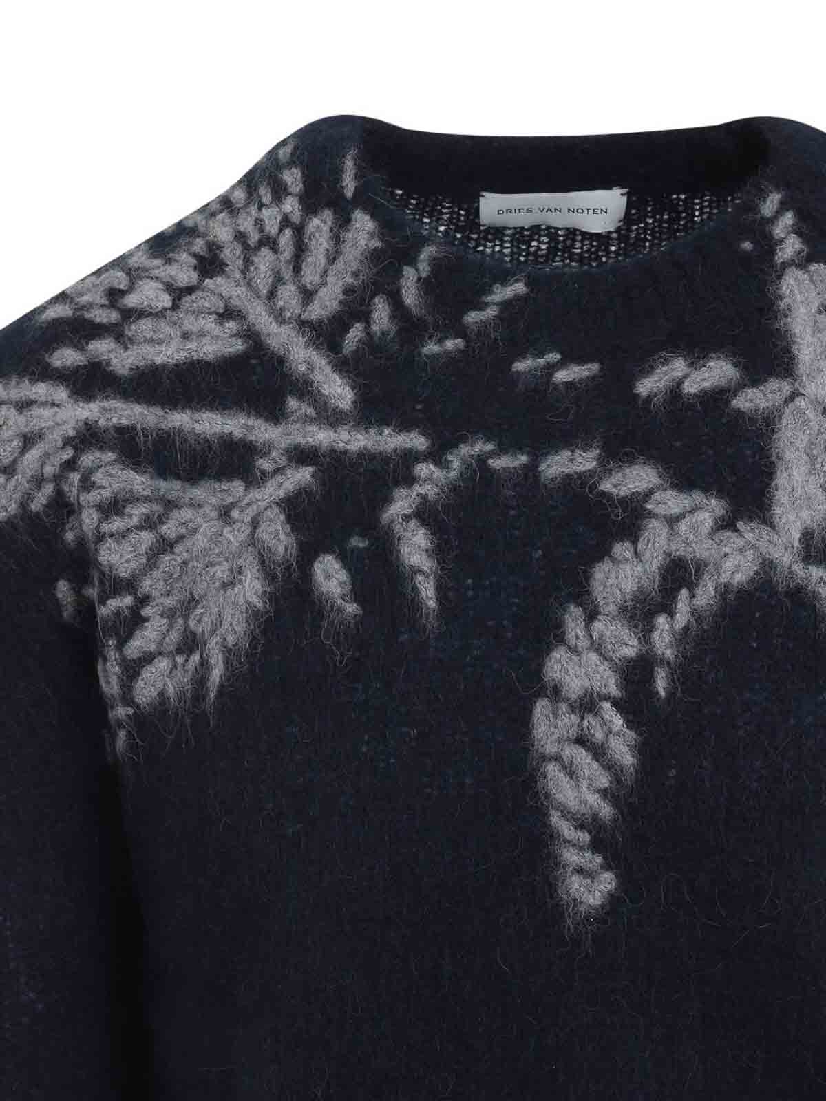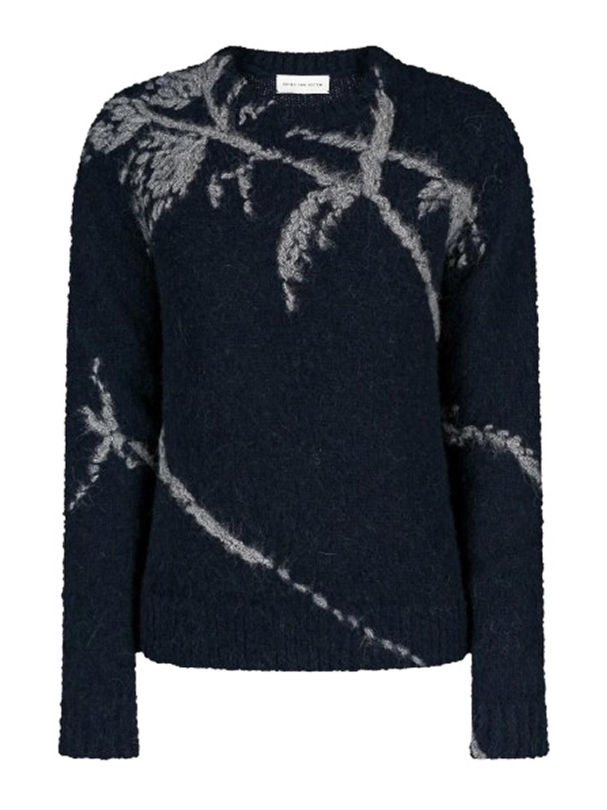 ダークブルーのクルーネックセーター、ロングスリーブ、アネモネプリント