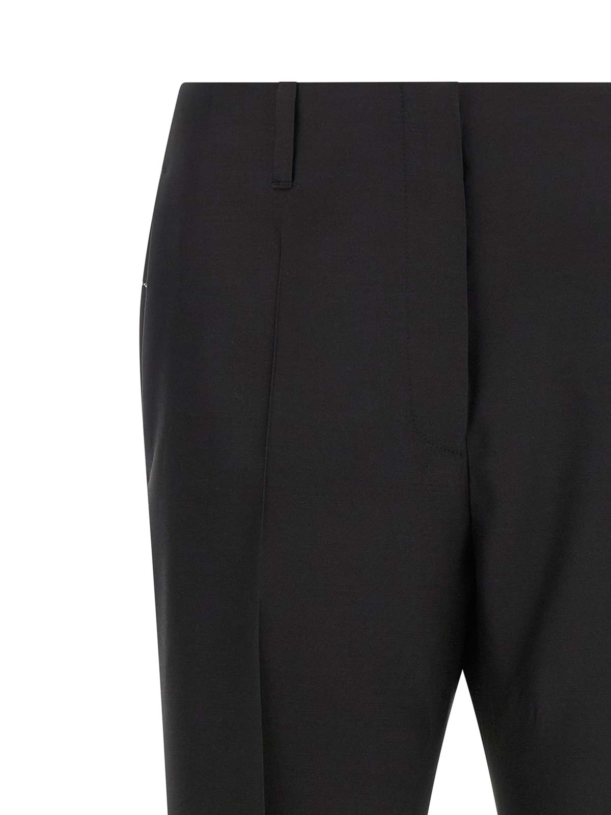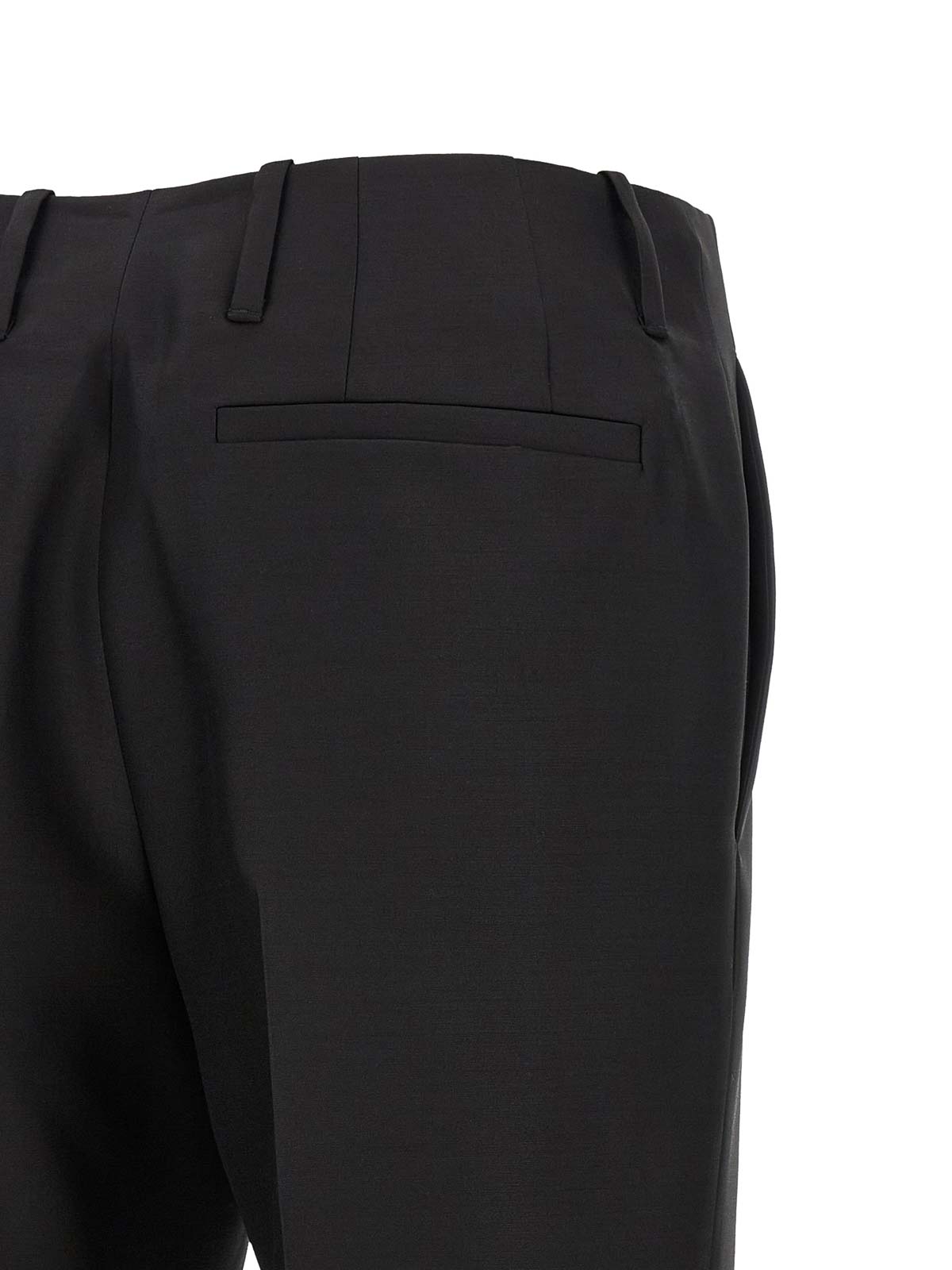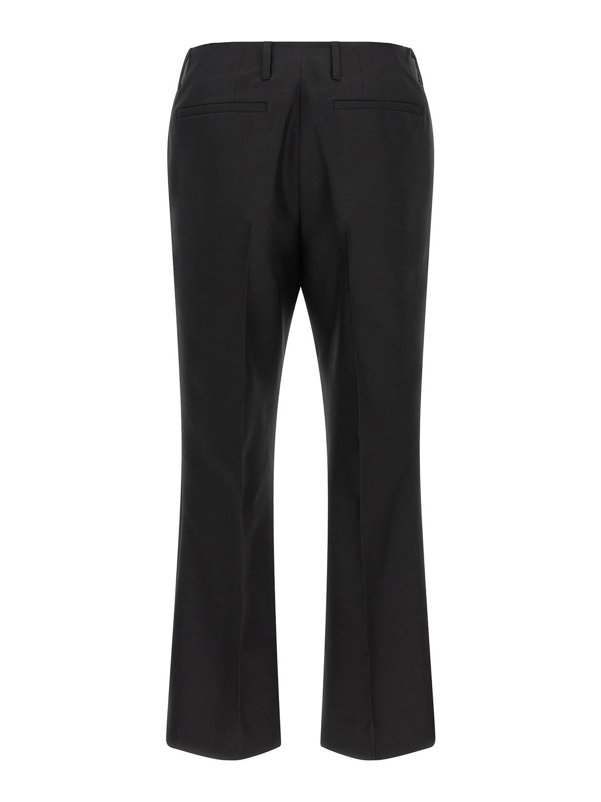 パロマのウールと丸みを帯びたシルクのパンツ、クロップスタイル、テーラードデザイン、フレアレッグ、ストレッチプリーツ、フロントジッパーとボタンクロージャー、フロントフレンチポケット、バックウェルトポケット。