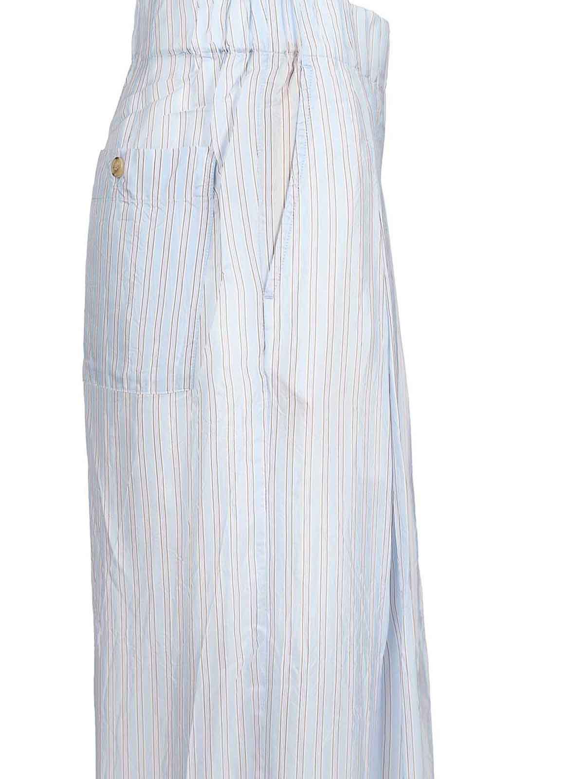 このズボンは、ワイドレッグとストライプ柄が特徴で、ウエストサイドに伸縮性のあるウェルトポケットと後ろにボタン付きのパッチポケットが付いています。