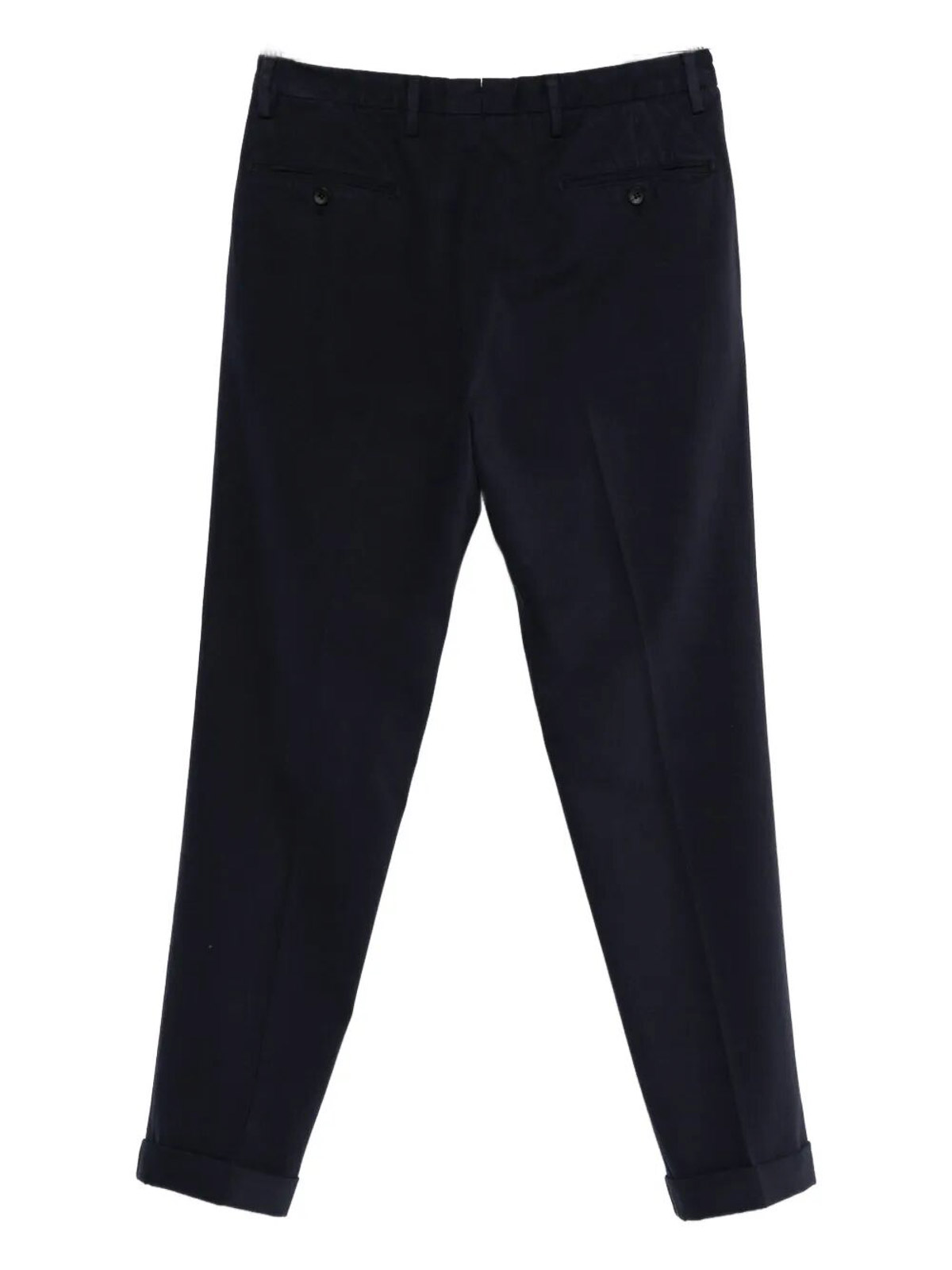 ネイビーブルーにプリーツ、カフ付きエッジ、ボタン留め、フロントポケット、ウェルトポケット。