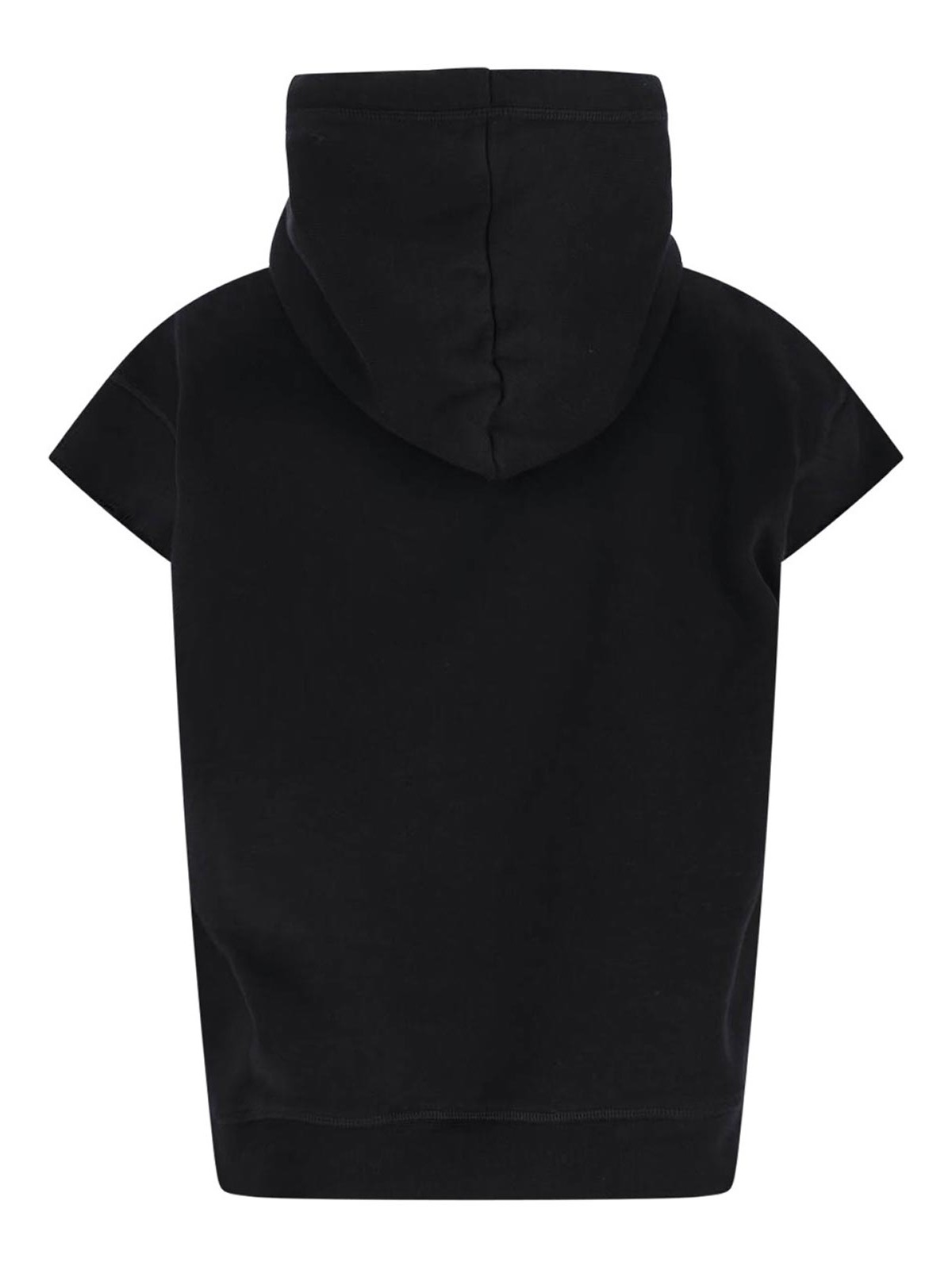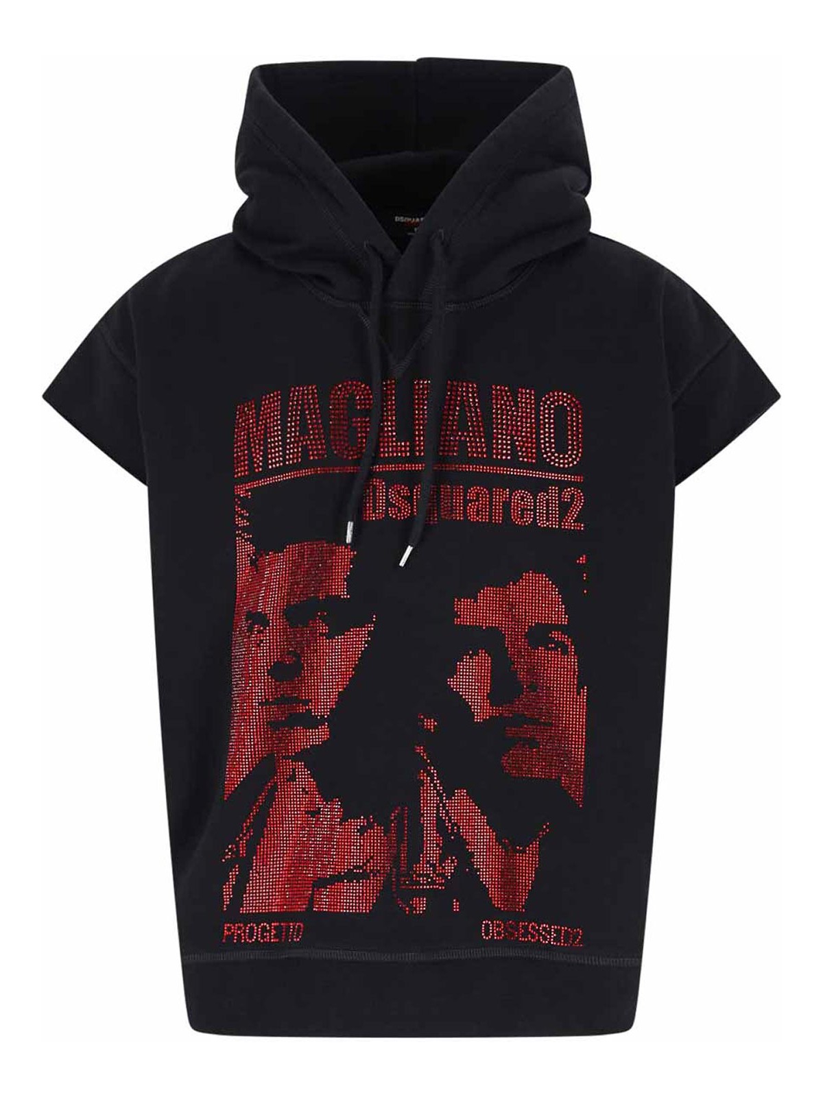 Dsquared x Maglianoラインストーンスウェットシャツ、ブラックコットン、ドローストリングフード、半袖、マキシレッドのラインストーンロゴ、ストレートヘム。