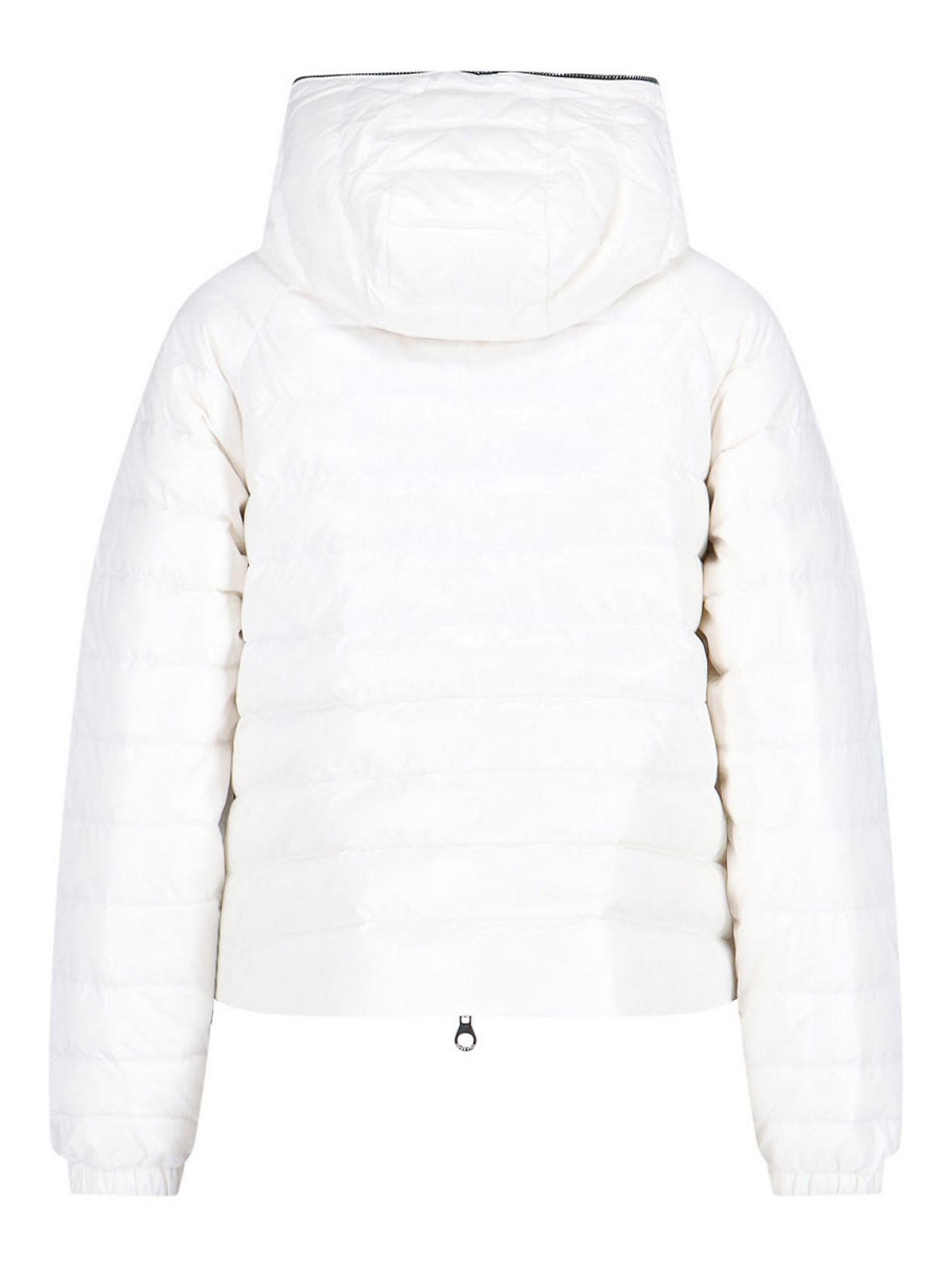 白い羽毛布団付きフード付きダウンジャケット、ハイカラー、ジッパー、胸にロゴパッチ、フロントジッパーポケット2つ、調節可能なサイドパネル、ストレートヘム
