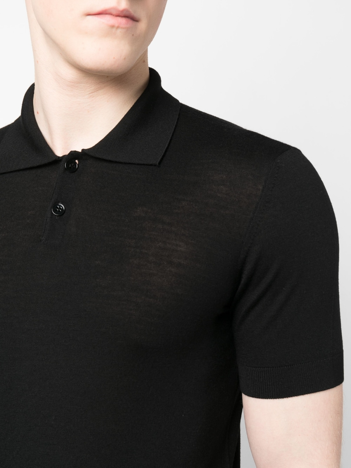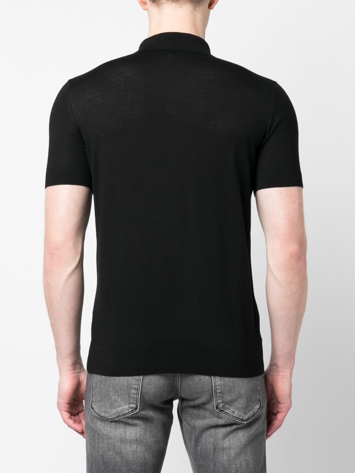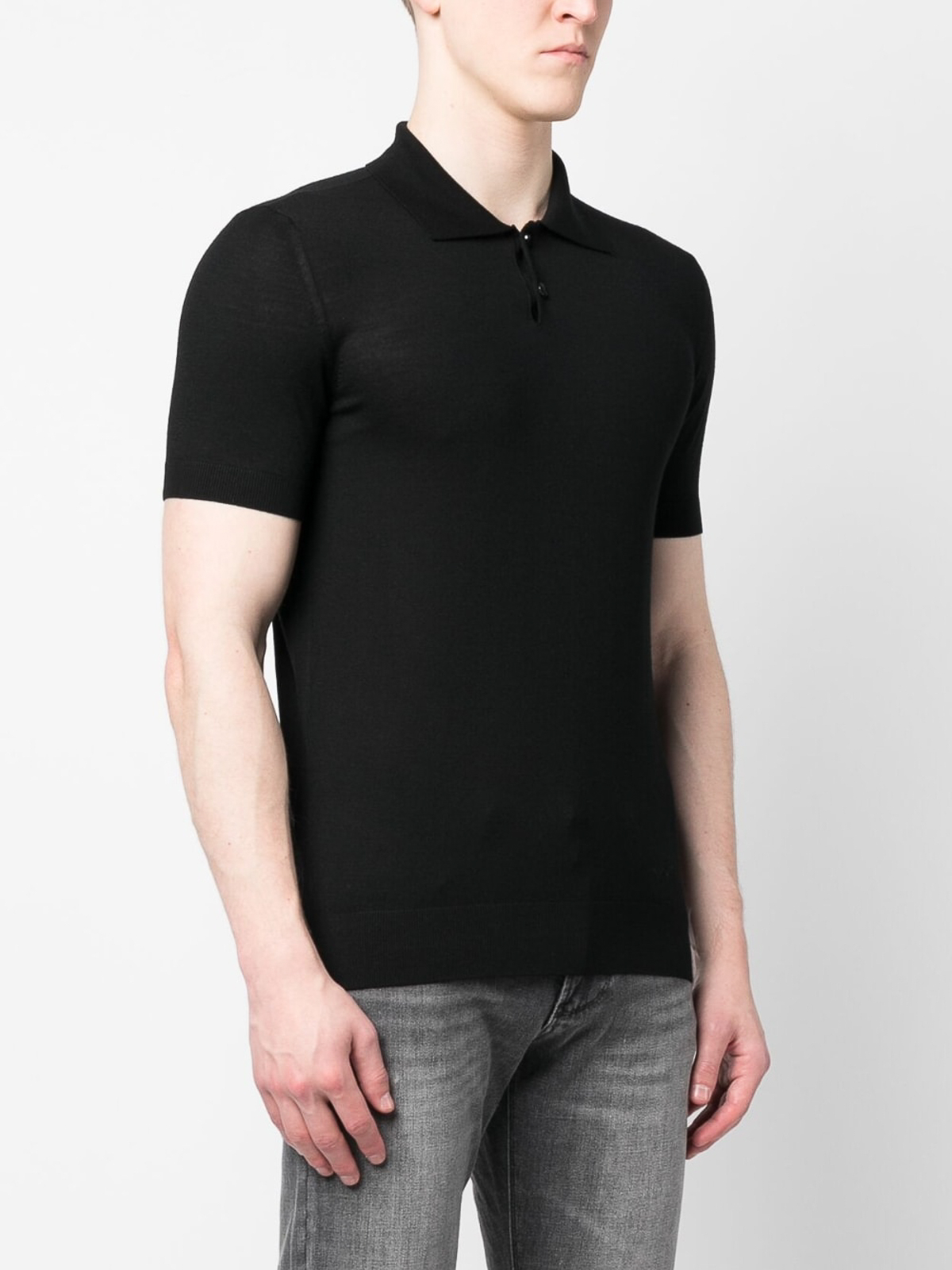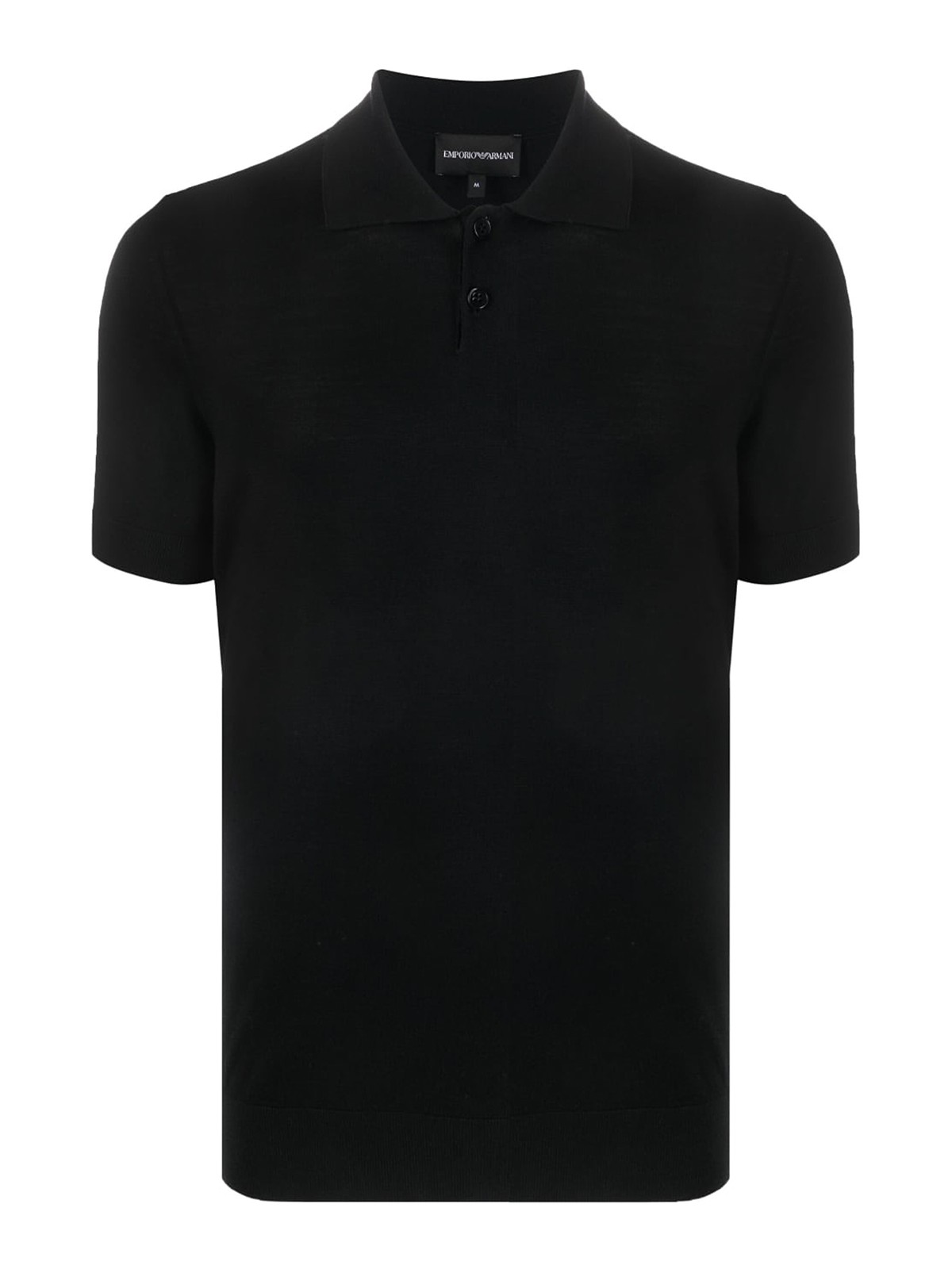 emporio Armaniのバージンウールポロシャツは、黒のバージンウールポロカラー、フロントボタンプラケット、半袖、リブ編みの袖口とヘム、ストレートレッグが特徴です。