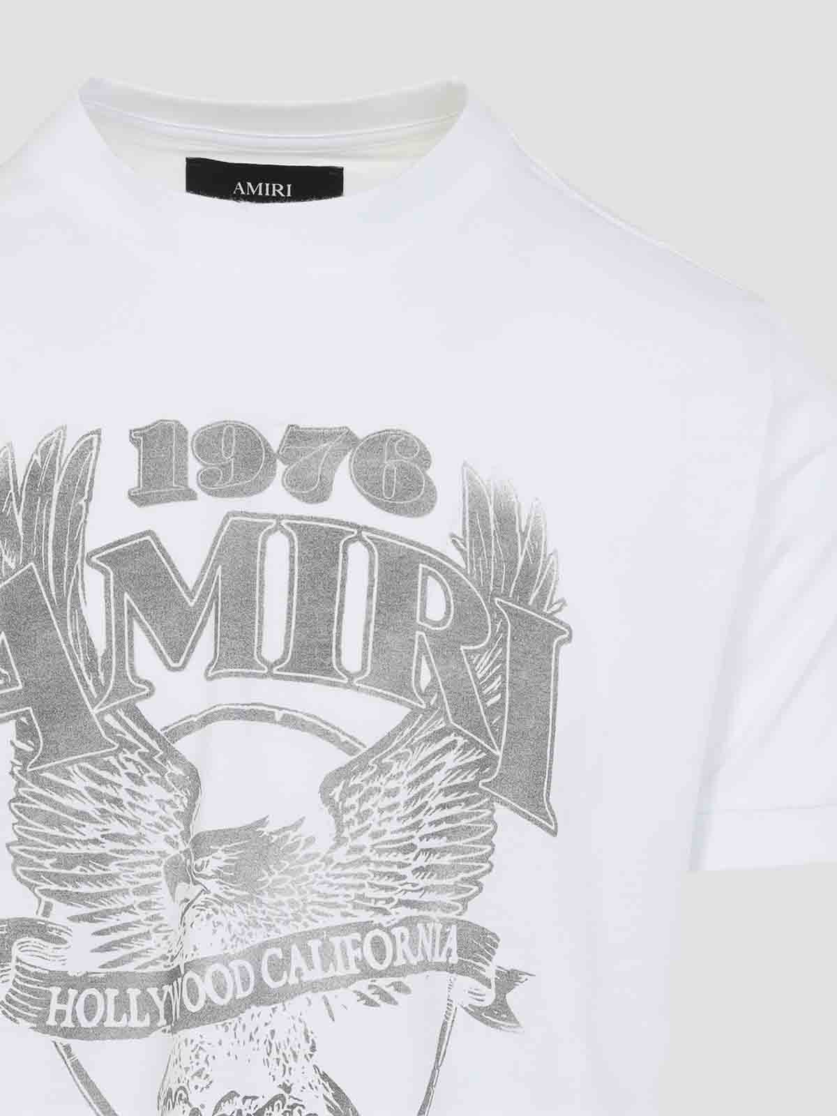 アミリホワイトコットンイーグルTシャツ。ピュアホワイトコットンTシャツ、ラウンドネック、ロゴ入りフロントグレーデザイン、半袖、ストレートヘム。