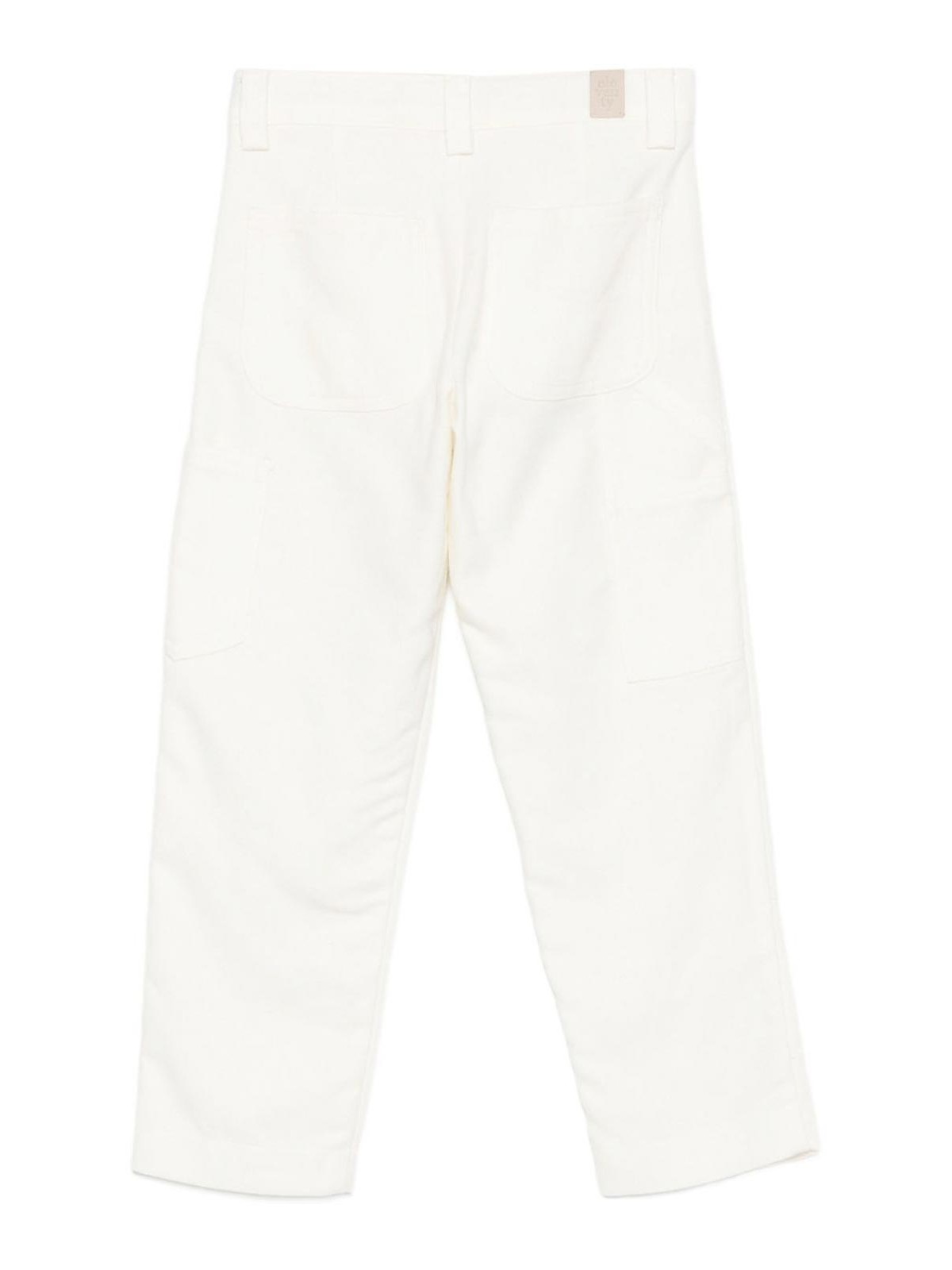 クリーム色のボタンと後ろにパッチポケットが付いたウールパンツ