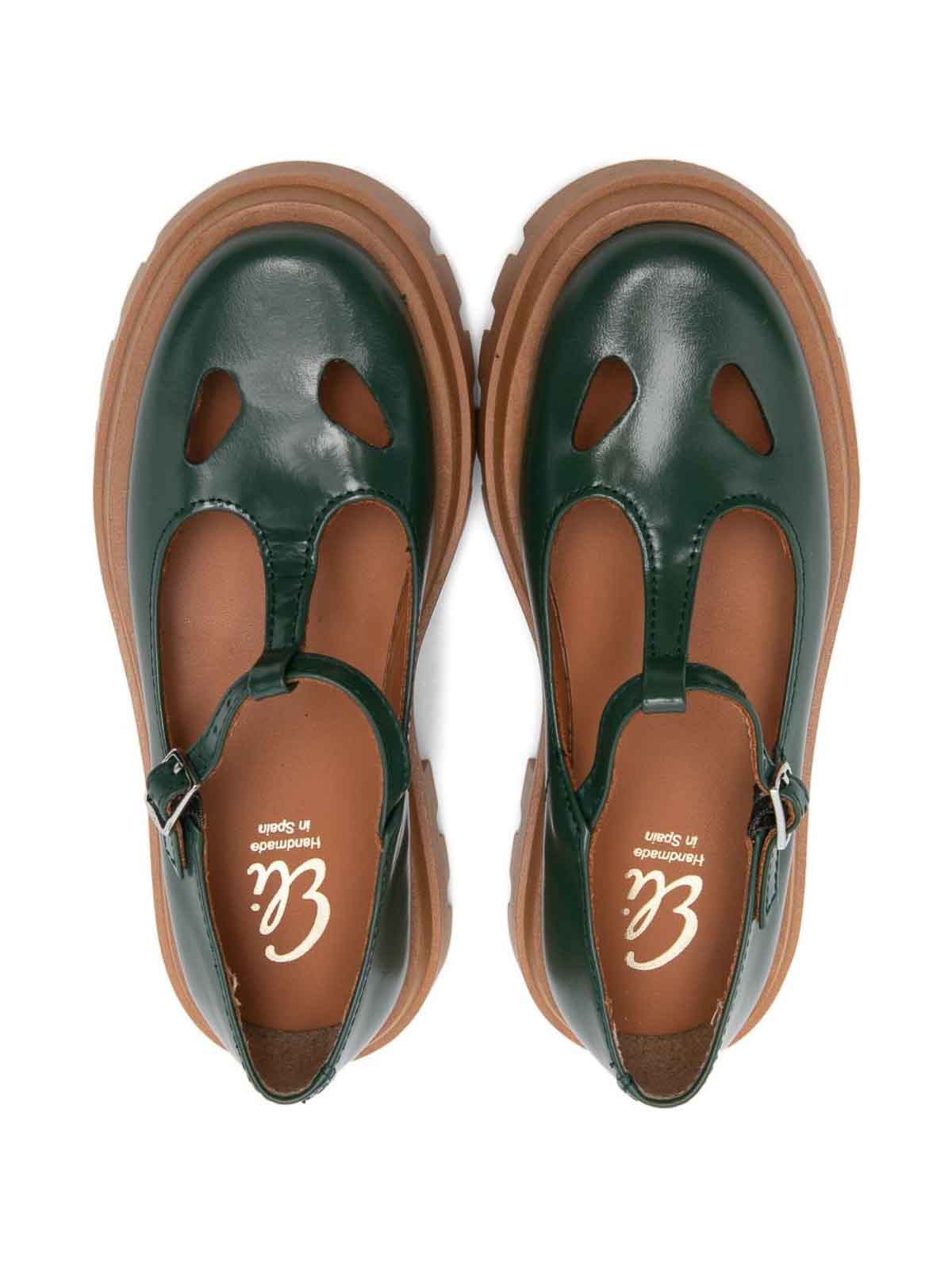 チャンキーフラットは、アイレット付きのラグバックルが付いたグリーンのTストラップが特徴です