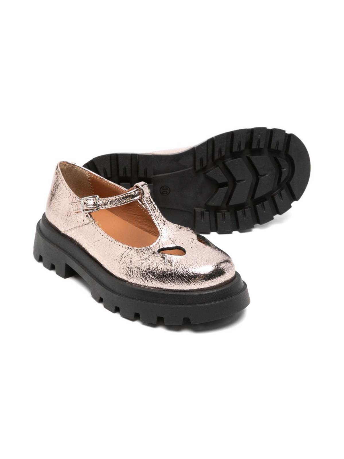 チャンキーフラットは、アイレット付きのラグバックルが付いたピンクのTストラップが特徴です