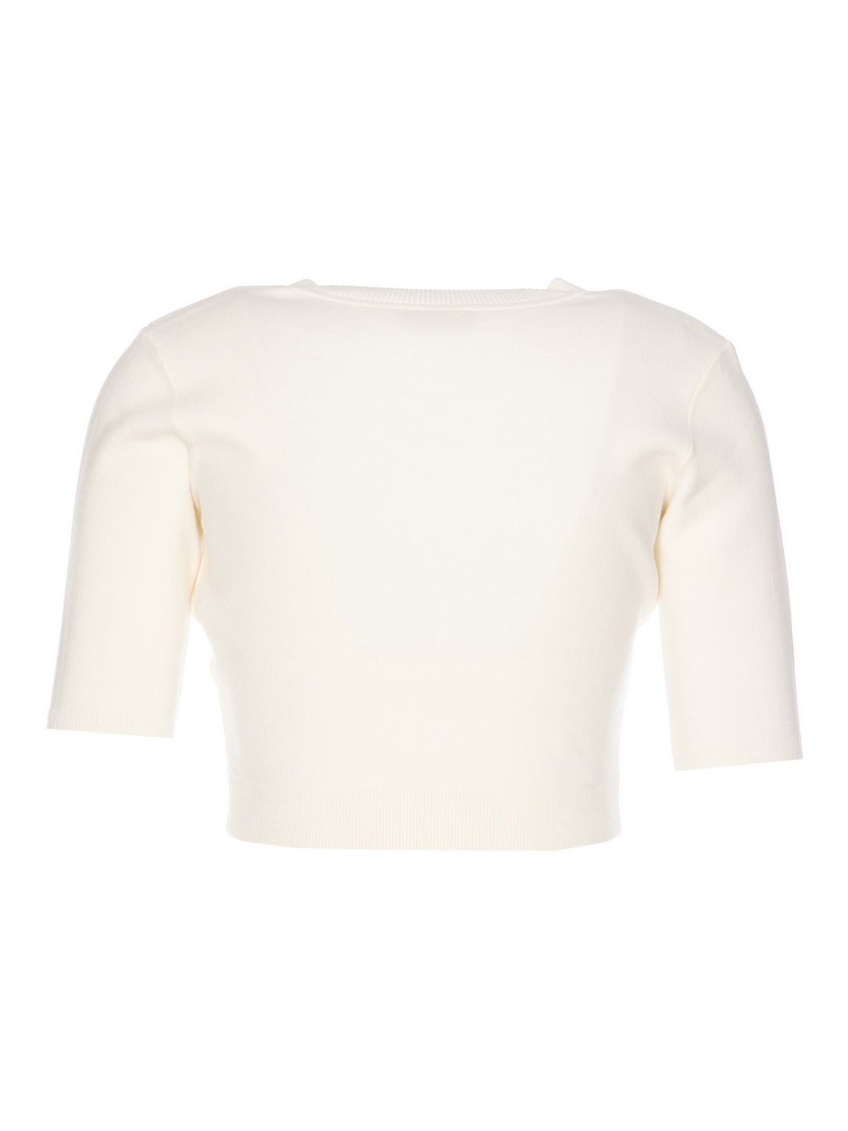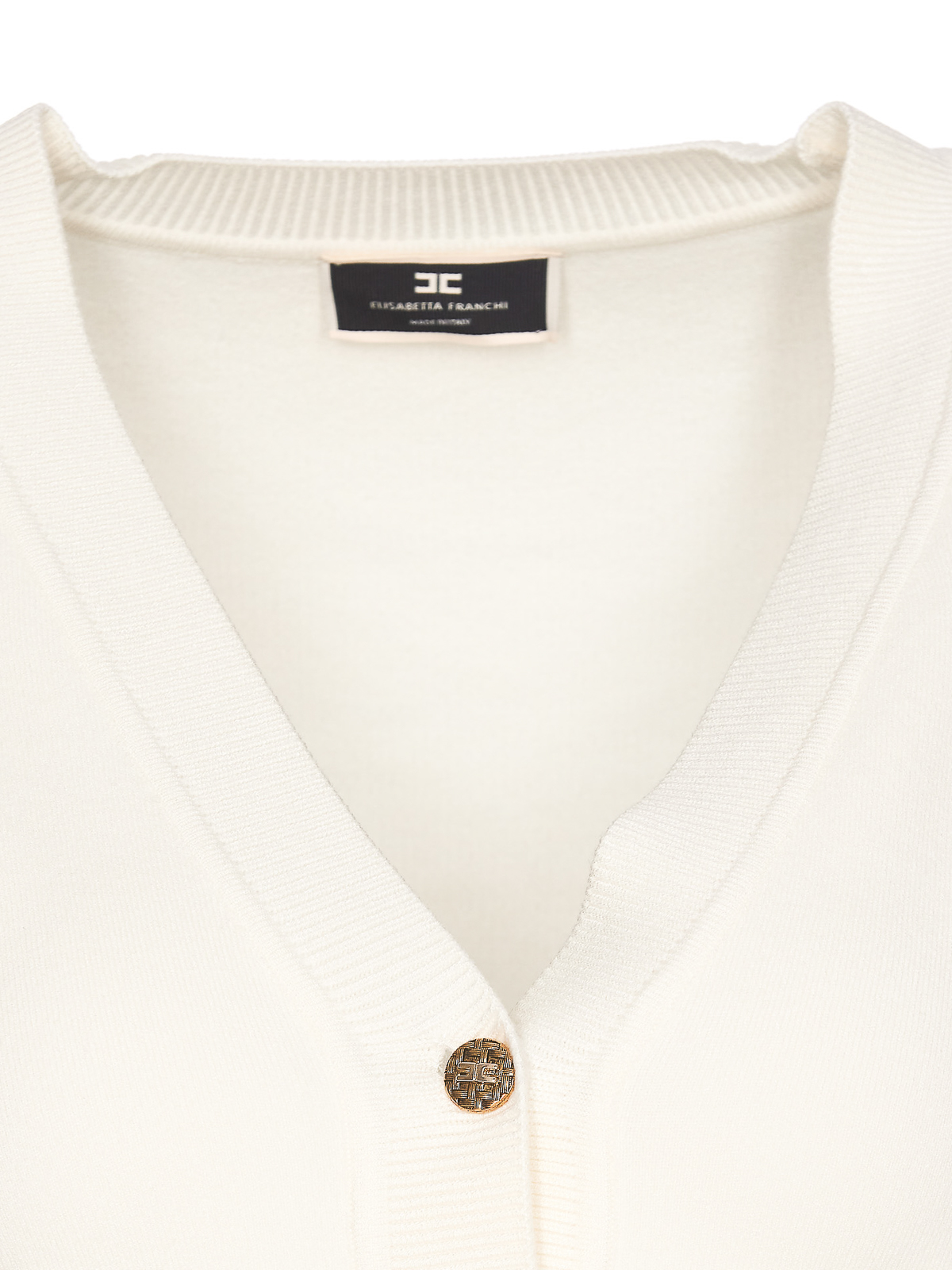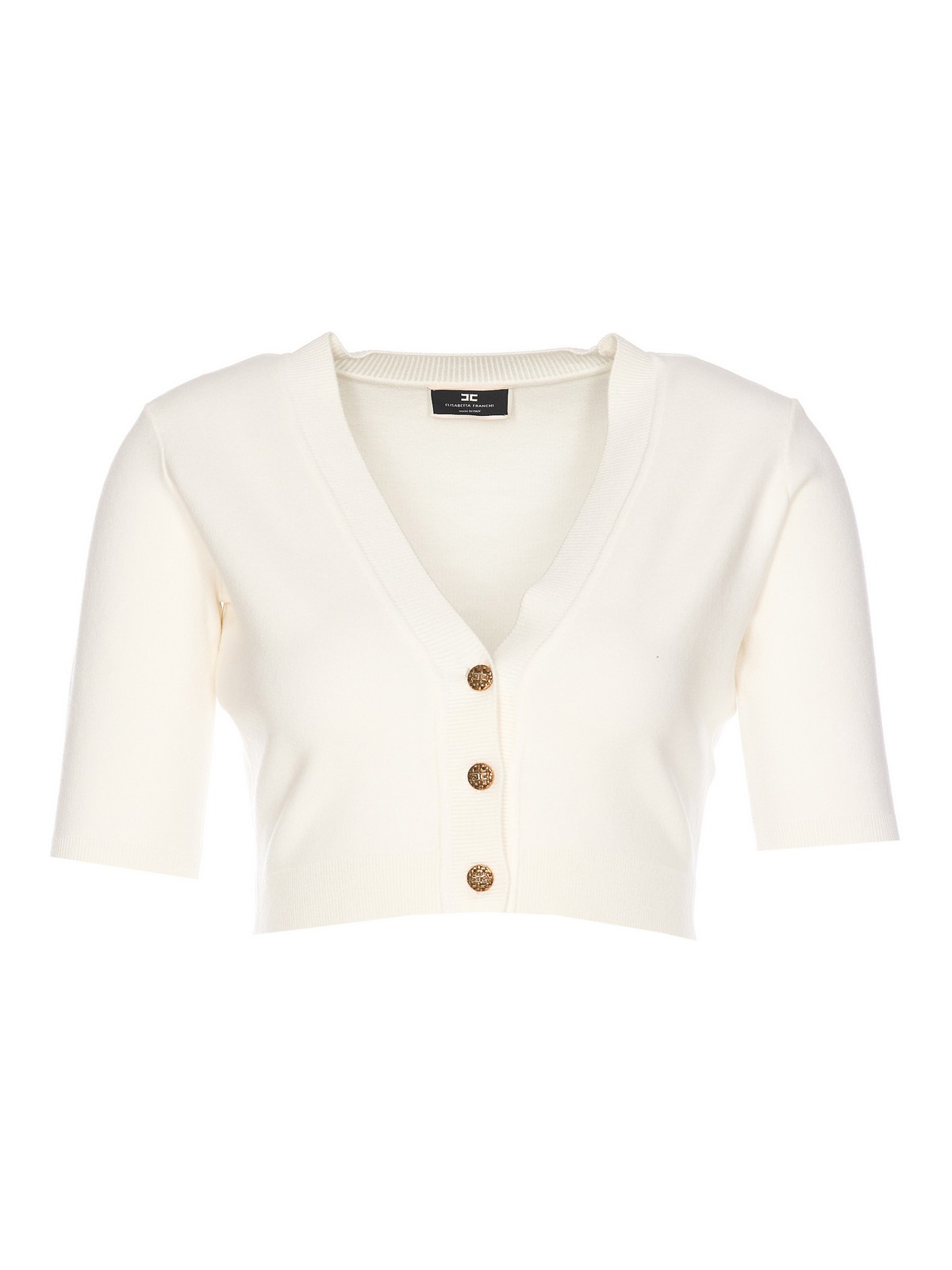 Elisabetta franchi ホワイトニットクロップカーディガン、前面にロゴボタン留め Vネック 3/4スリーブ