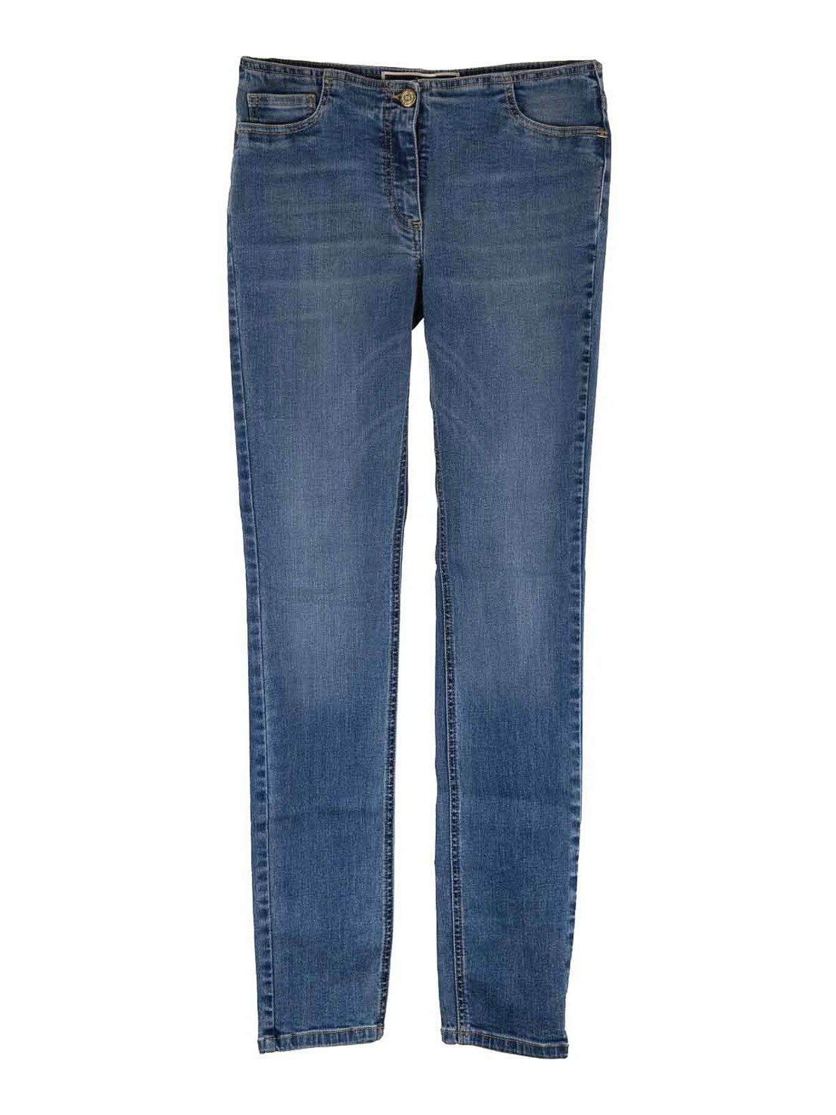 エリザベッタ・フランキのサイン入りレディースジーンズ。メインファブリックは 97% コットン、3% ポリアミド製です。ポケットの裏地はポリエステル 65%、コットン 35% 製です。前面にサイドポケットが付いたジーンズ。後者には封筒にミニポケットが付いています。後部エンベロープポケット。エンベロープポケットのひとつには、ゴールドメタルのロゴ金具があしらわれています。ヒンジとボタンで閉じます。イタリア製。