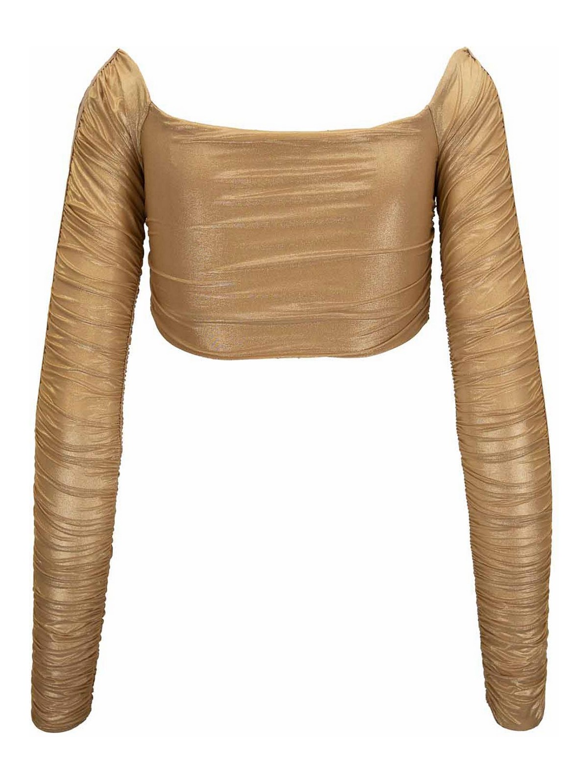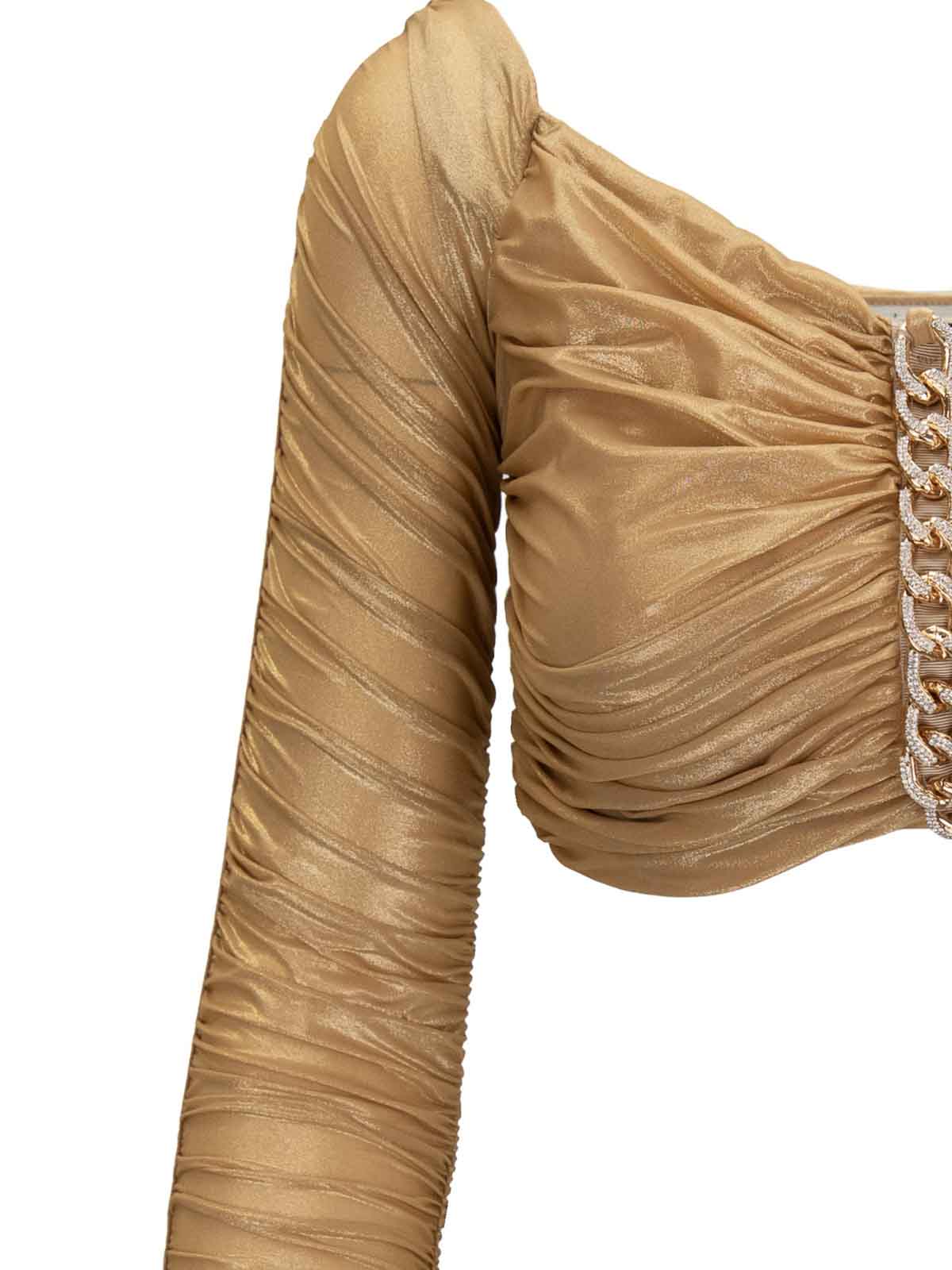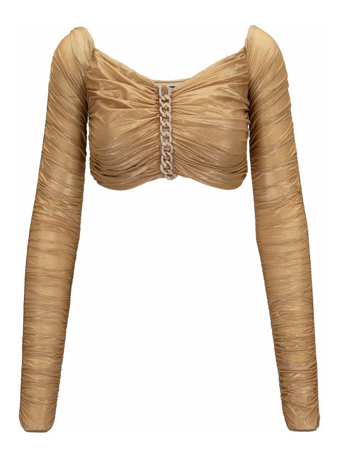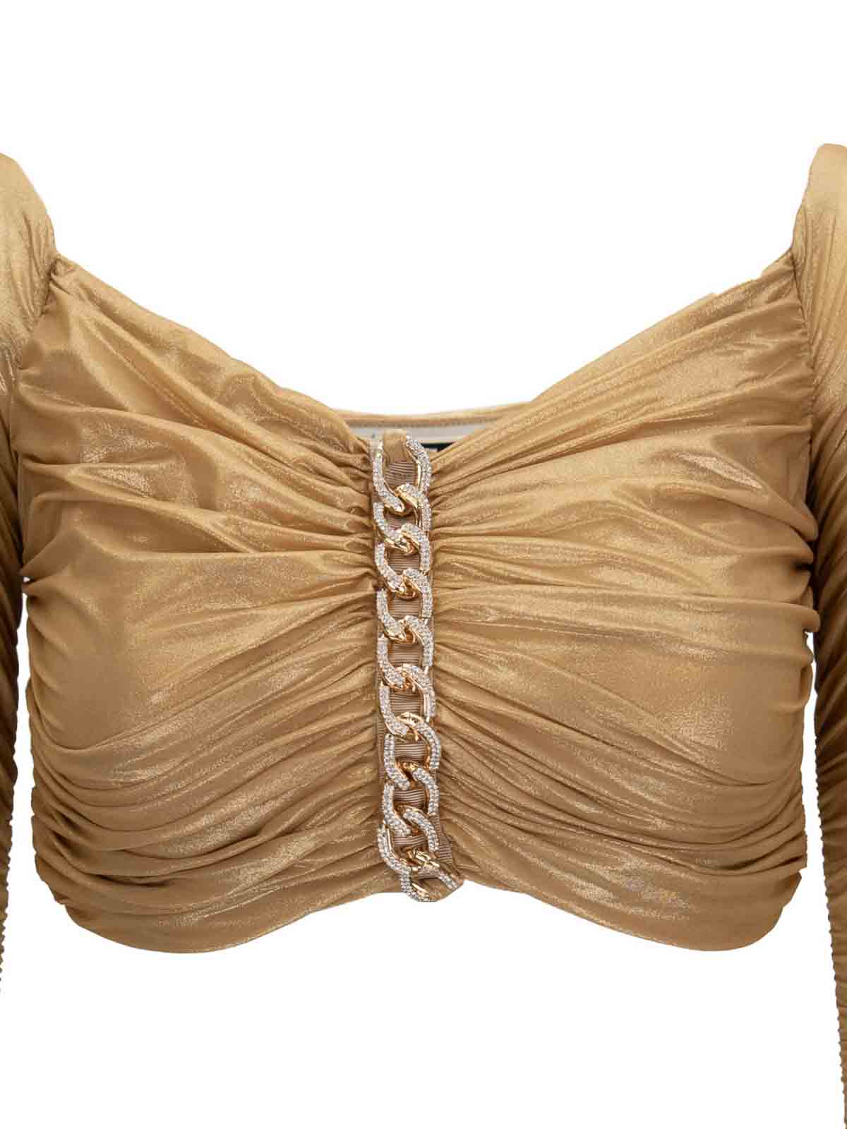 エリザベッタ・フランキの女性用トップサイン入り。メインの生地とベルトは 77% がポリアミド、23% がエラスタン製です。スクエアネックラインのロングスリーブのトップ。カールしたディテールが特徴の表裏地。中央のディテールはゴールドカラーのメタル製で、ストーン/ブリリアントで装飾されています。イタリア製。