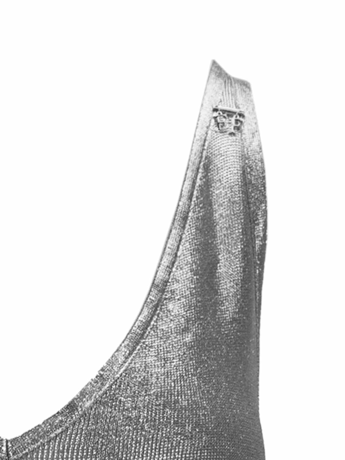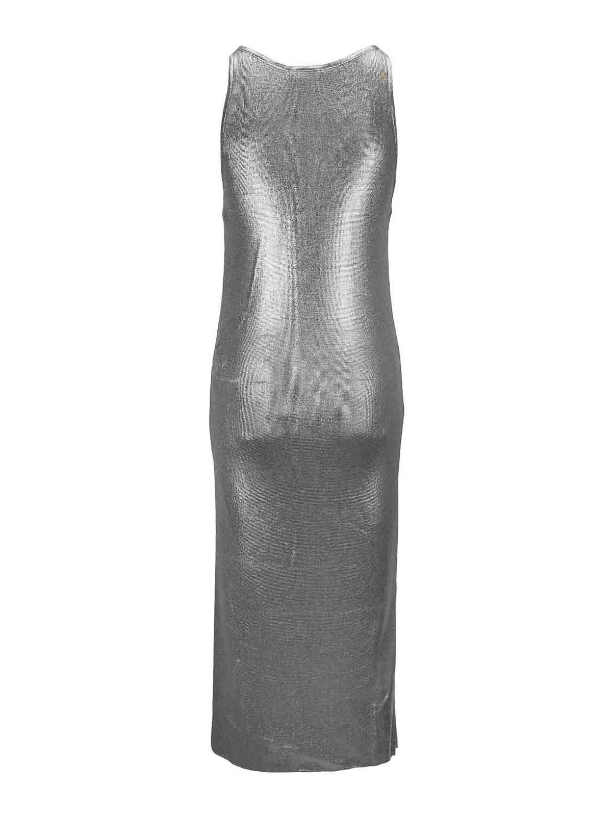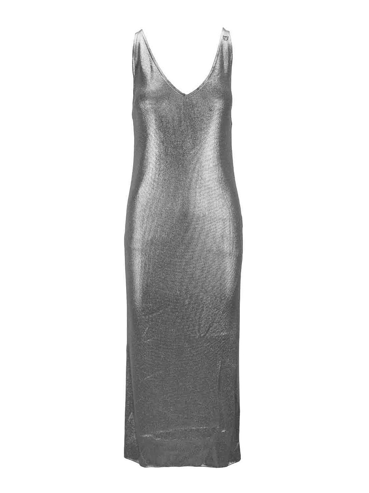 エリザベッタフランキの女性用ドレス。生地は100%ビスコース製。前面にVネックのロングドレス。前面は空いています。外側の表面はキラキラ。スカートの下部には横スリットが入っています。2本のストラップのうち1本には、シルバーカラーの金属製のロゴペンダントが付いています。イタリア製。