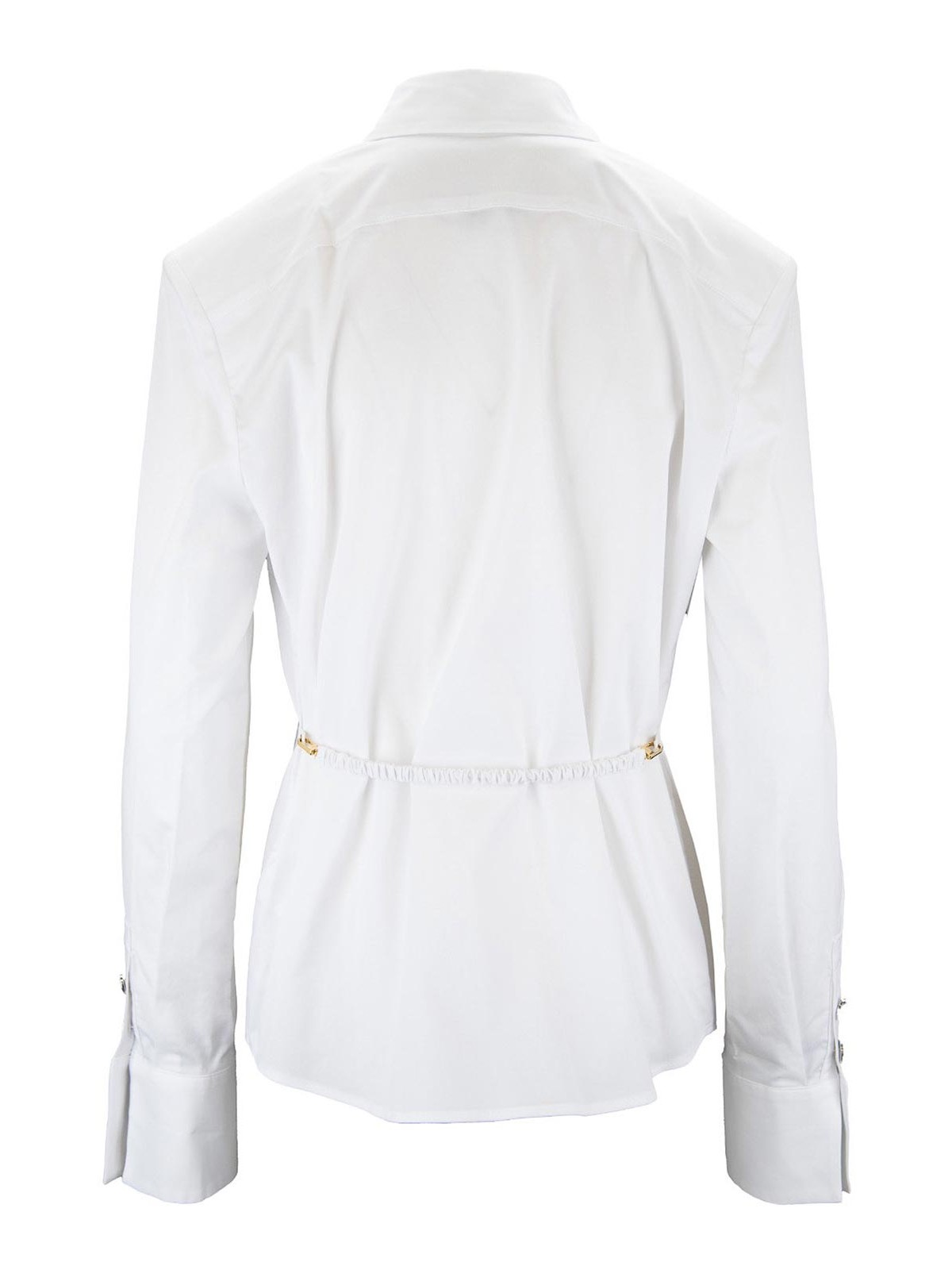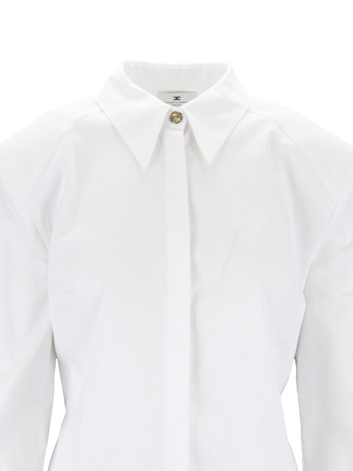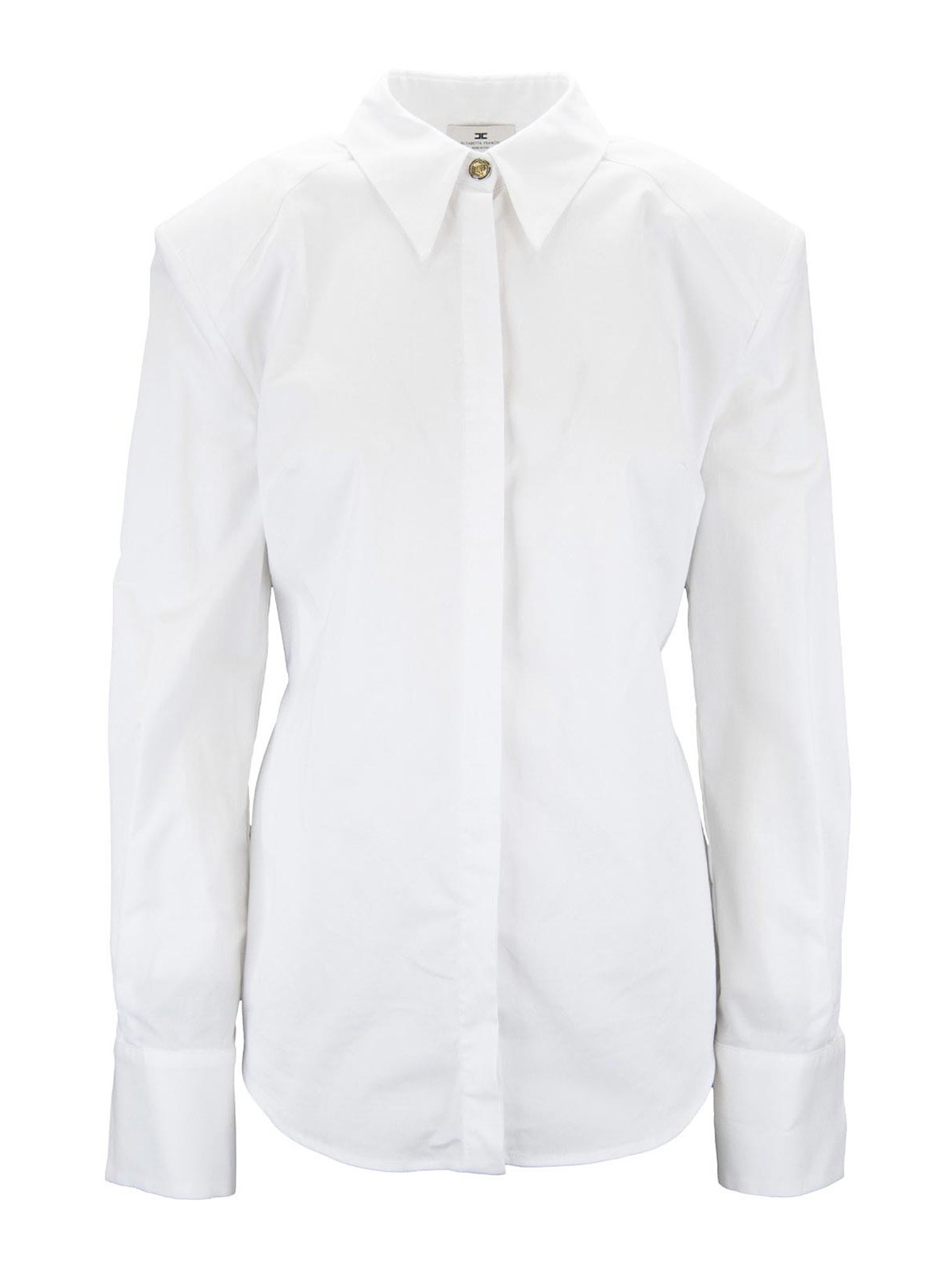 エリザベッタ・フランキのサイン入りレディースシャツ。生地は 69% コットン、25% リヨセル、6% エラスタン製。長袖のクラシックカラーシャツ。後者は中央の高さのロゴで留められています。背面にはフックで取り外し可能なアクセサリーが付いています。内側に肩幅を広げました。ボタンで閉じます。イタリア製。